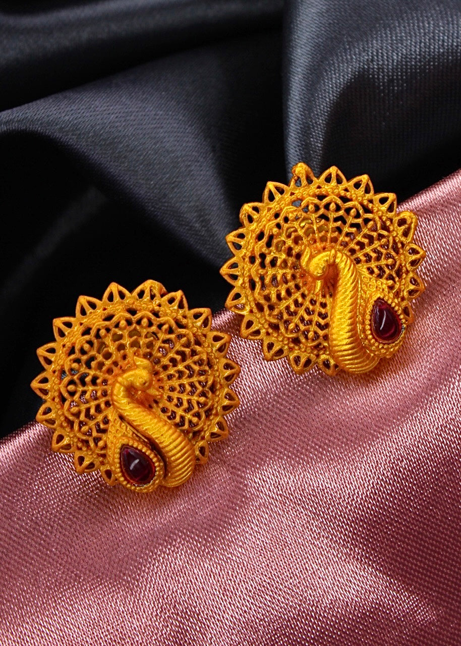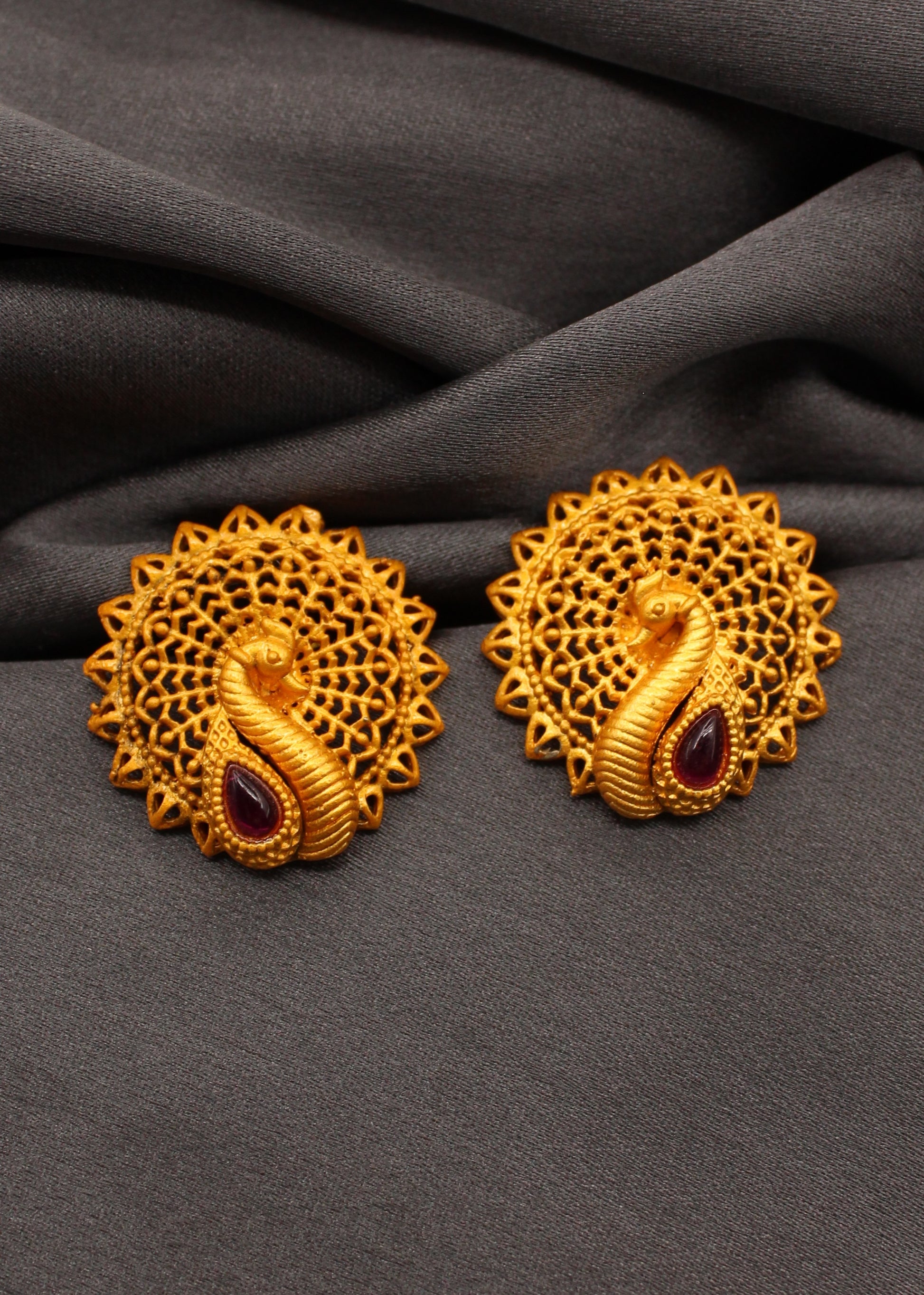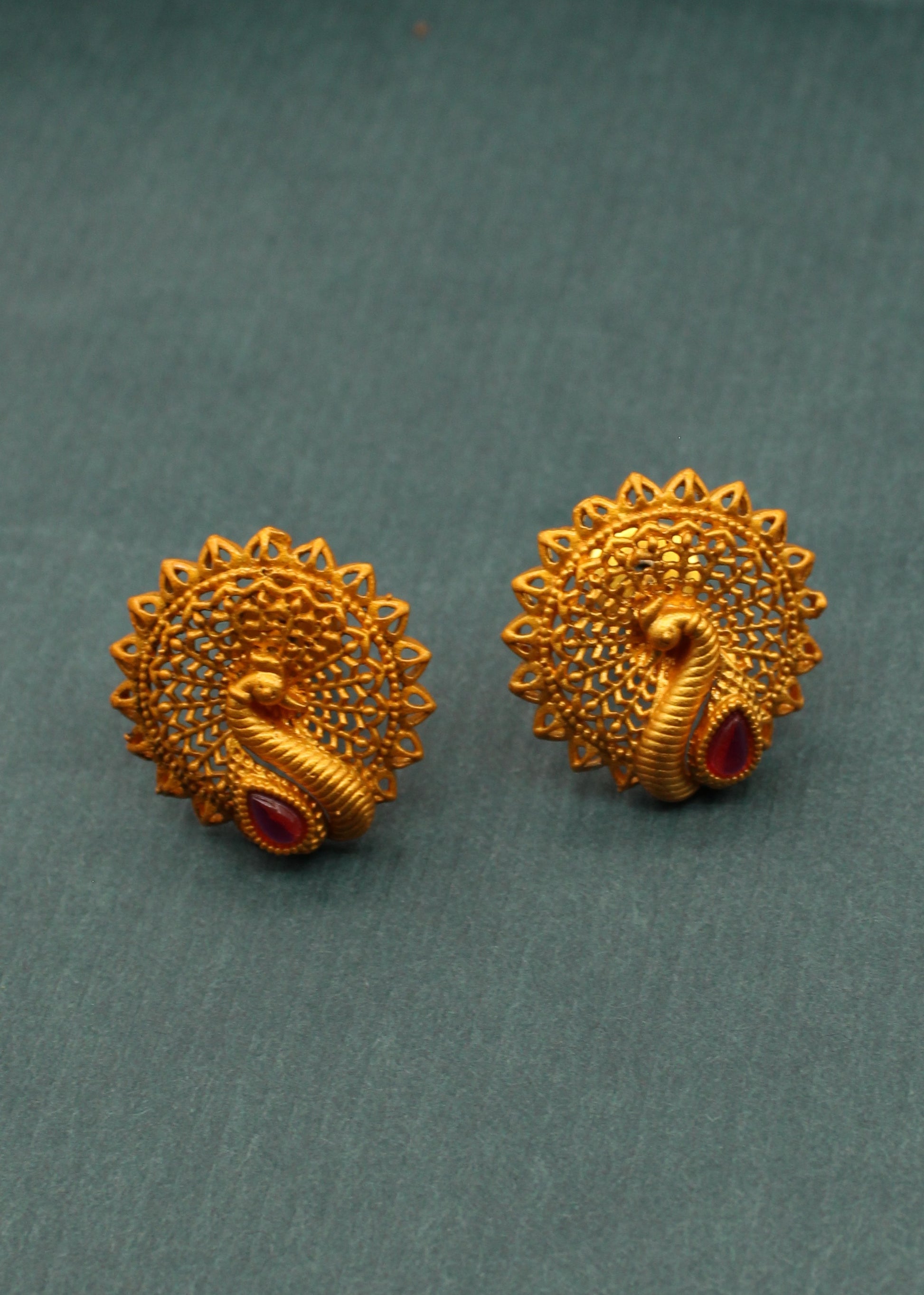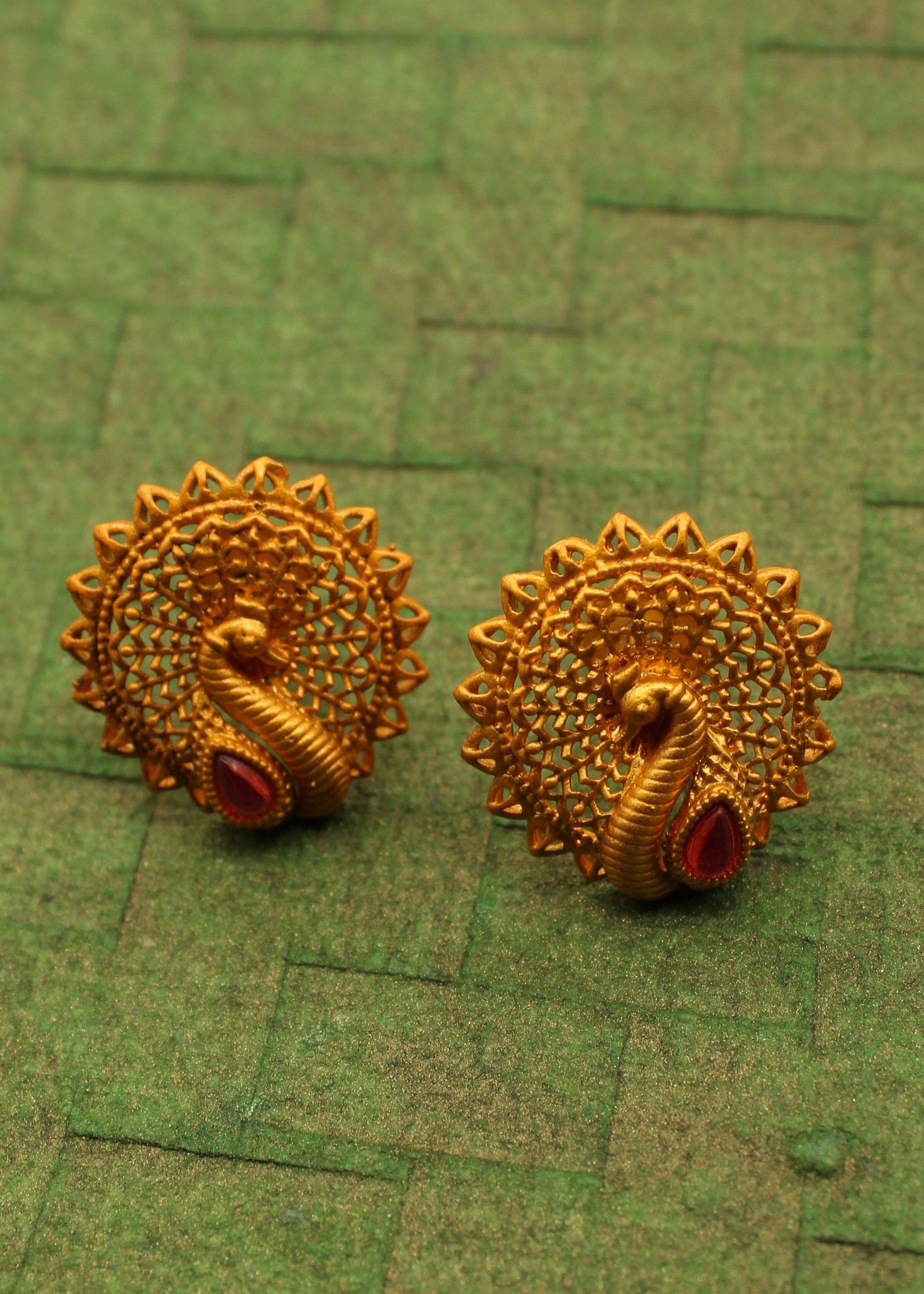 Add a stylish twist to your person by clubbing this pair of Pink stone studs with your festive ethnic costume. They are wonderful crafted with matt gold finish alone with Peacock design.