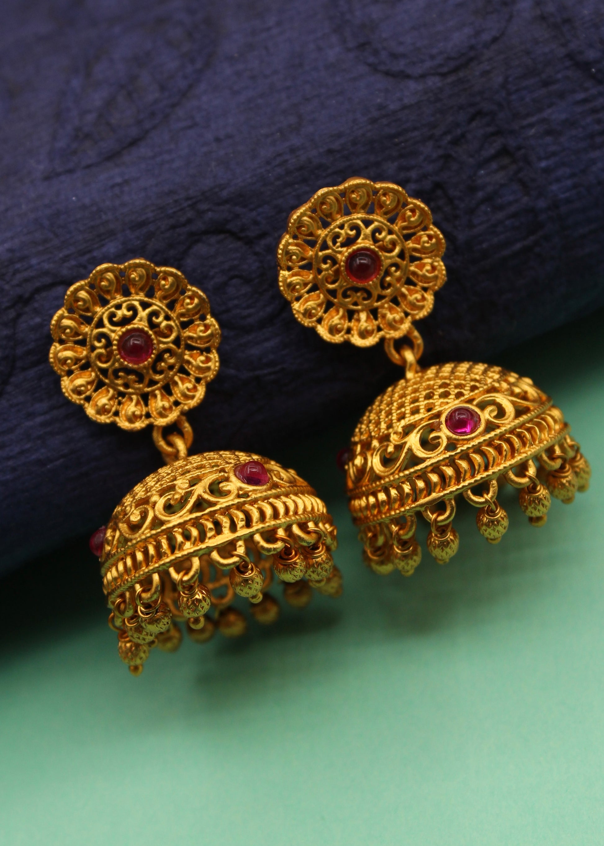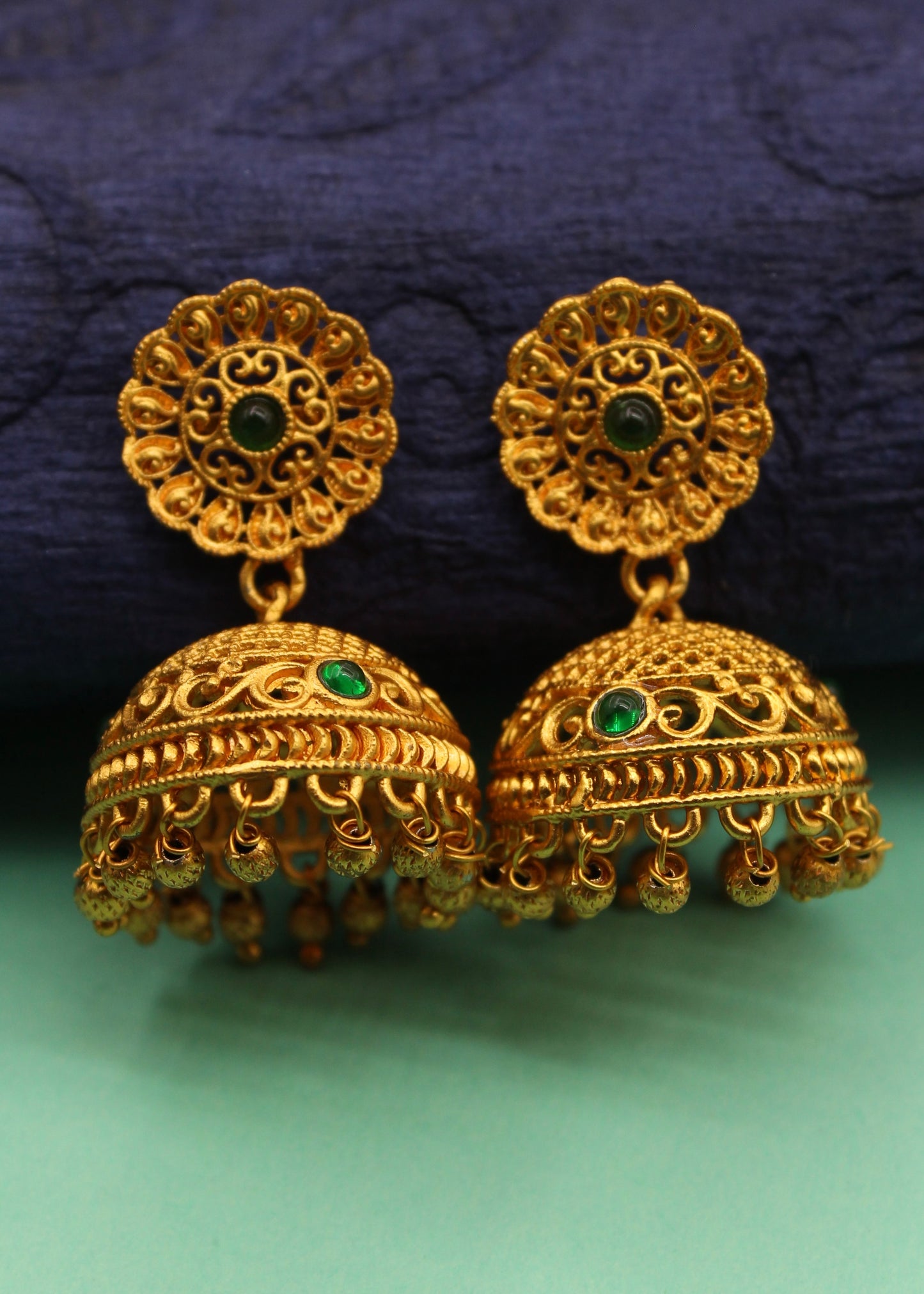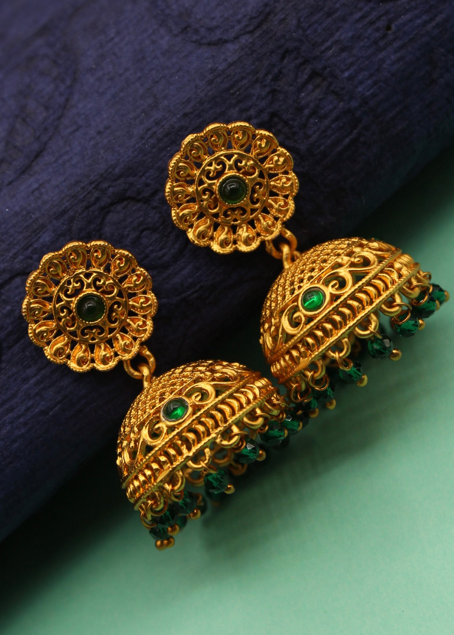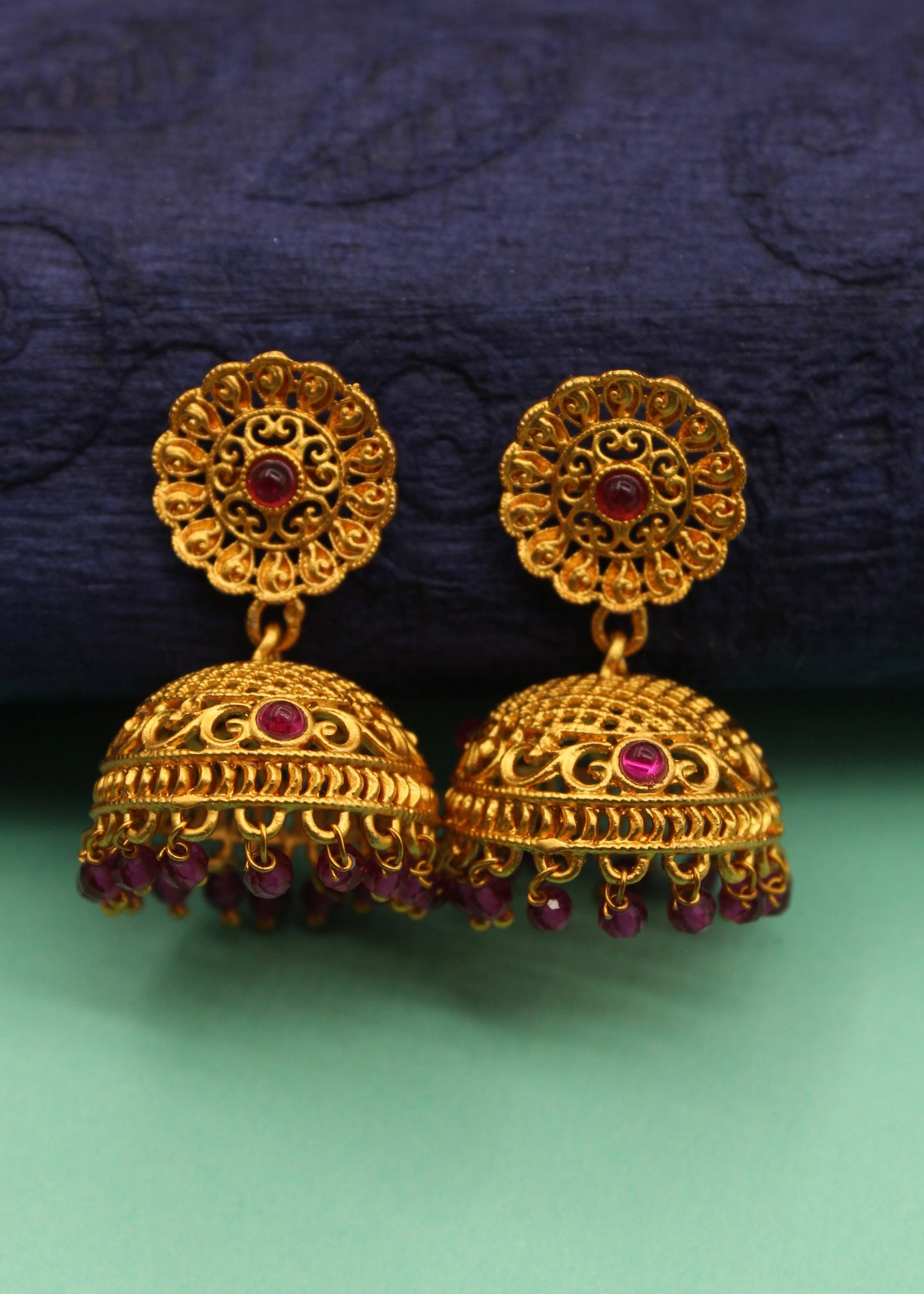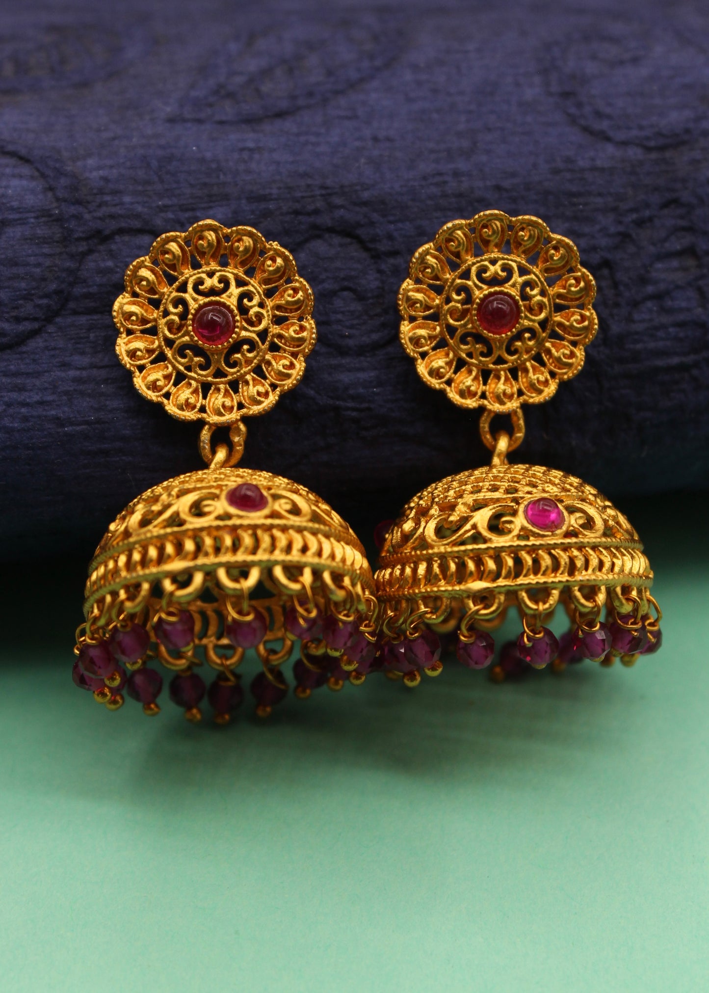 Get that perfect look by clubbing this appealing pair of jhumki earrings with your ethnic costume. It is studded with pink, green stone and crafted from matte gold finish metal. These jhumki earrings have beads droplets for added attraction.