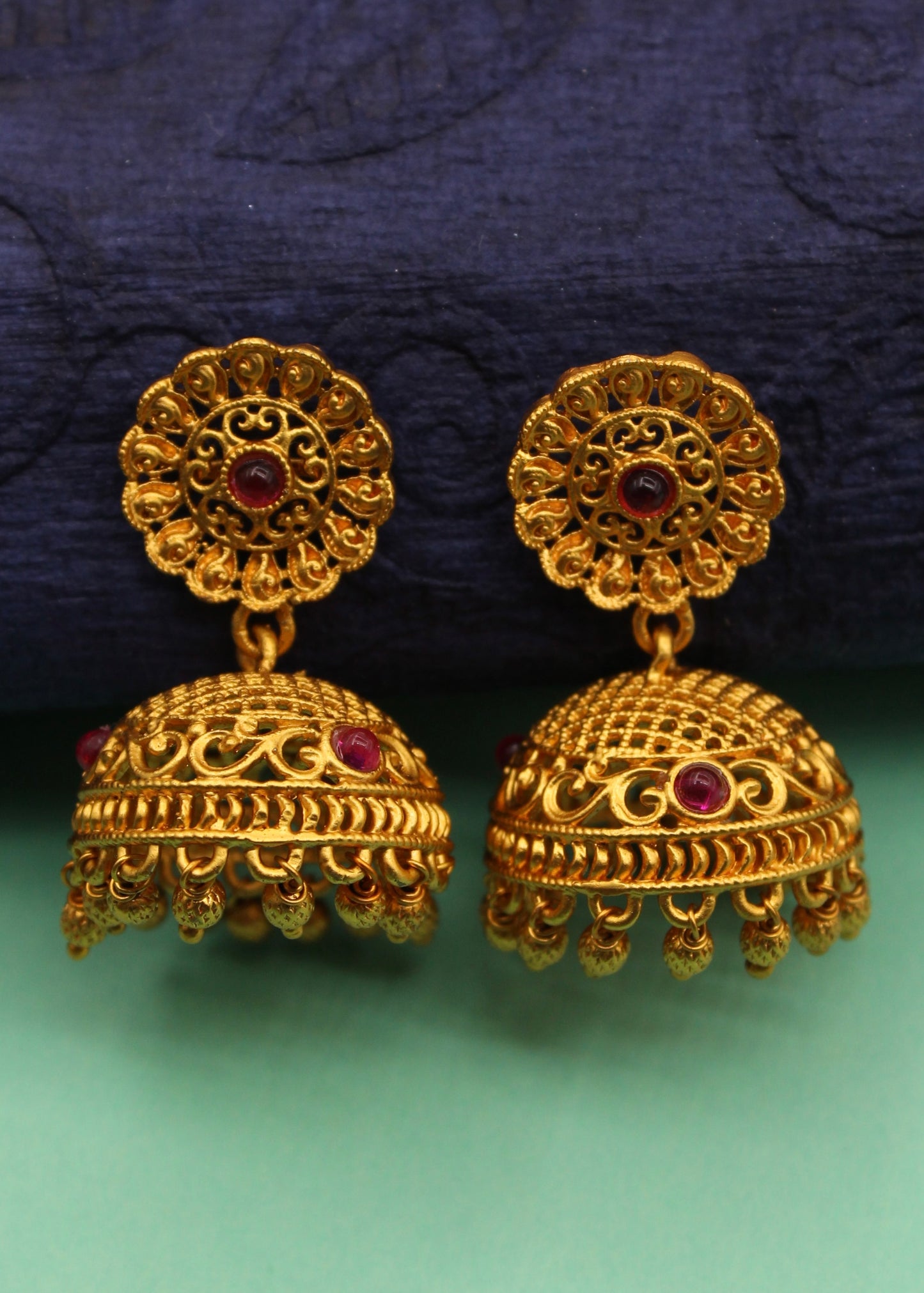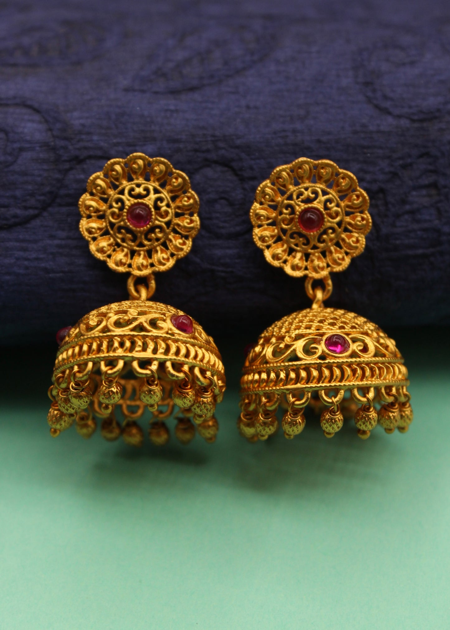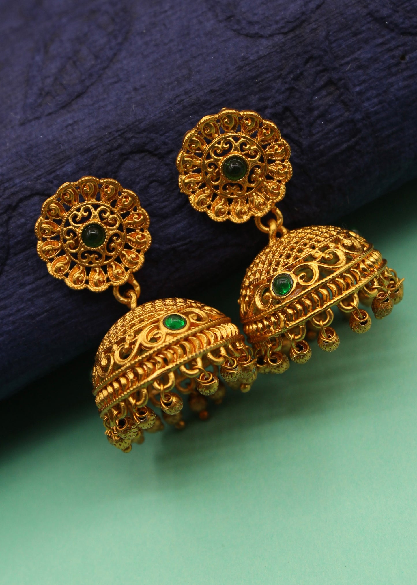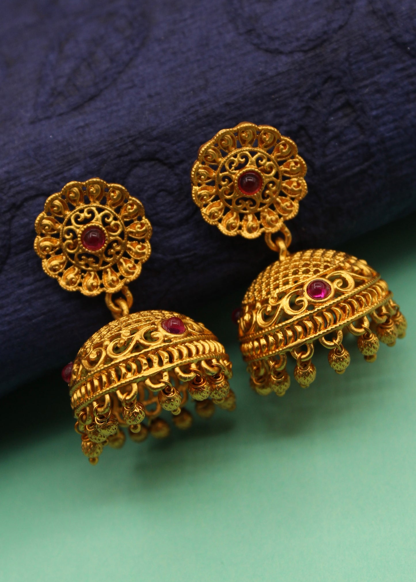 Get that perfect look by clubbing this appealing pair of jhumki earrings with your ethnic costume. It is studded with pink, green stone and crafted from matte gold finish metal. These jhumki earrings have beads droplets for added attraction.