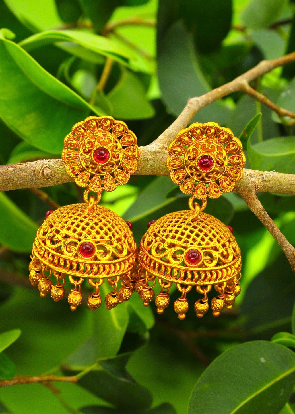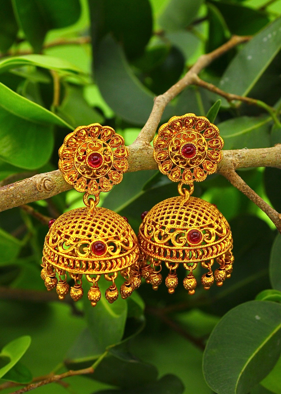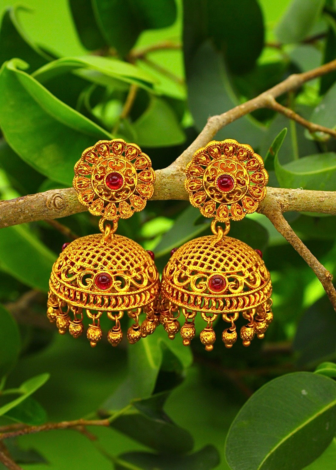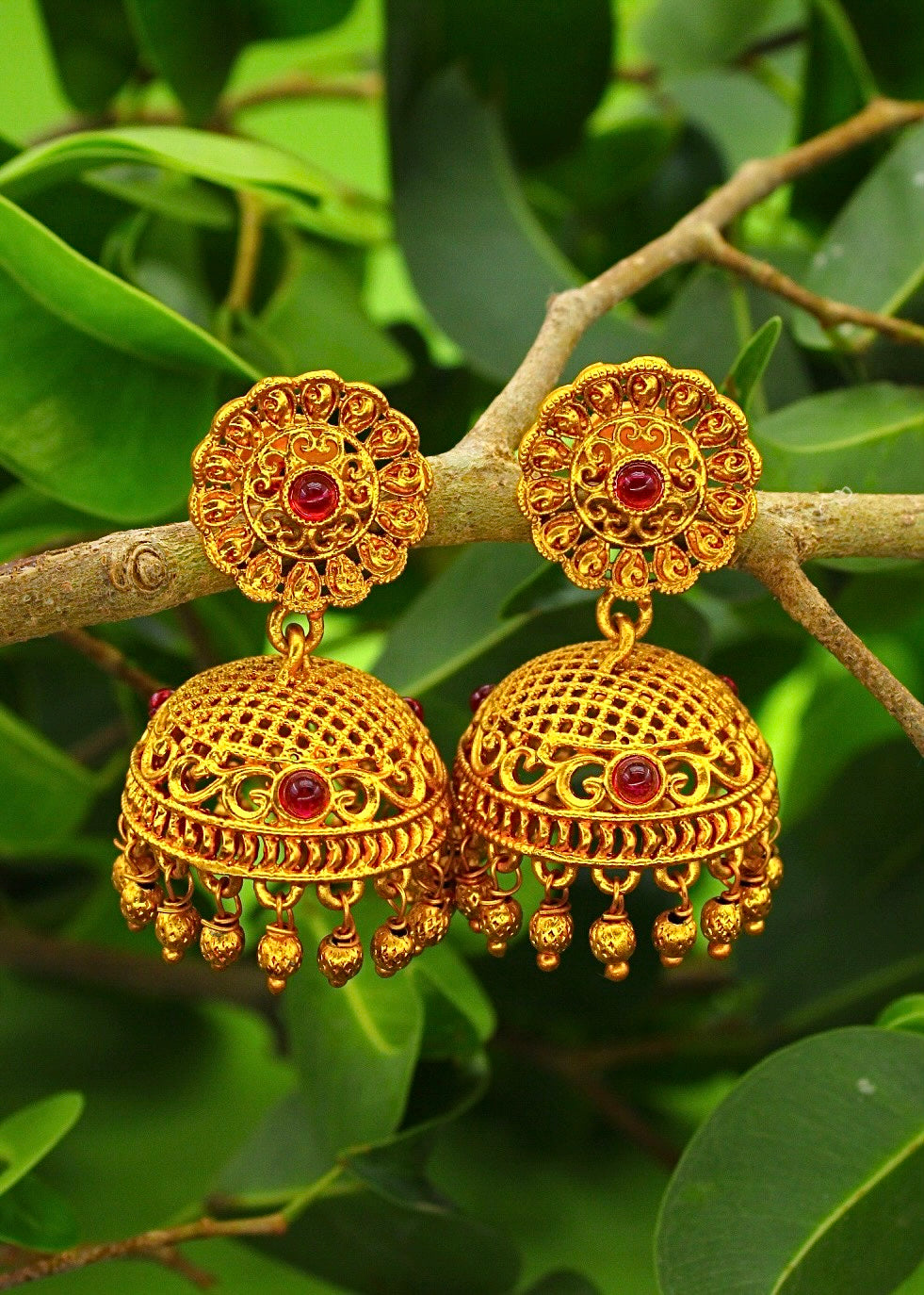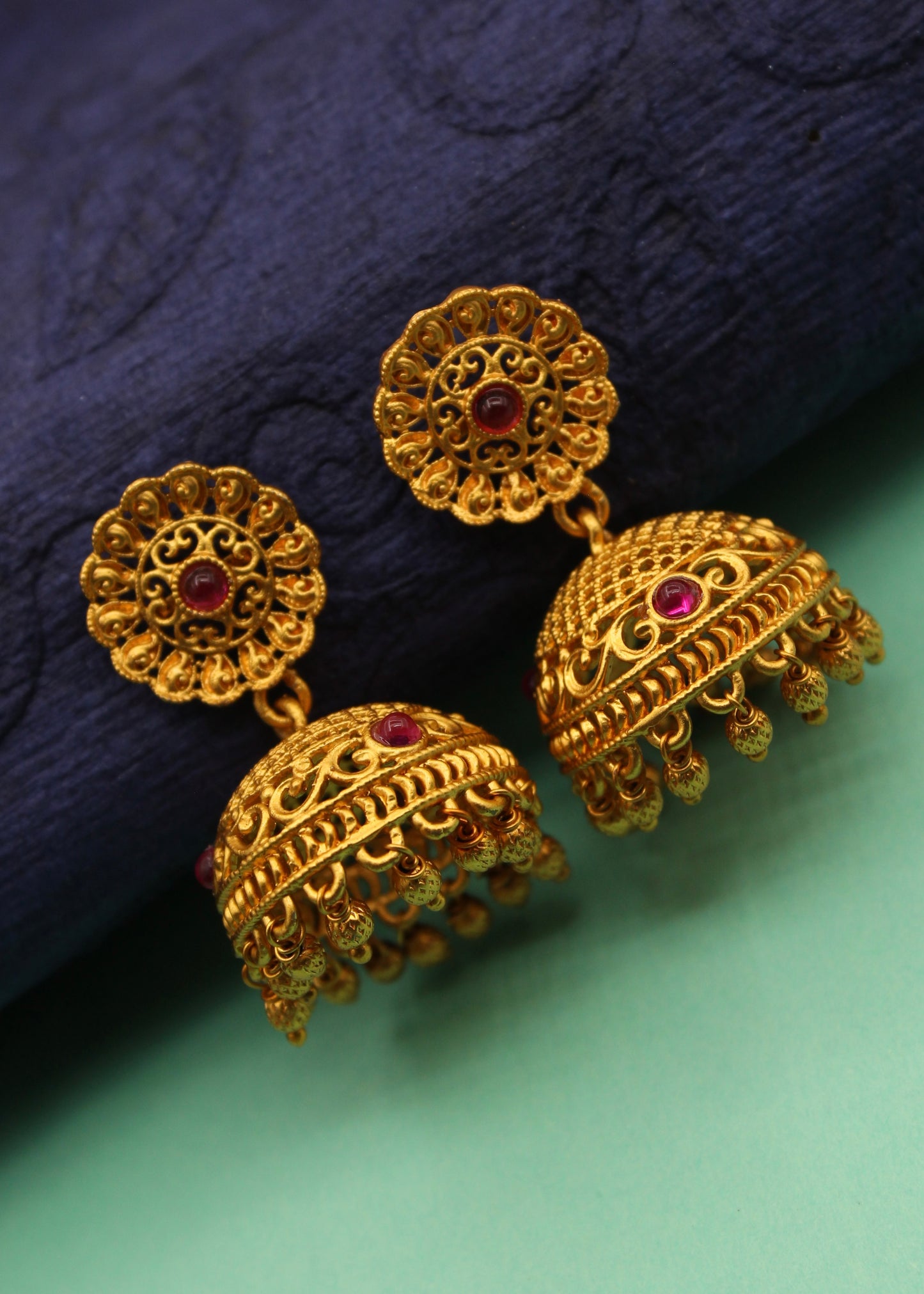 Get that perfect look by clubbing this appealing pair of jhumki earrings with your ethnic costume. It is studded with pink, green stone and crafted from matte gold finish metal. These jhumki earrings have beads droplets for added attraction.
