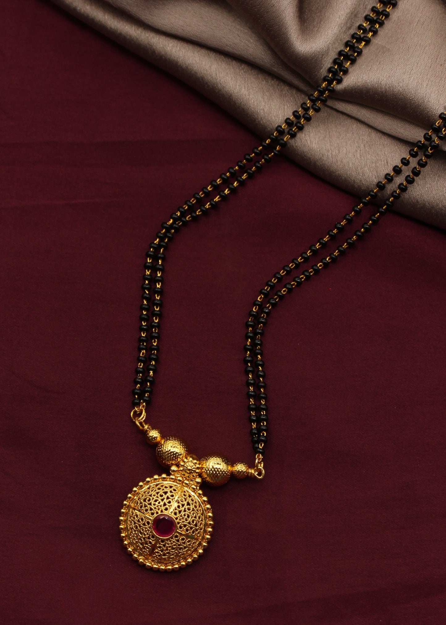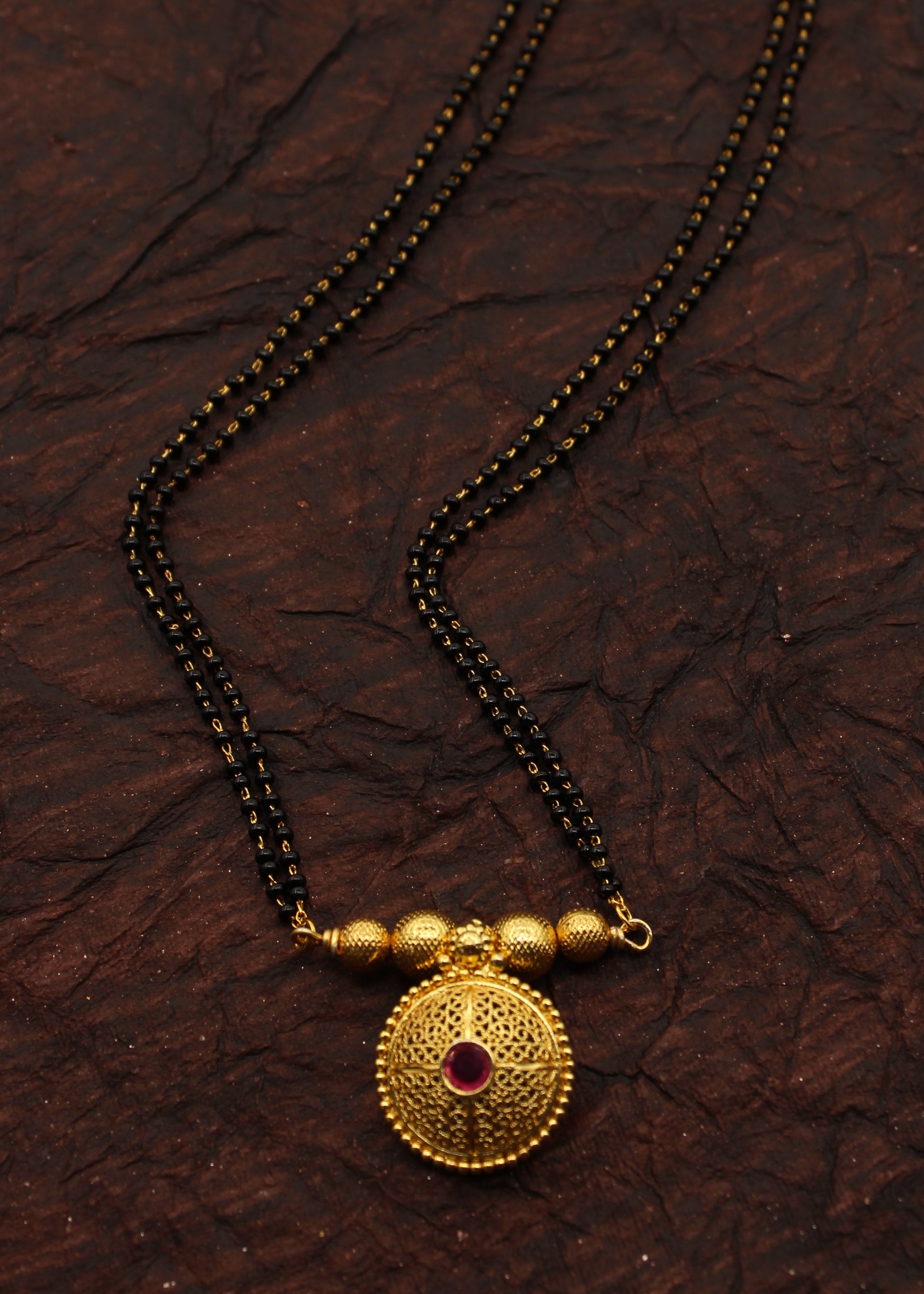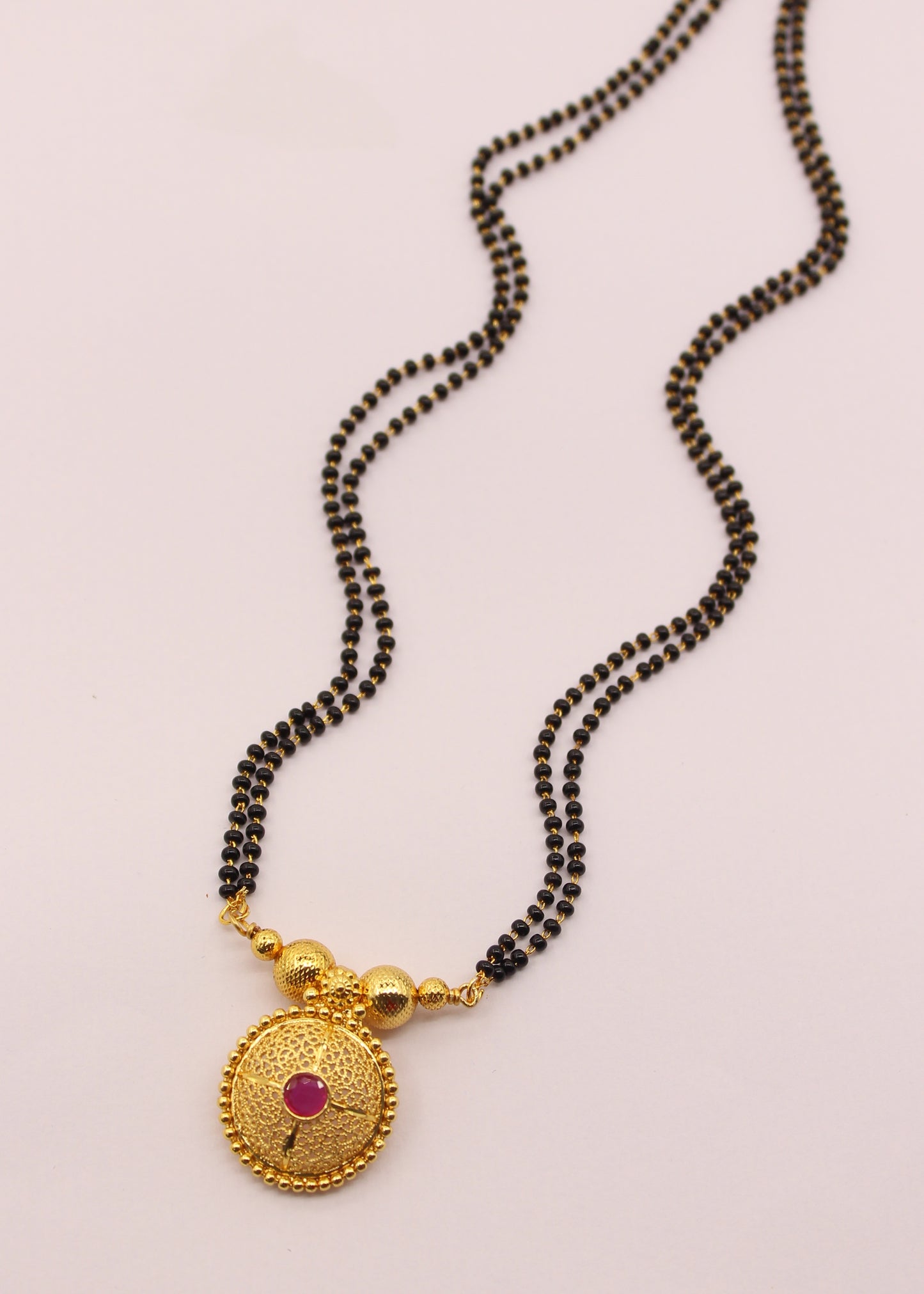 Make an exclusive addition to your jewellery drawer by adding this mangalsutra from Sonchafa Jewellery. It is styled with pink stone balls and made from golden finish metal. This mangalsutra comes with two layer of black beaded chain .This mangalsutra is superior in quality and rust-resistant as well.
