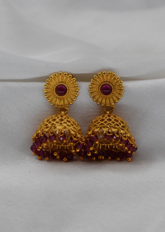 Sonchafa Jewellery offers this all new matte gold finish peshwai earrings for women latest design fancy. This earrings are good in quality and encrusted with pink Stone along with pink, green beads droplet.