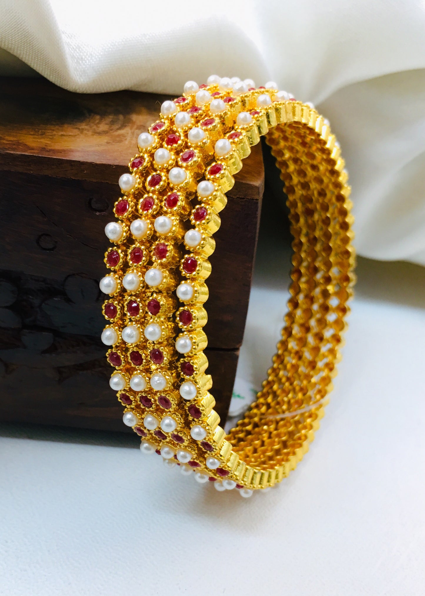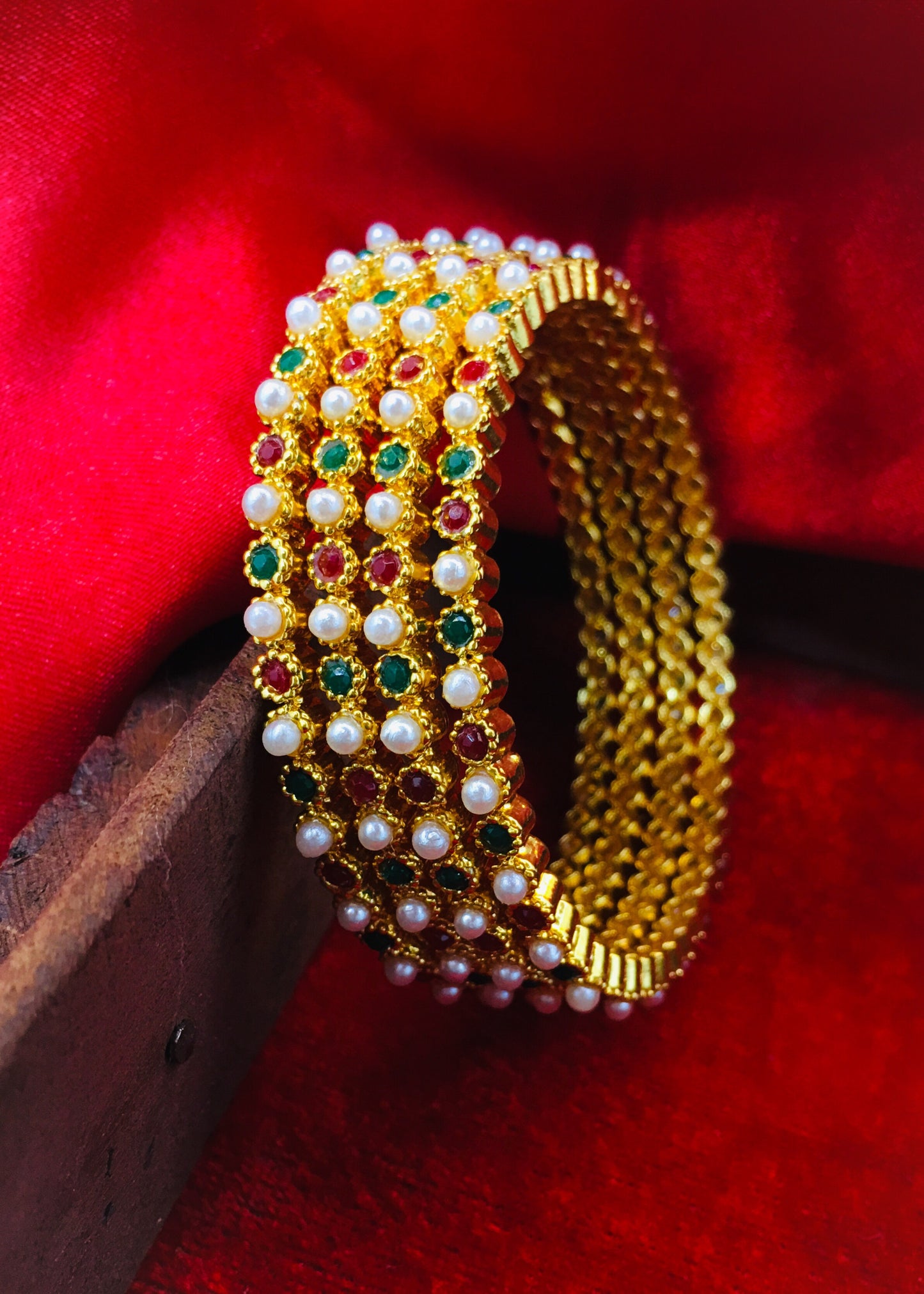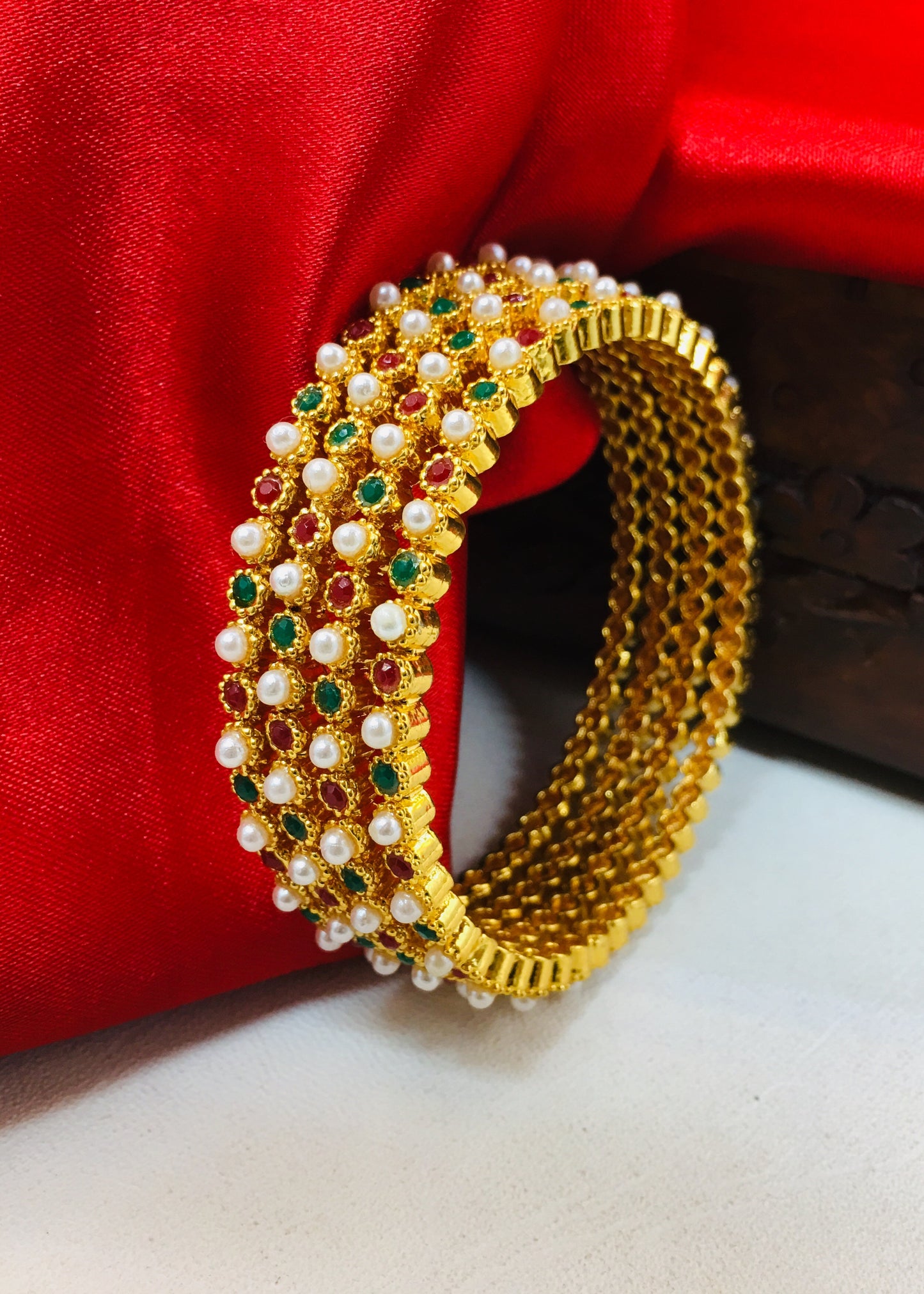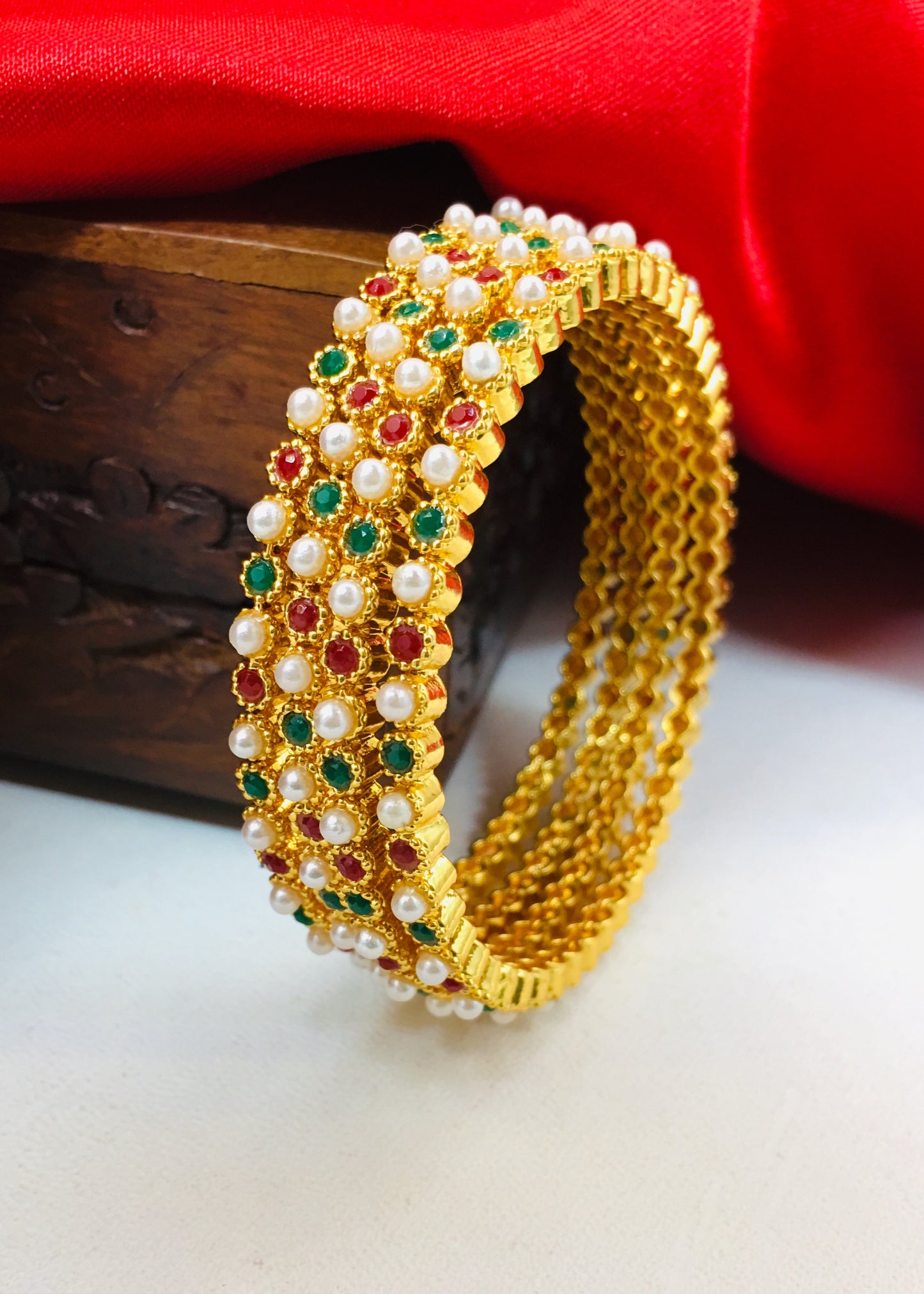 Pink-green combination appealing set of four bangles from Sonchafa Jewellery will blow your heart at very first look. They are studded with sparkling stones along with peral beads and feature intricate carving design on metal surface. These bangles are superior in quality and skin-friendly as well.