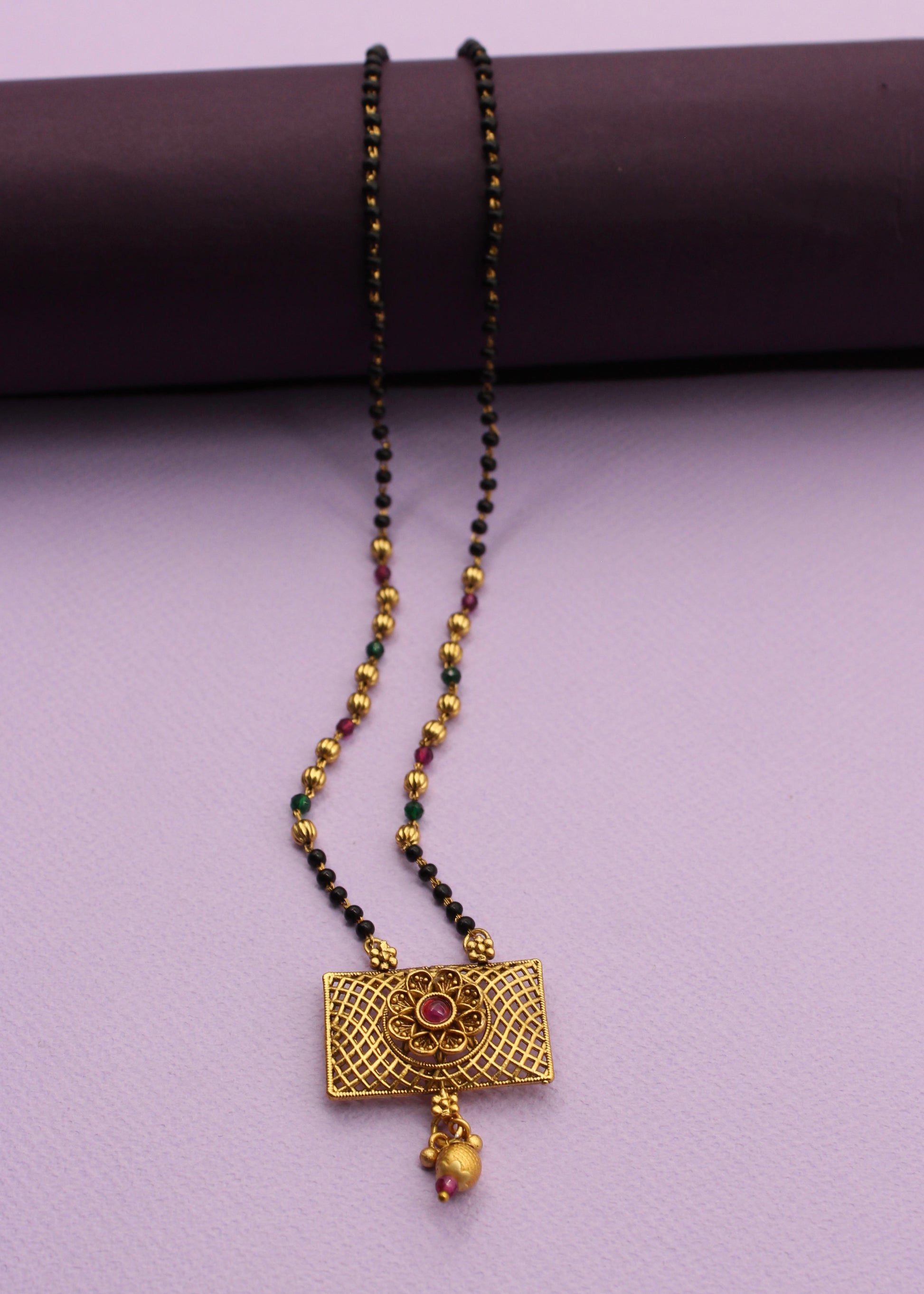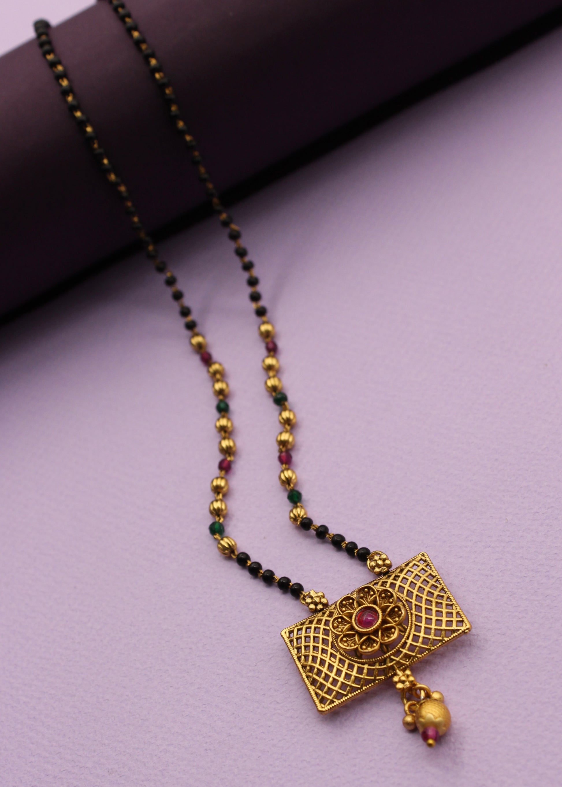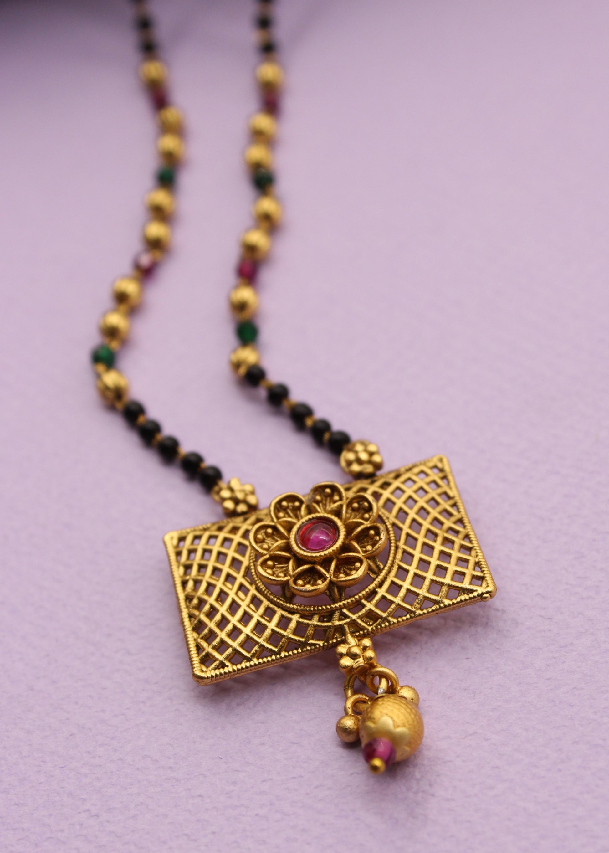 How adorable this gold plated mangalsutra from Sonchafa Jewellers. This mangalsutra is crafted with antique gold finish metal and embedded with pink stone. It will surely give you a very splendid look. The simple but pretty droplet added is for attraction. It will also stay in the same glory even after many years of usage and will be your fashion companion for many years.