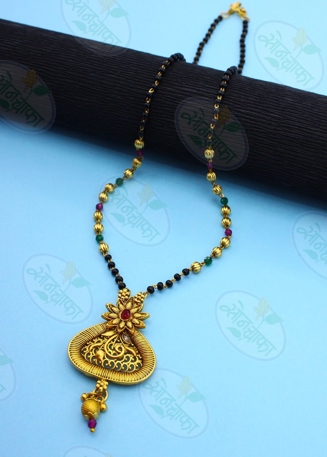 Beautiful rajwadi mangalsutra from sonchafa Jewellery will appeal to you at very first look. It is studded with white, pink stone and fashioned from antique gold finish metal. You can wear this pretty mangalsutra with any of your casual outfits. It is long lasting and high in durability.