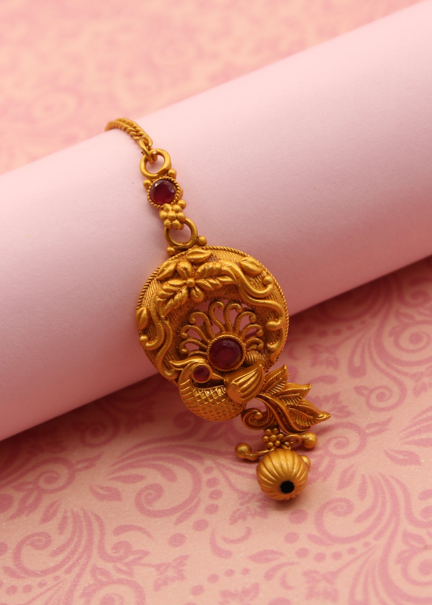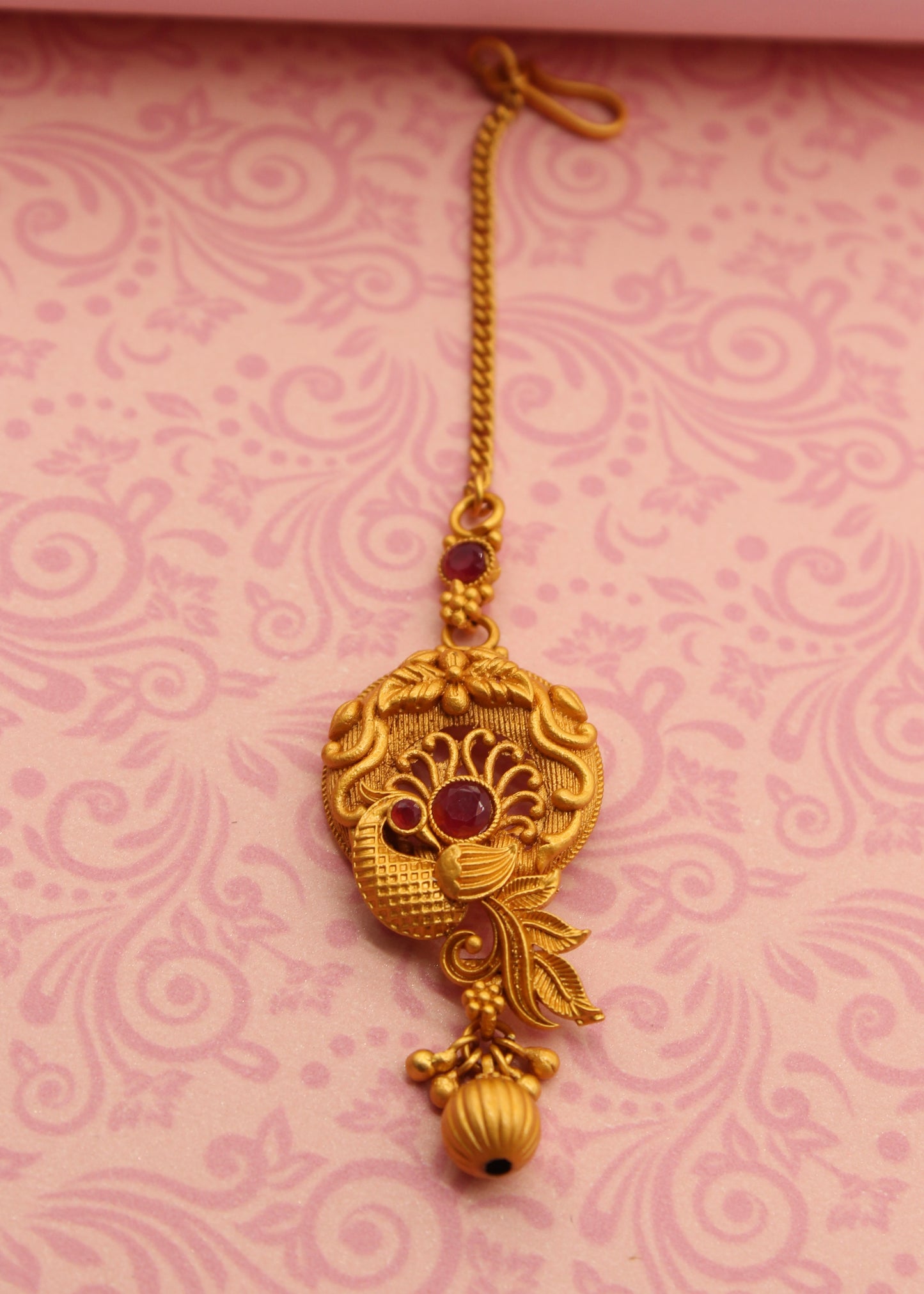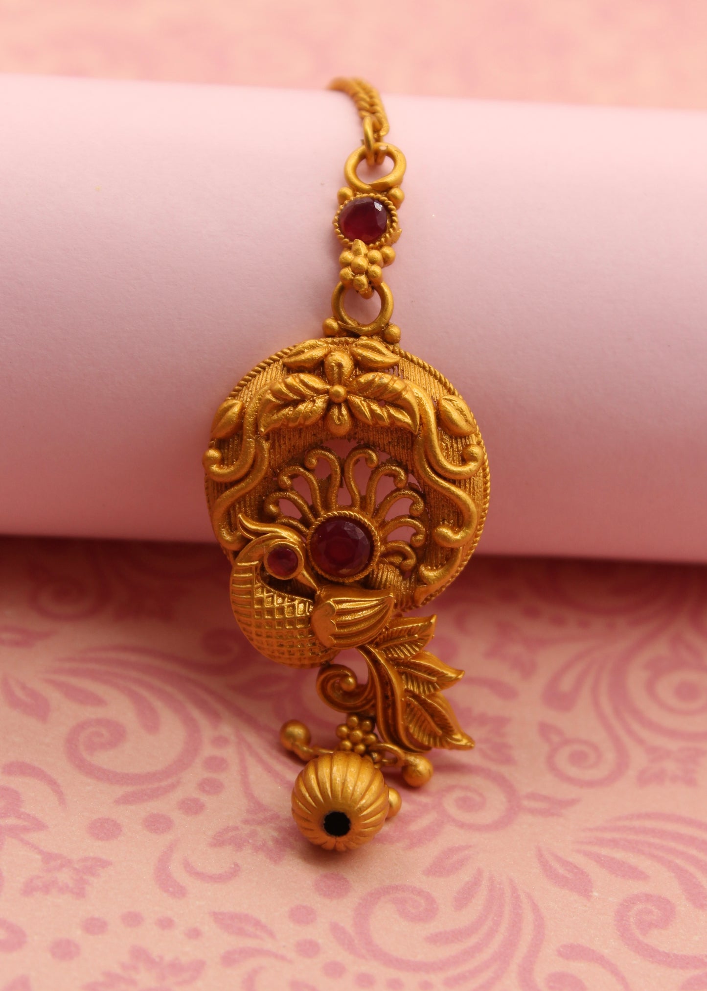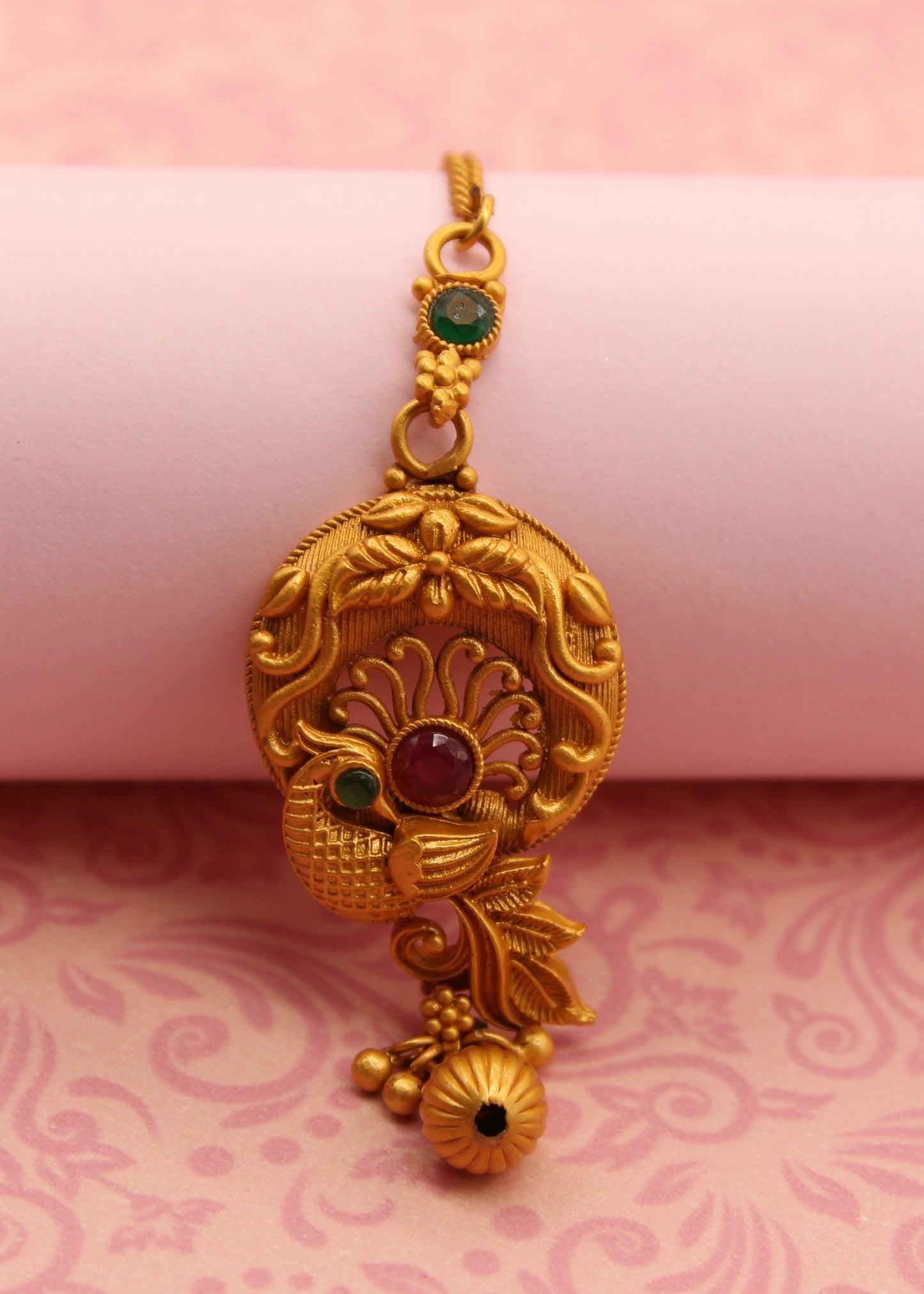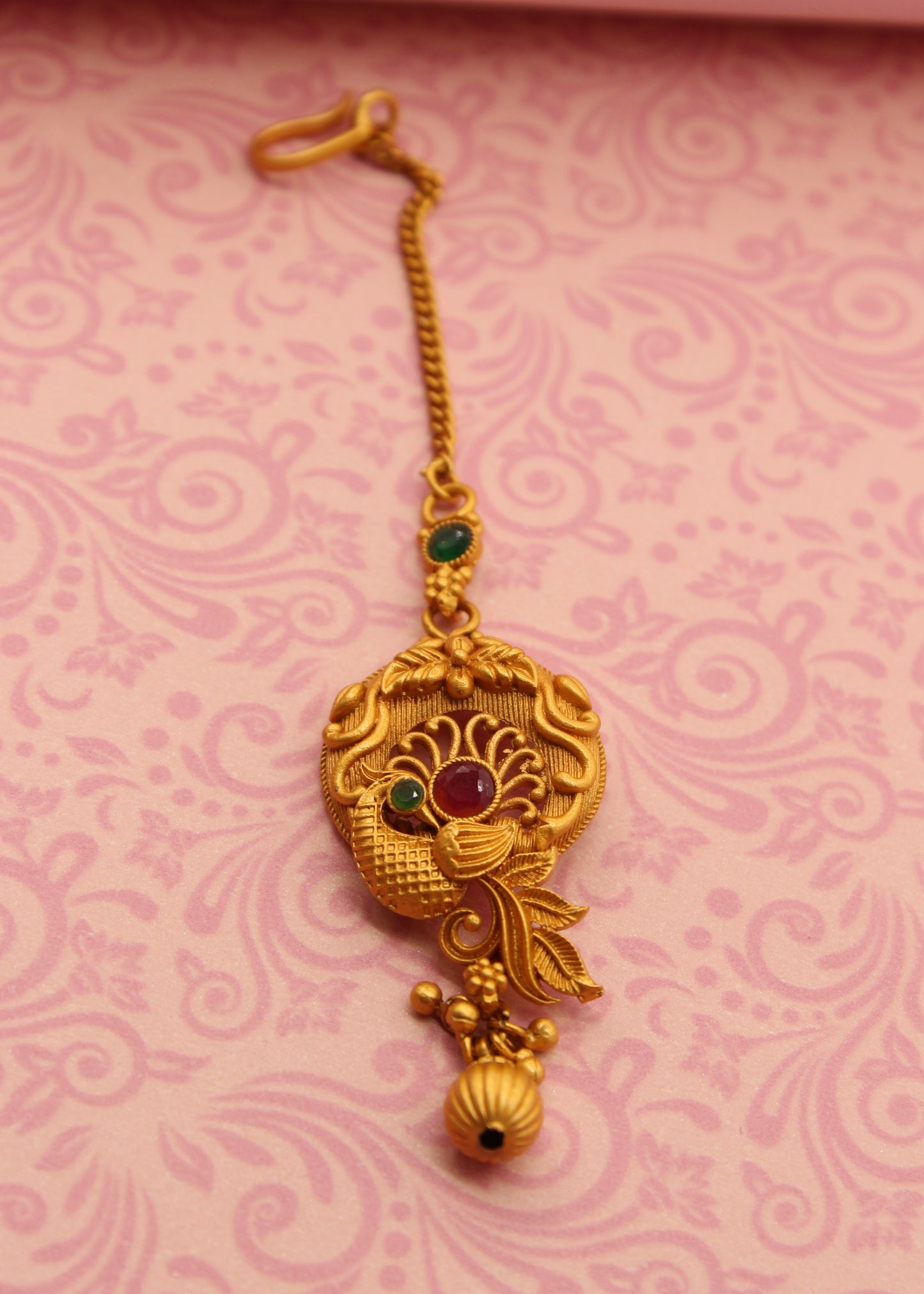 Buy something stylish for yourself in the from of this matte gold finish ethereal peshwai bindi set from the stock of sonchafa Jewellery. It is woven with pink-green beads featuring flawless peacock design work .