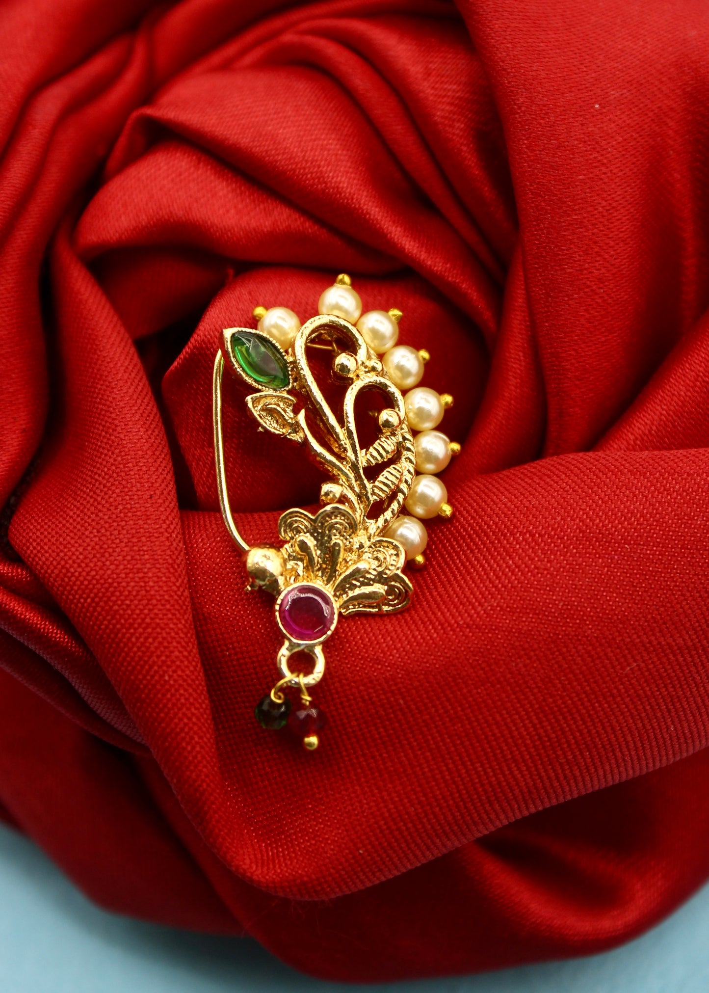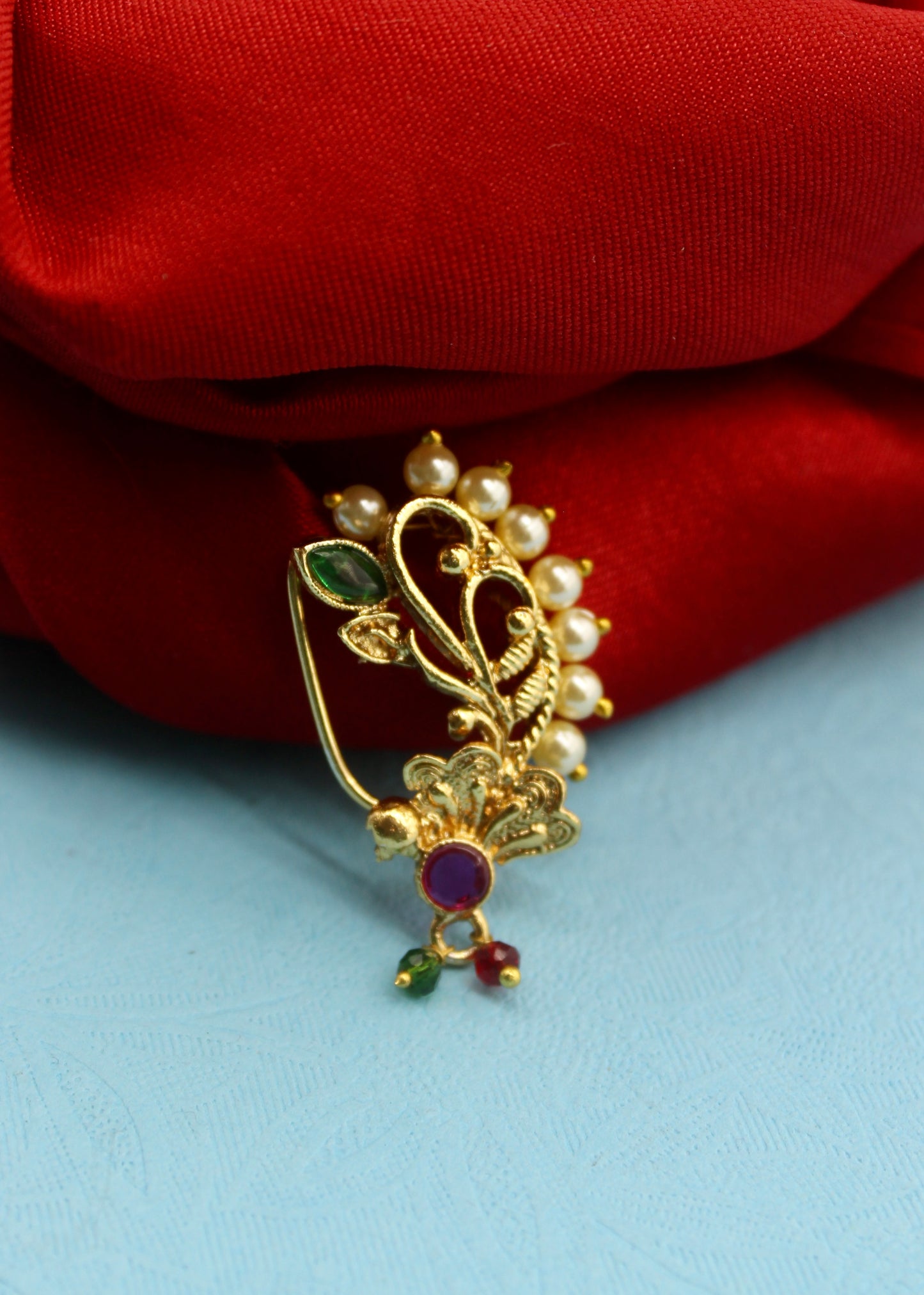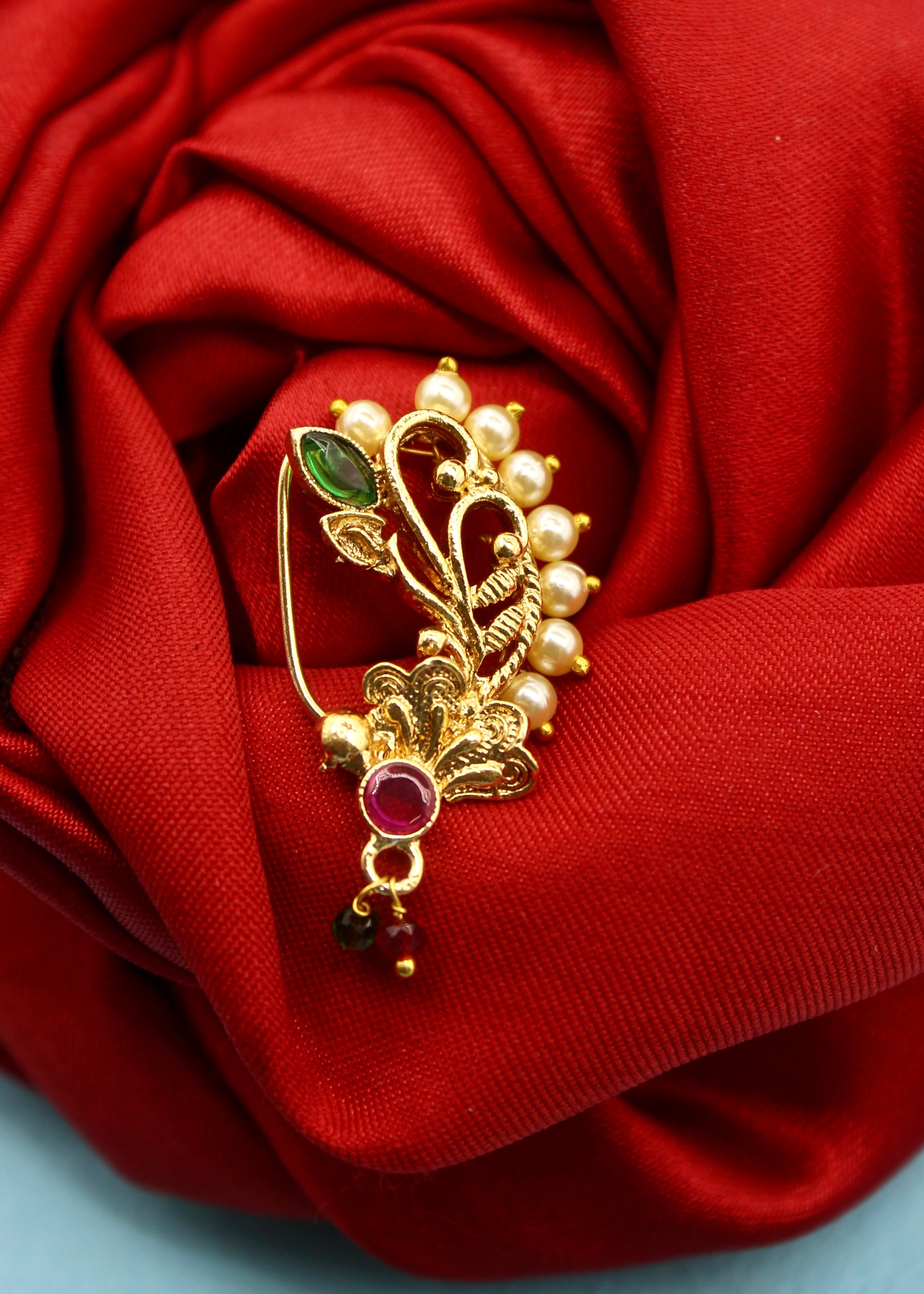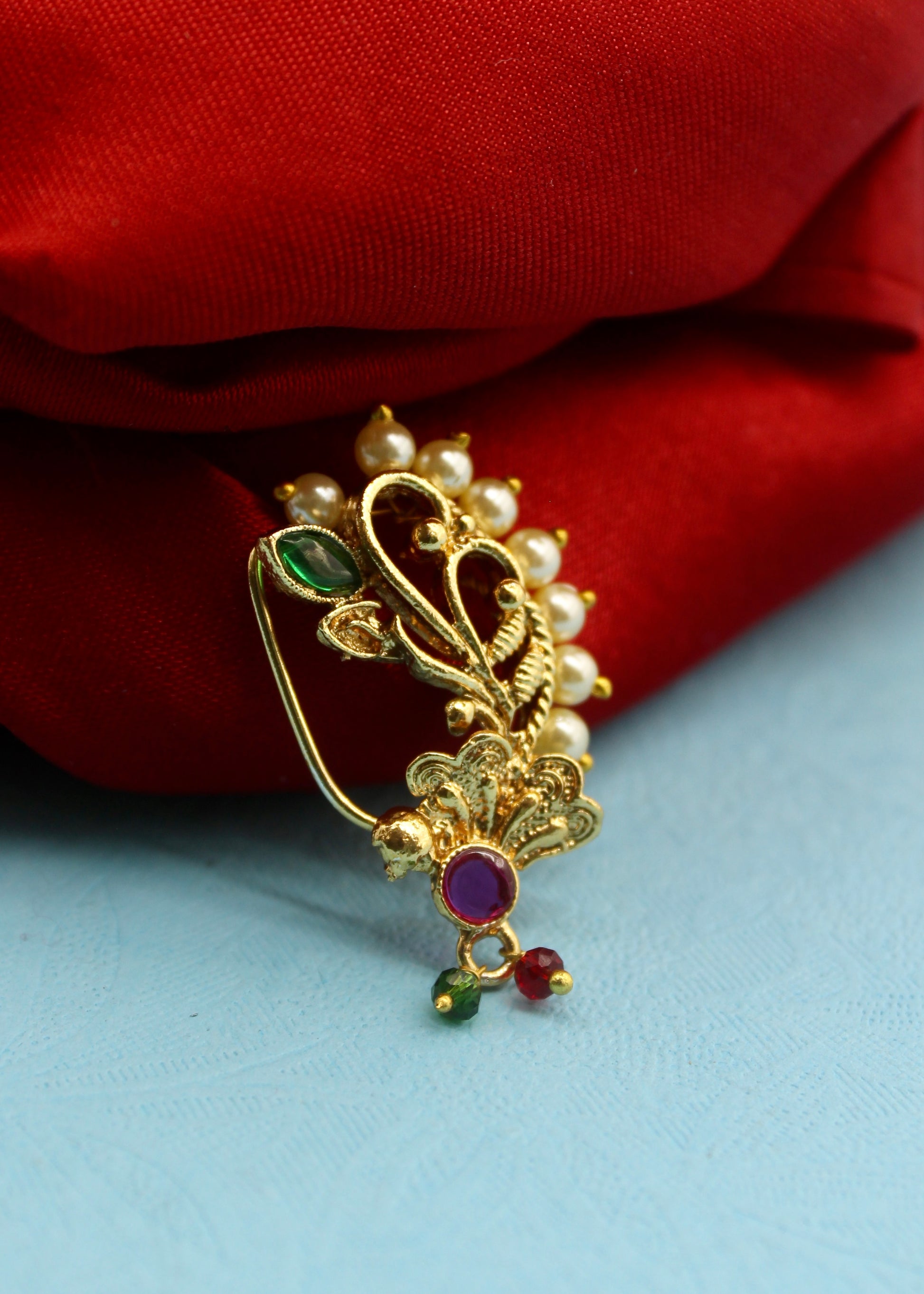 Adorn your jewellery box with this Maharashtrian nath from Sonchafa Jewellers. It is encrusted with sparkling pink, green colour stones and fashioned from antique golden finish metal. This metal crafted nose ornament is easy to wear and press on. Grab this nose pin and turn many heads towards you.