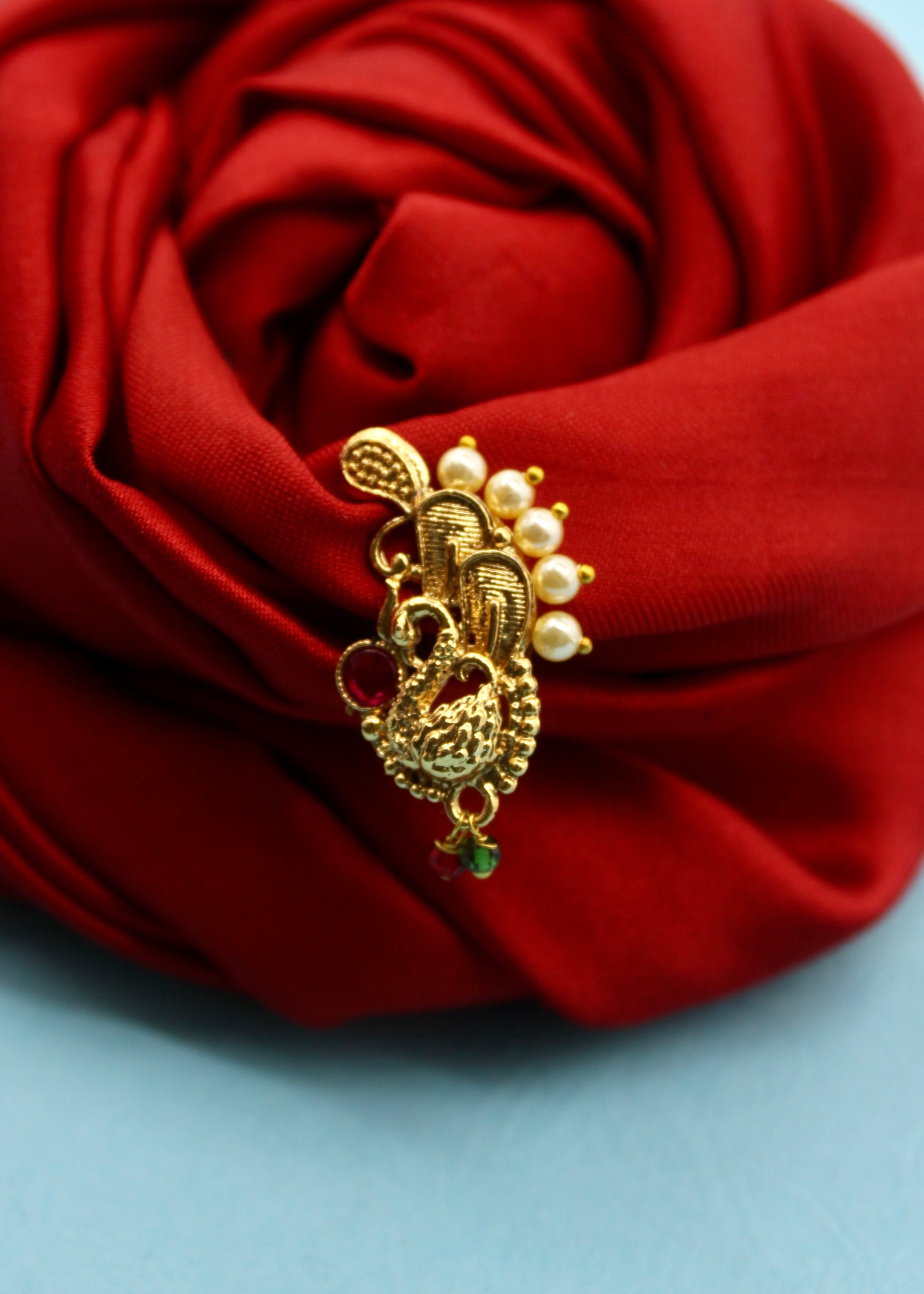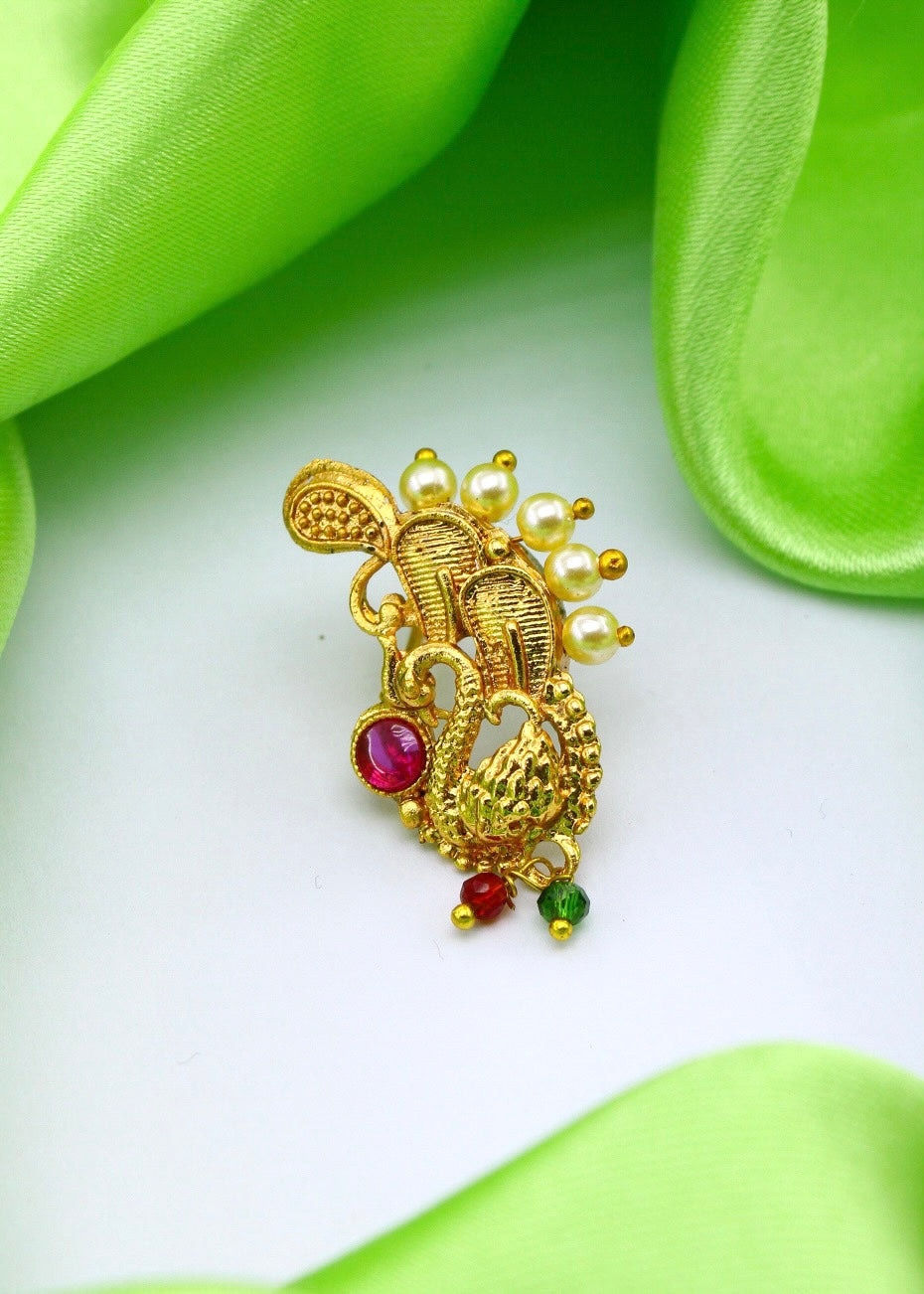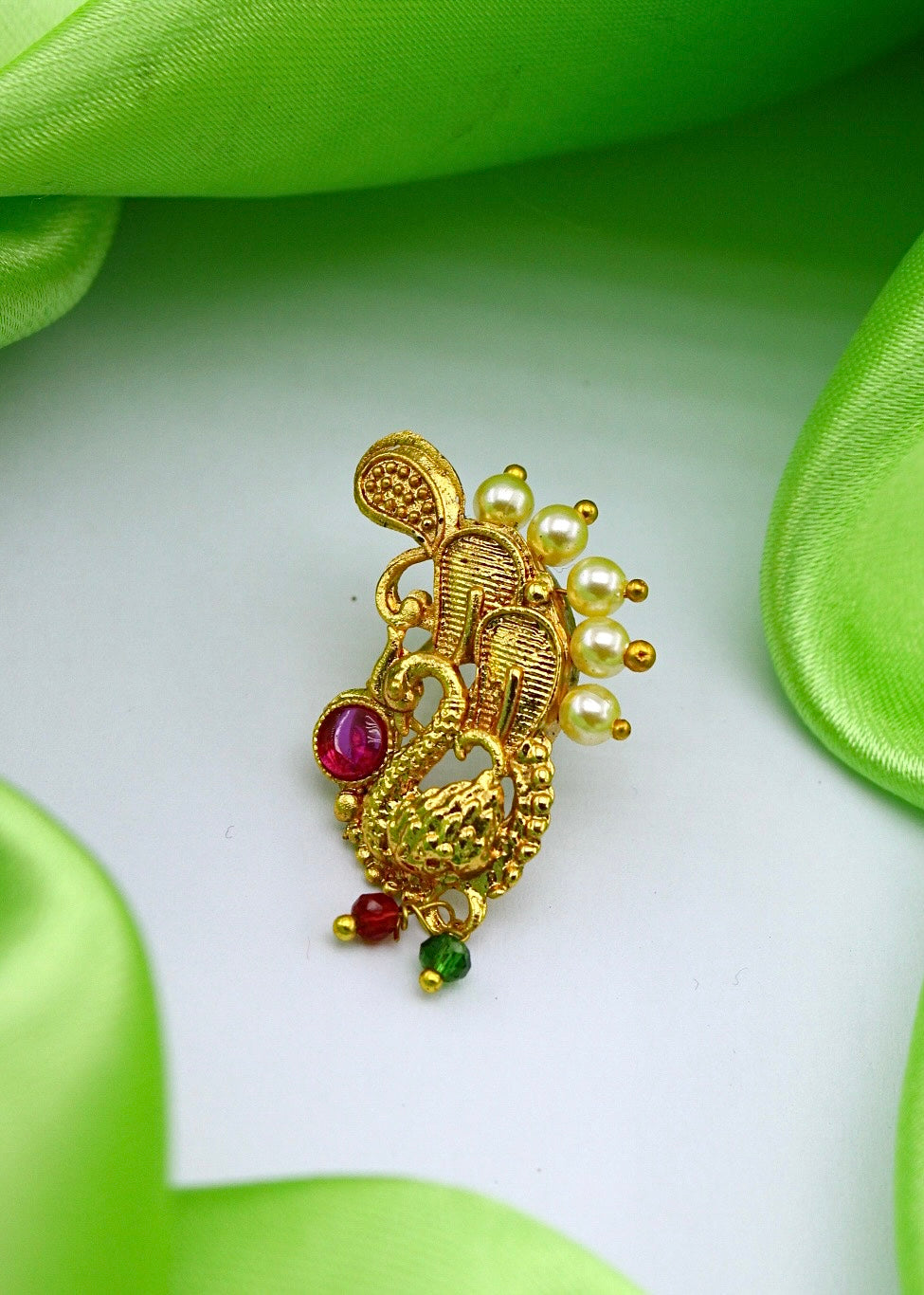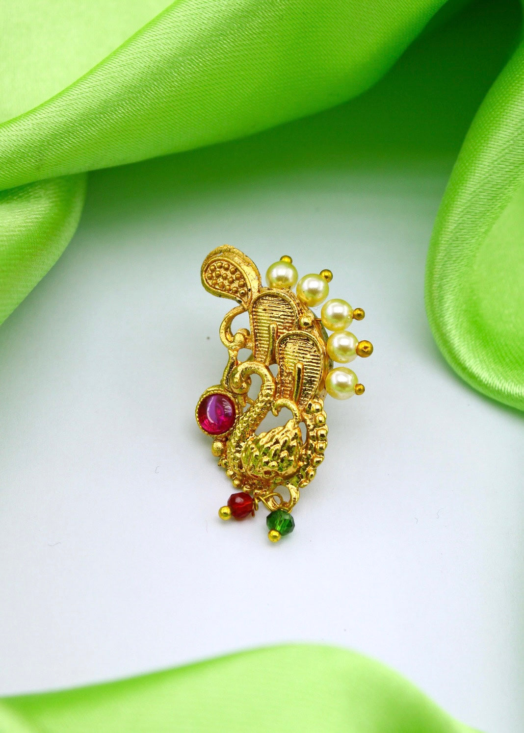 Get the perfect Maharashtrian look by wearing this beautiful nath with your traditional outfits. It is studded with pink colour stones and woven with good quality pearl beads. This peacock design nath is crafted from highly durable antique golden finish metal. This nath is easy to wear and requires piercing.