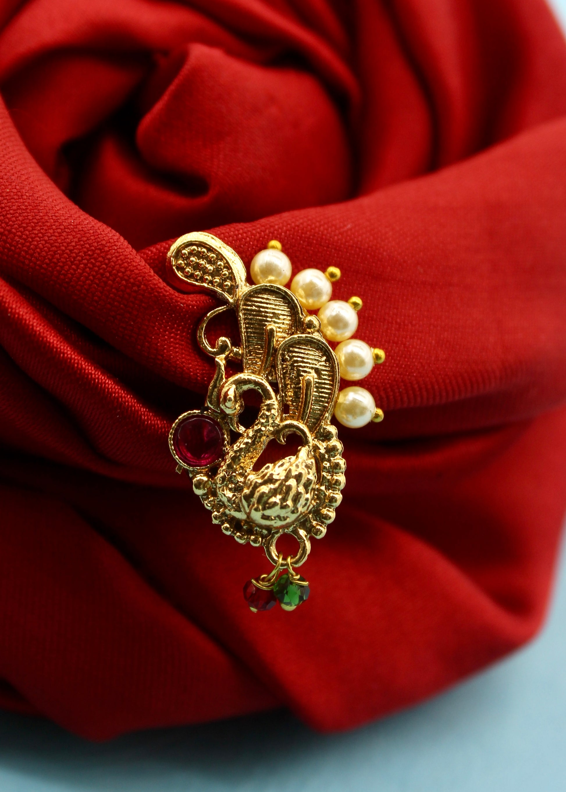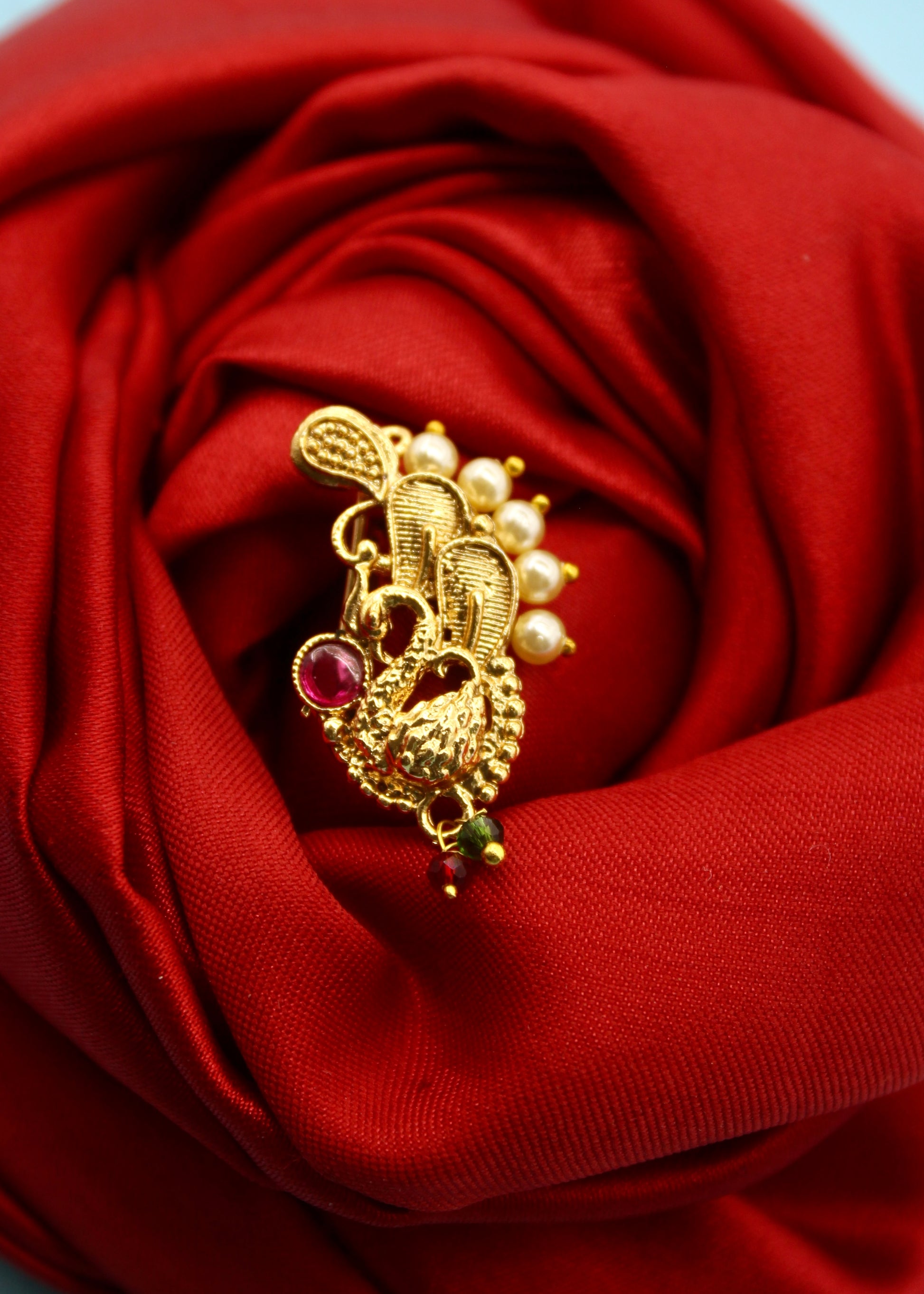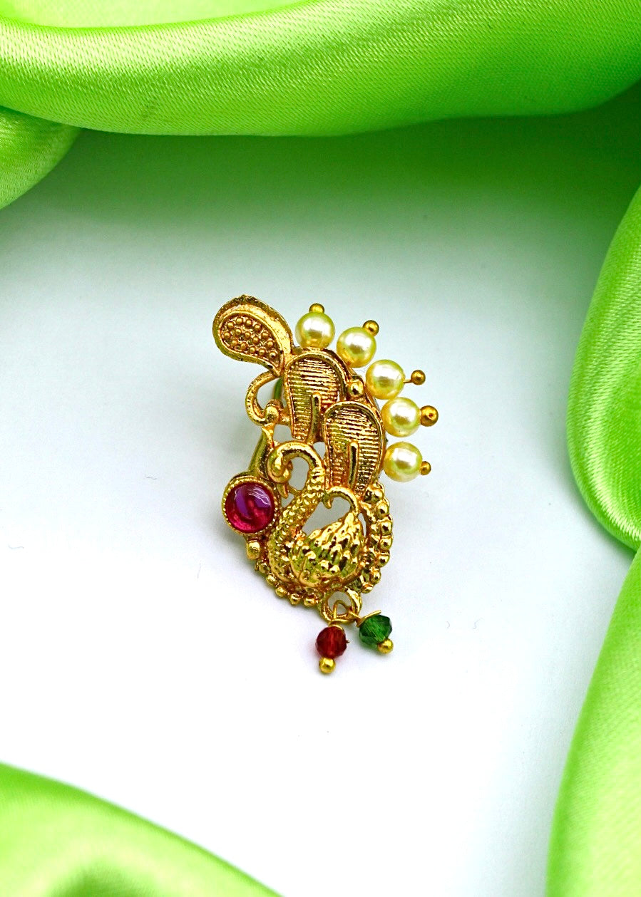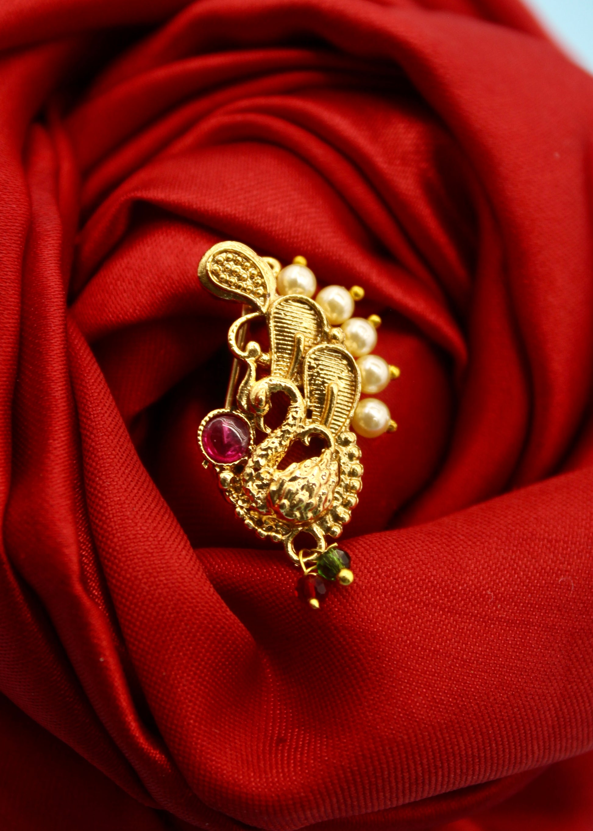 Get the perfect Maharashtrian look by wearing this beautiful nath with your traditional outfits. It is studded with pink colour stones and woven with good quality pearl beads. This peacock design nath is crafted from highly durable antique golden finish metal. This nath is easy to wear and requires piercing.