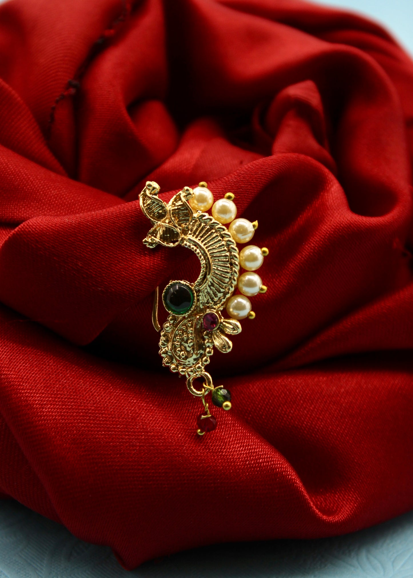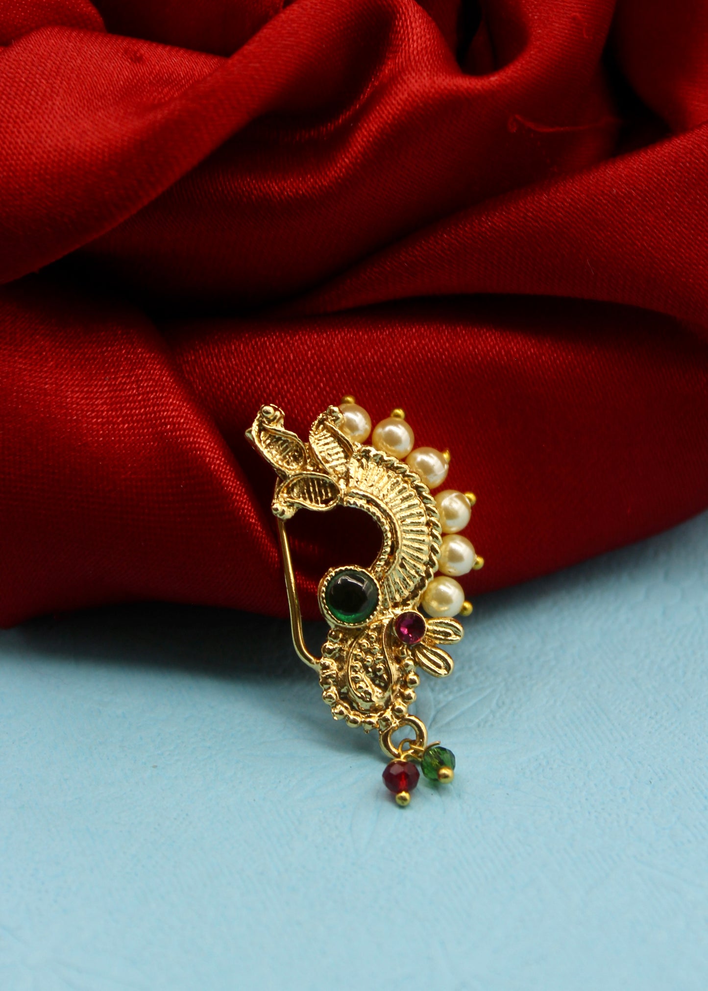 Look stylish by adorning this nath which feature wonderful carving design. It is made from highly durable antique golden finish metal and ensures skin-friendliness. This nath is studded with pink, green stone along with good quality pearls. This beautiful nath is easy to wear as it press on.