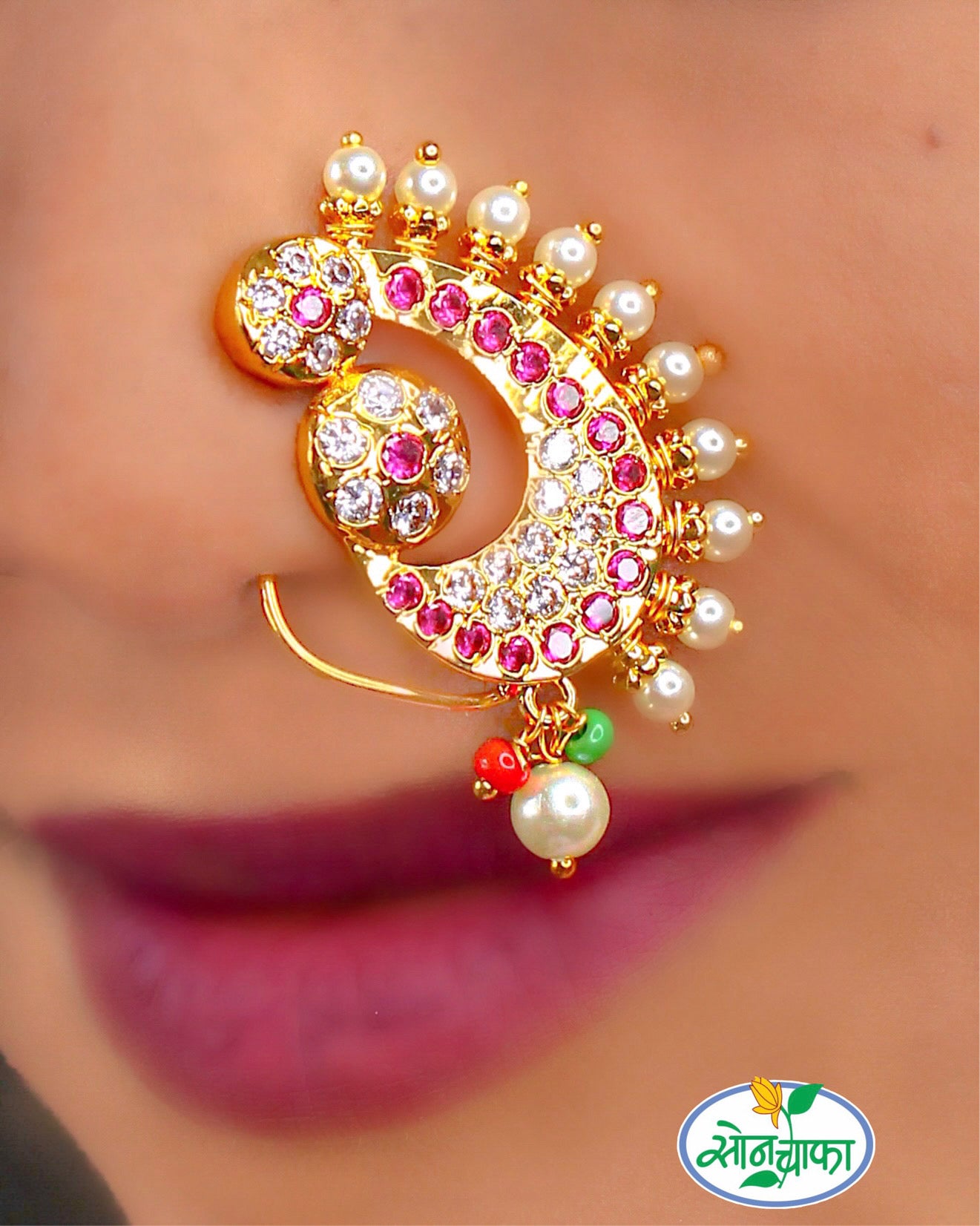 Buy something unique for yourself in the form of this attractive Maharashtrian nath from Sonchafa Jewellery. It is embedded with sparkling pink, white stones and woven with pearl beads. It will surely enhance your traditional look. It is long lasting and highly durable.
