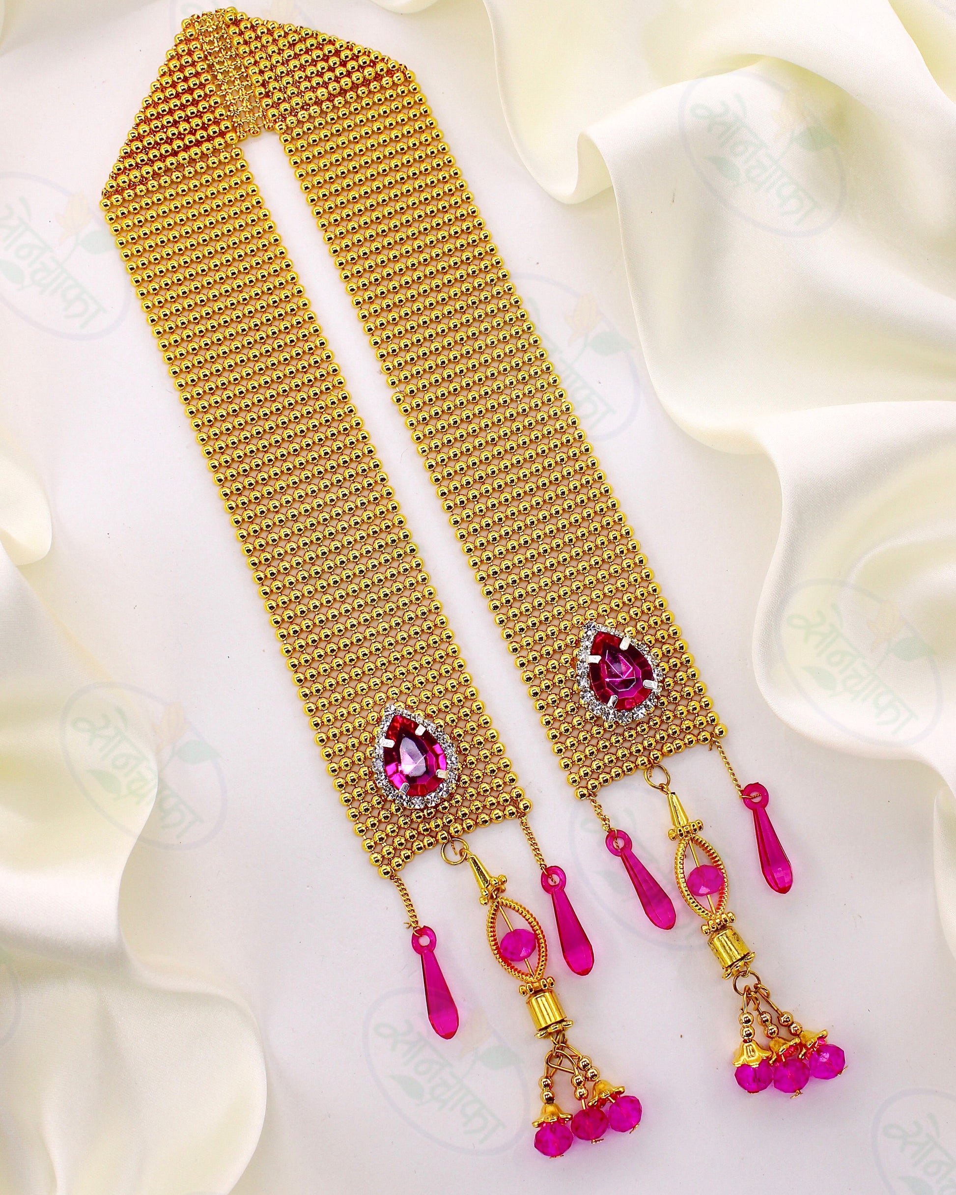 This Pearl beads adorable white colour is best to adorn your Ganapati decoration. It is fashion from pearl beads along with sparkling pink pearl beads . This Ganapati shawl has red- droplets.