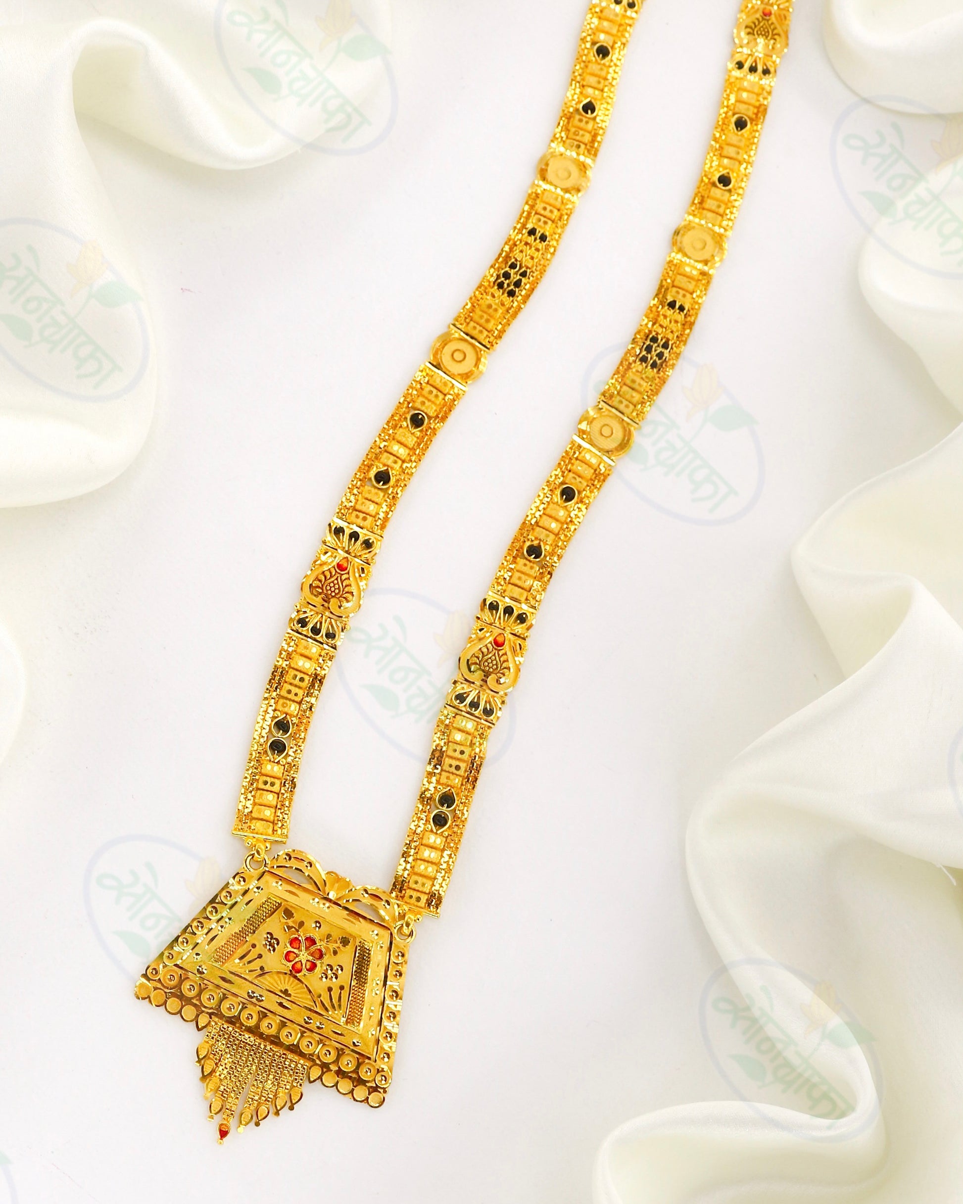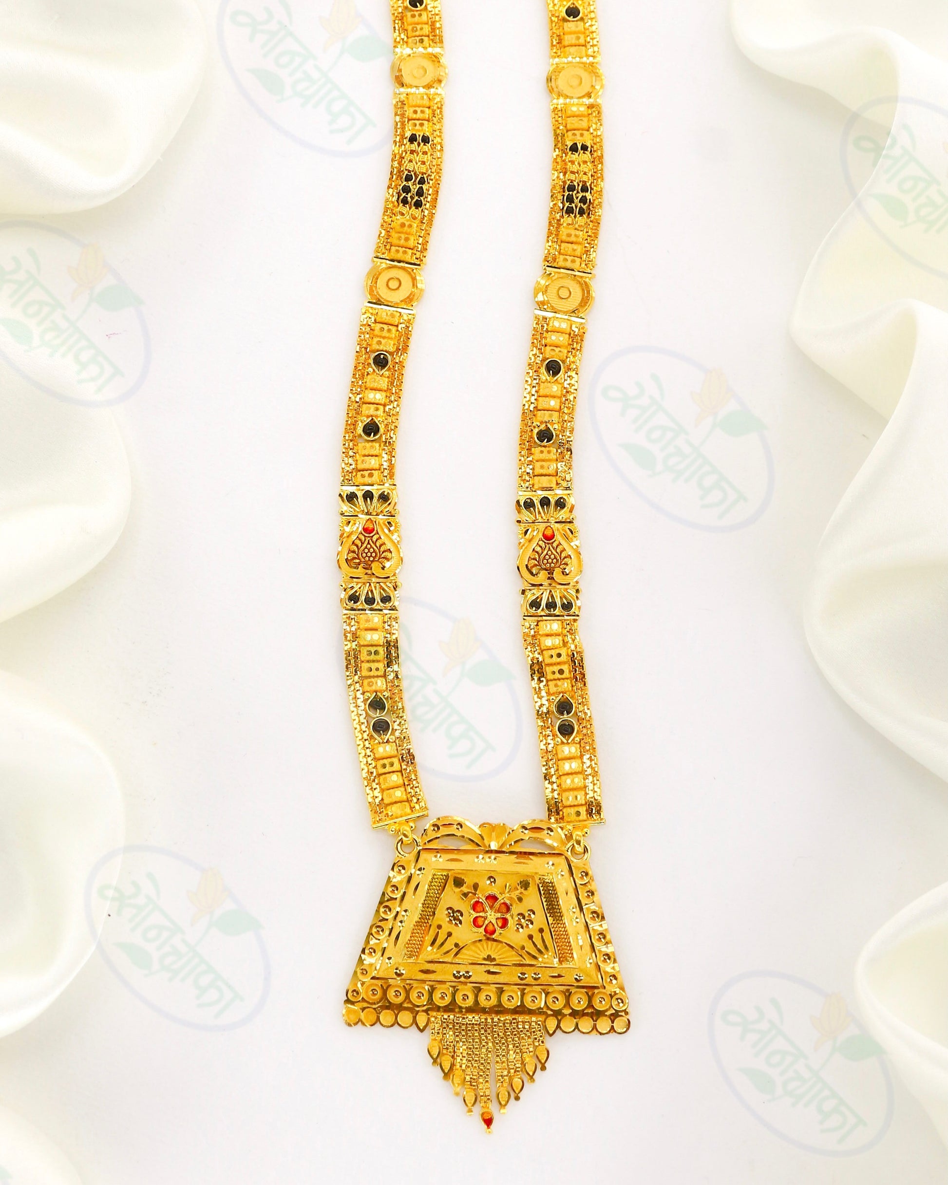 Make an exclusive addition to your jewellery drawer by adding this Peacock designer pendant gold plated mangalsutra from Sonchafa Jewellery. The pendant studded with designer mina work along with woven golden beads. This mangalsutra will fetch lots of compliments from onlookers for your amazing choice