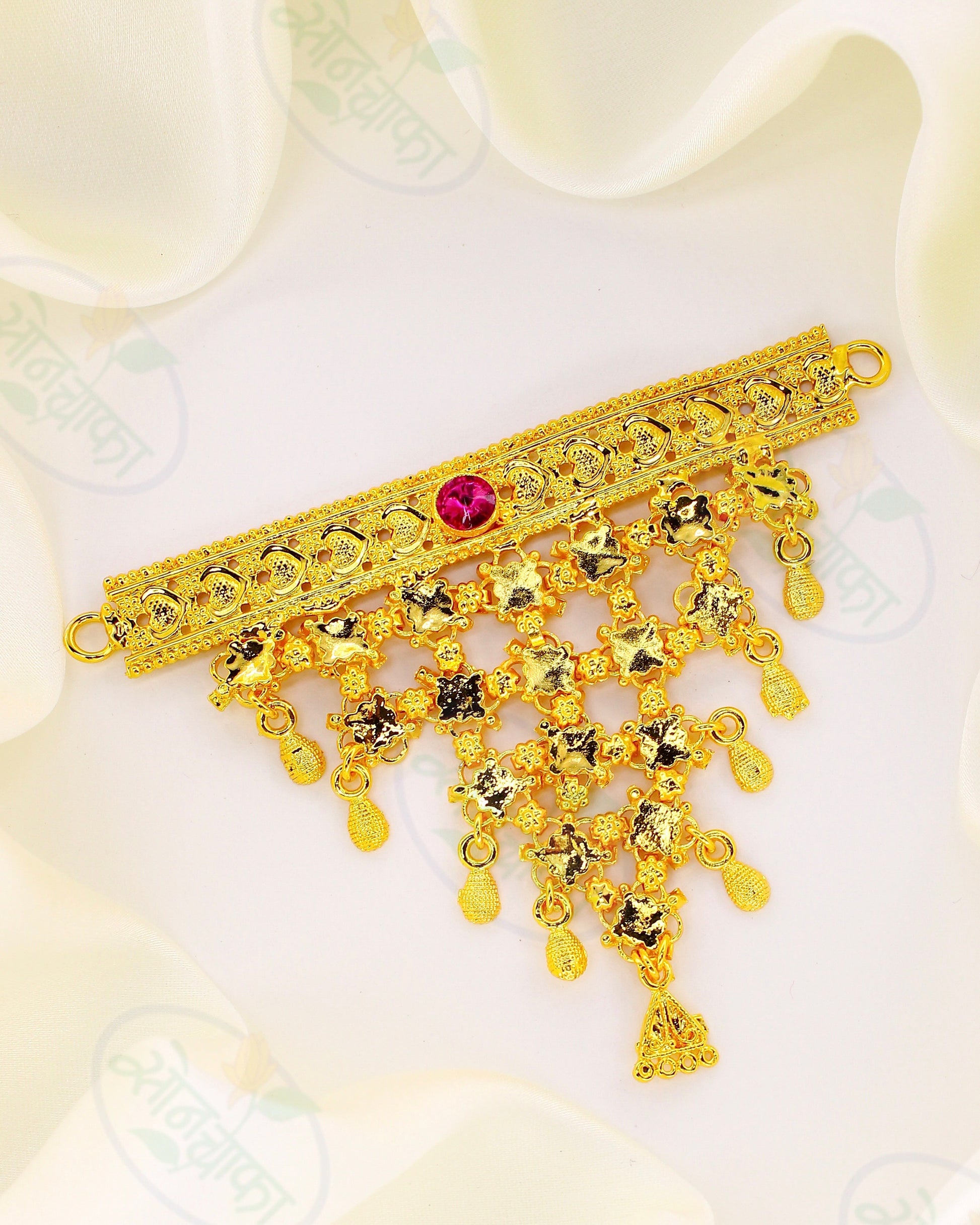 Beautifully designed this 'Ganesha Sond' from Sonchafa Jewellery is best for decorate your Ganpati Murti. It is embedded with sparkling pink stone for added attraction. This Ganpati Sond is made from golden finished metal and ensures high durability.