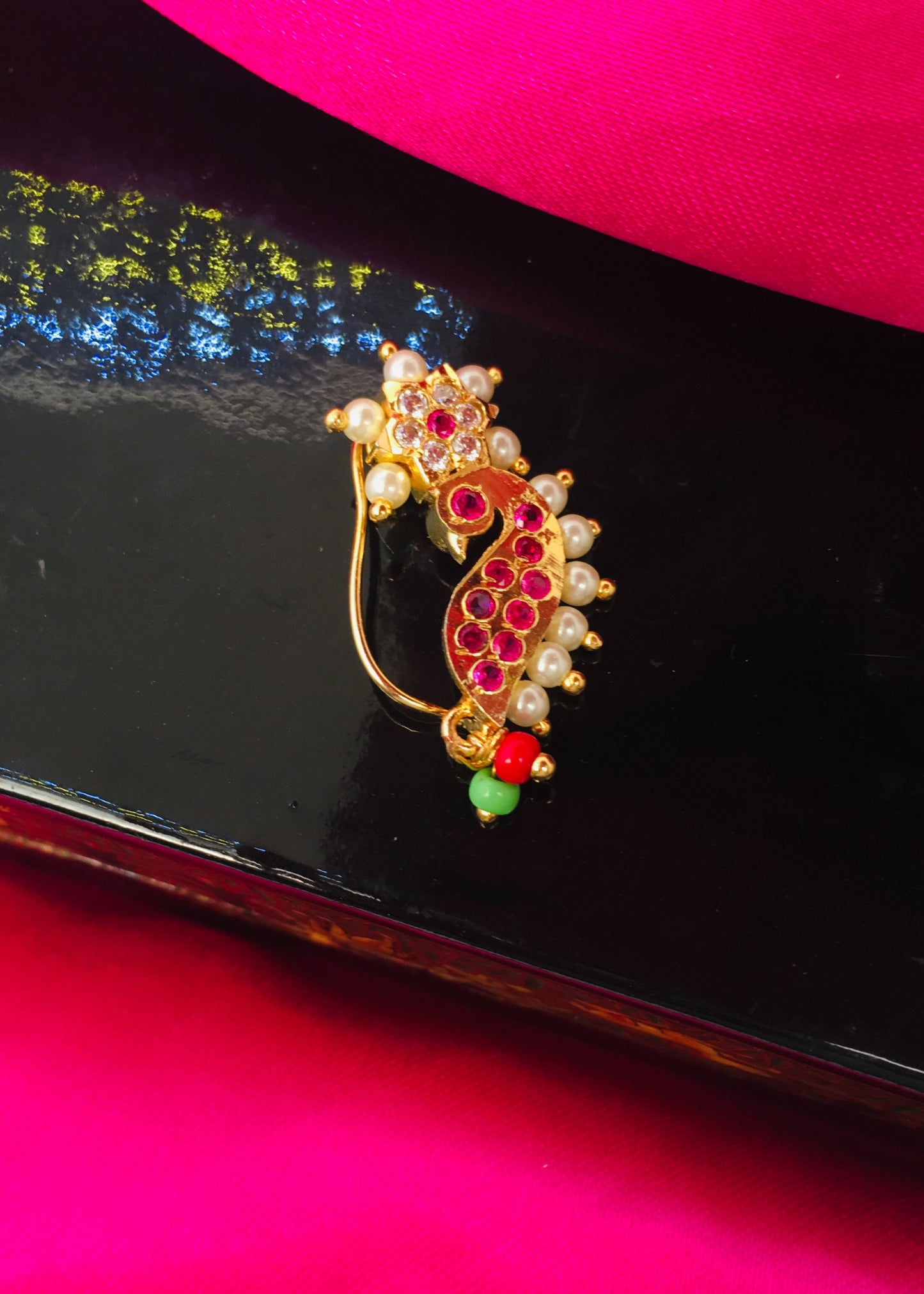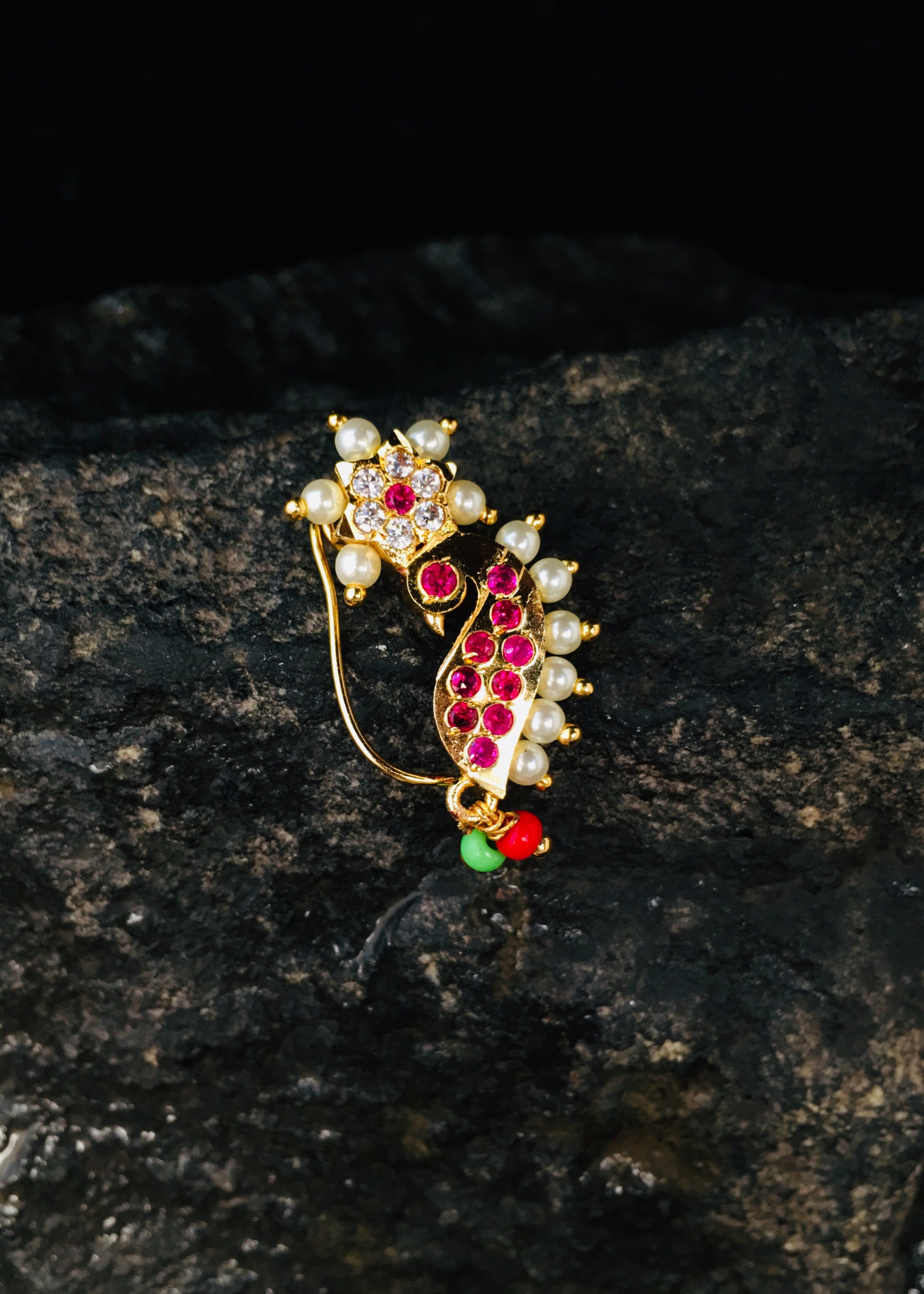 Flower with Peacock inspired wonderful Nath From Sonchafa Jewellery for stylish women like you. It is styled with studded sparkling white, pink stone and made from golden finish metal. This nath have pearls beads droplets for more classy look.