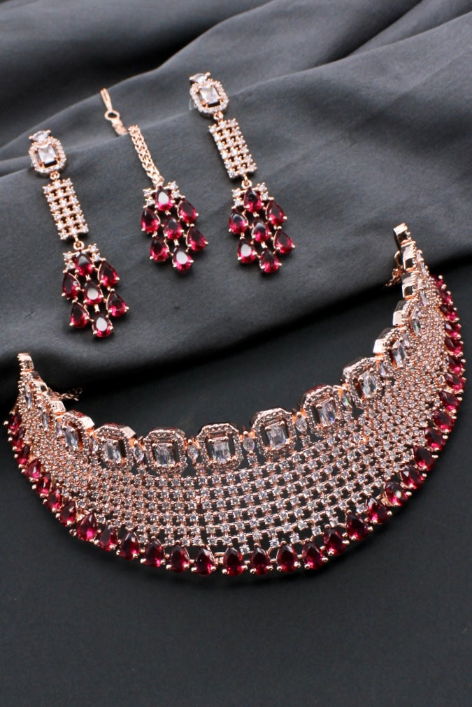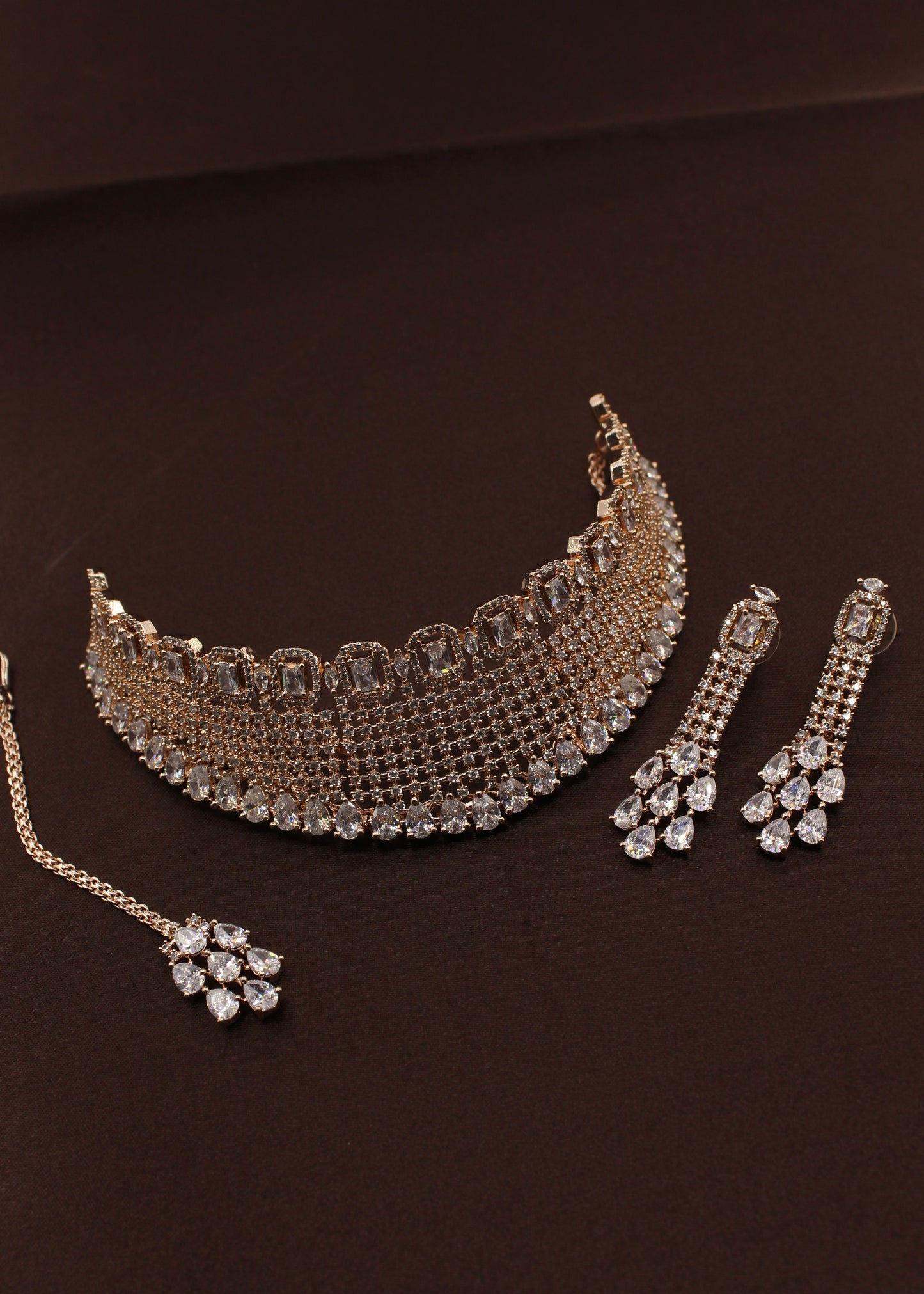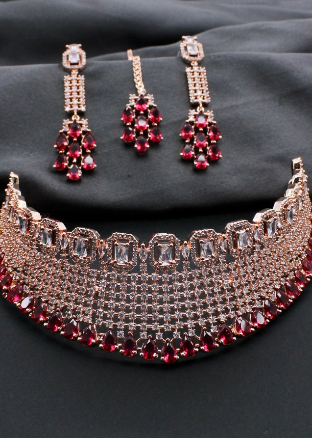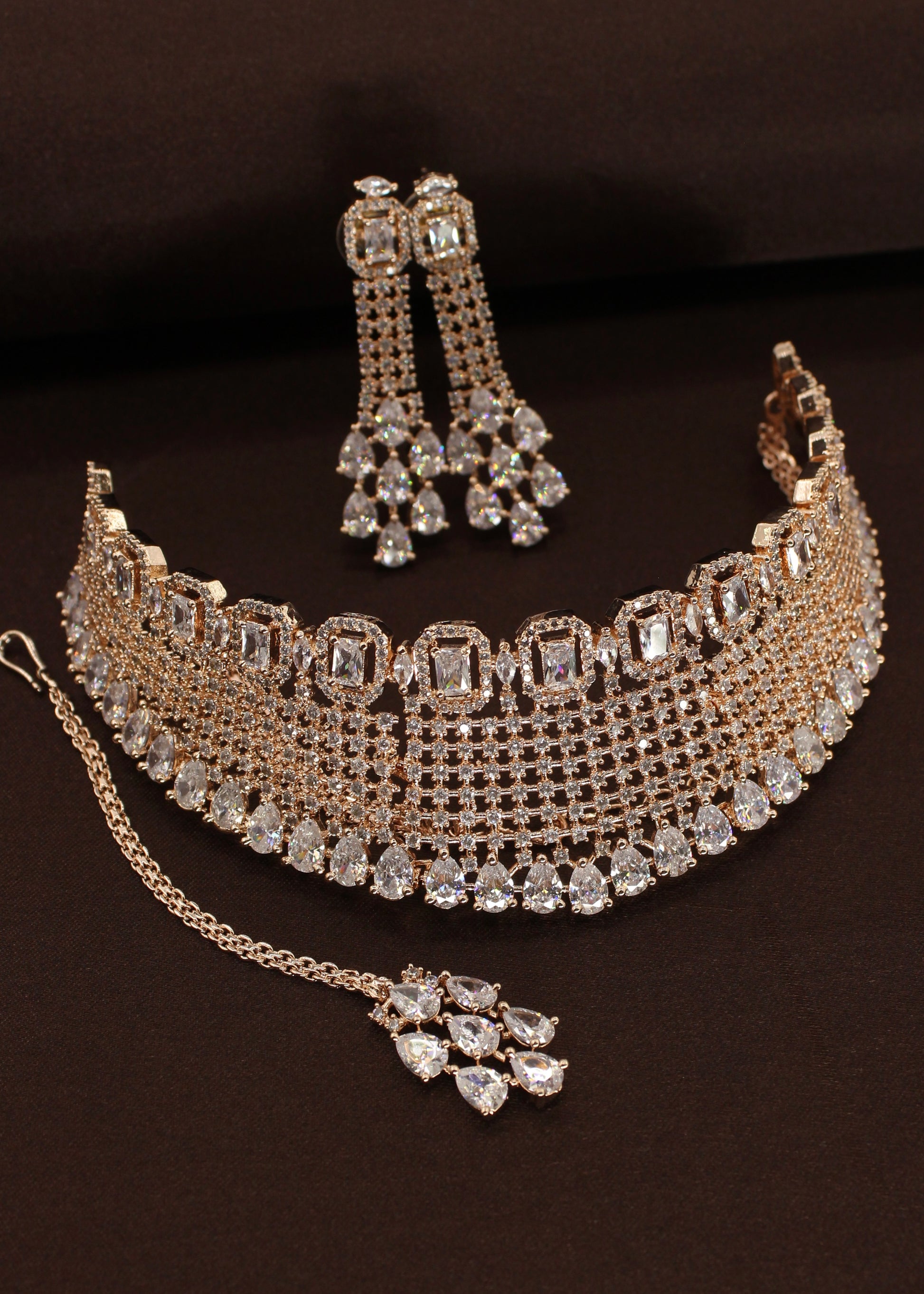 Style yourself by choosing this adorable Bridal necklace set from the collection of Sonchafa Jewellers. It is encrusted with white dia diamond stones and made from rose gold finish metal. The design of this necklsce is classy and worth noticing. Style this necklace with your wedding outfit and look outstanding.
