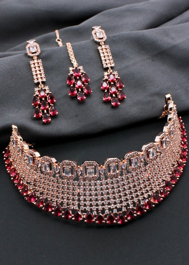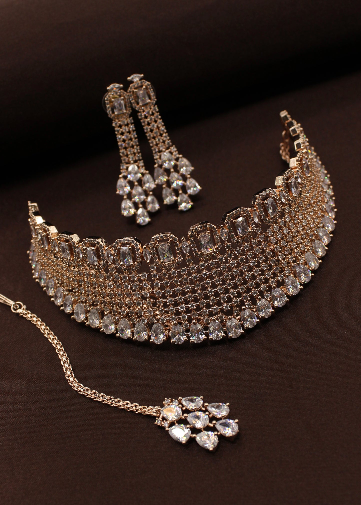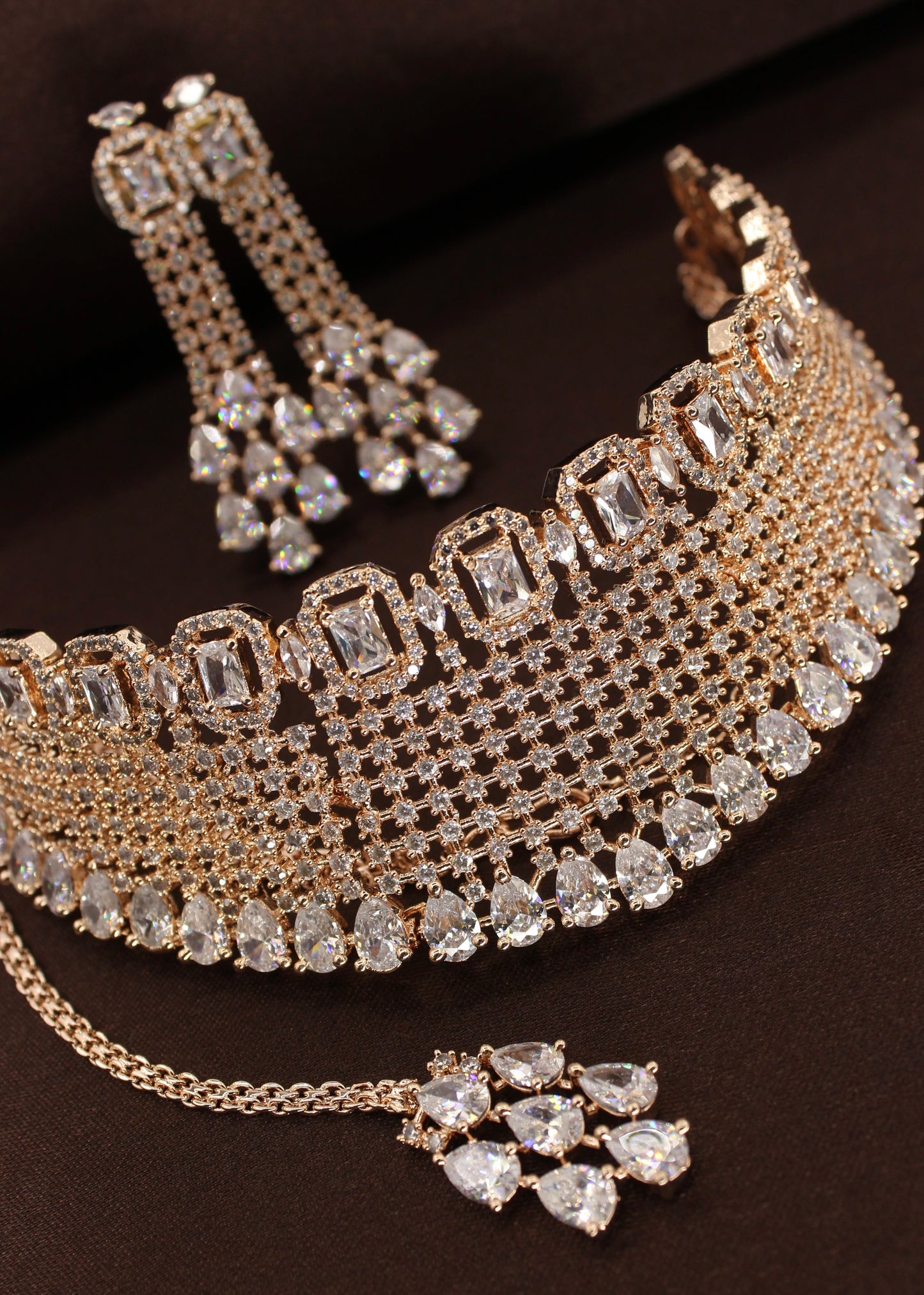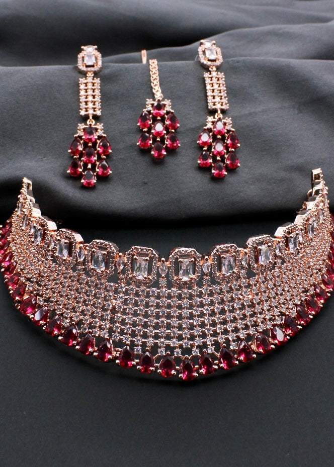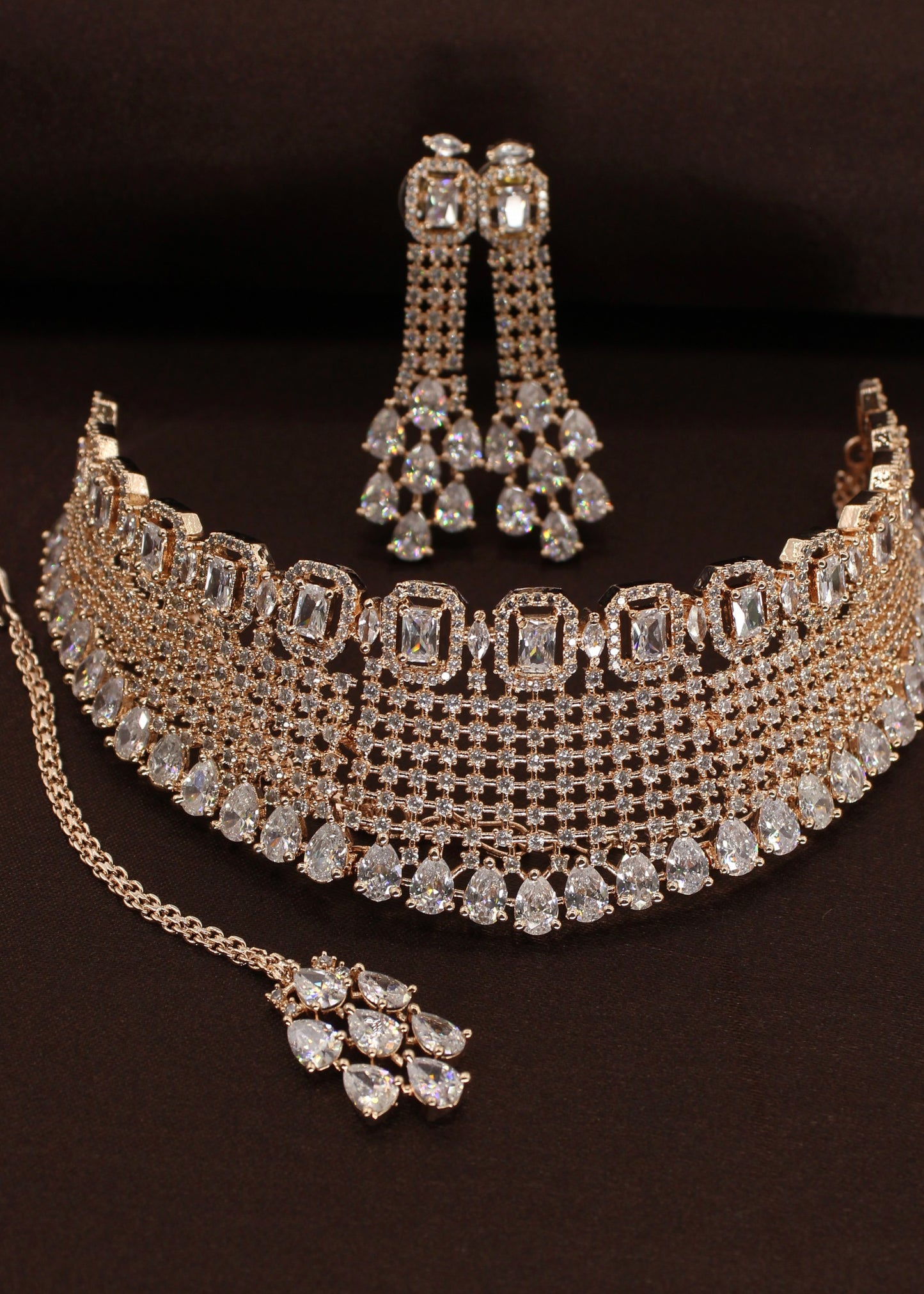 Style yourself by choosing this adorable Bridal necklace set from the collection of Sonchafa Jewellers. It is encrusted with white dia diamond stones and made from rose gold finish metal. The design of this necklsce is classy and worth noticing. Style this necklace with your wedding outfit and look outstanding.