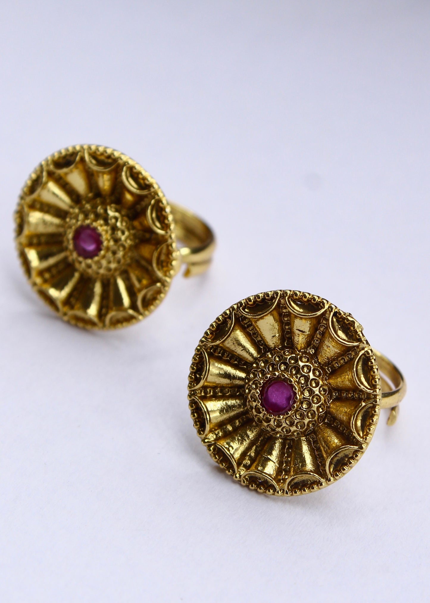 Make a unique addition to your accessory collection by adding this pair of floral designer bichave from Sonchafa Jewellery. They are encrusted with shimmering pink, golden stones and feature wonderful design. These bichave are fashioned from antique golden finish metal and ensure high durability.