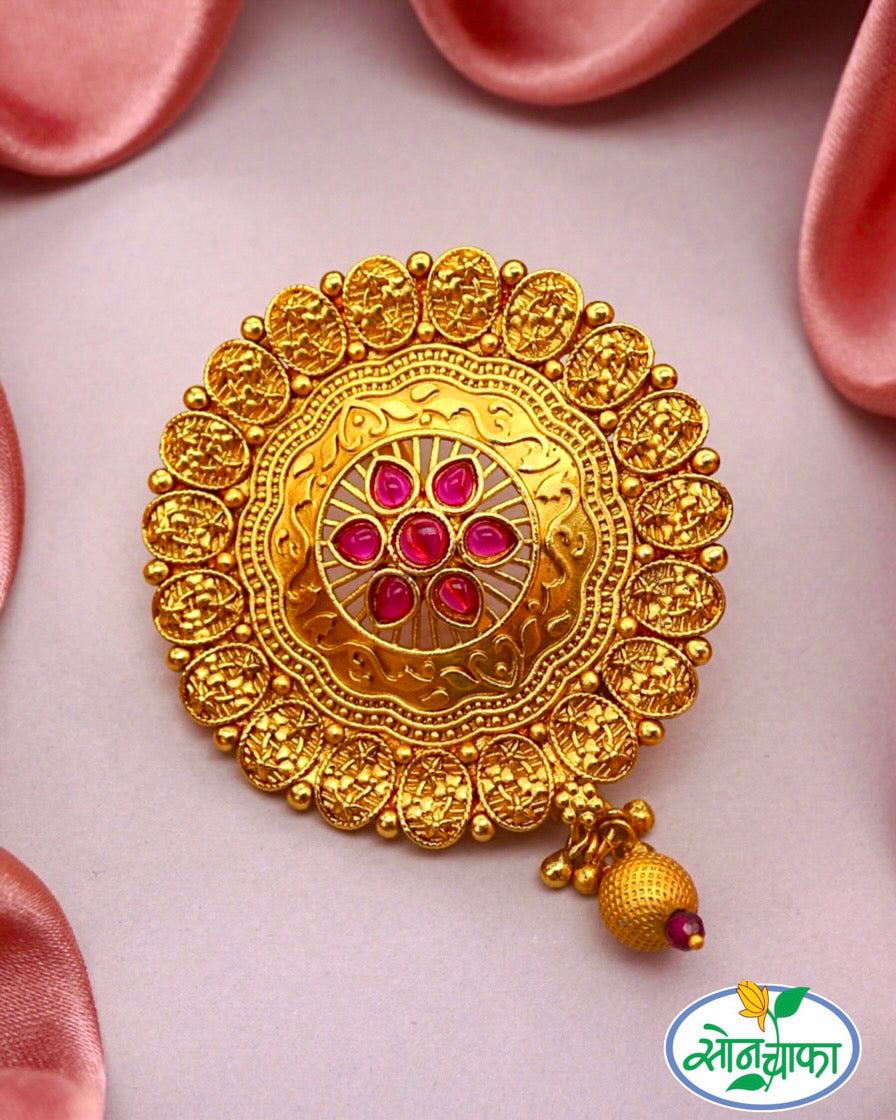 This wonderful classy round shape designer judapin form Sonchafa Jewellery for styled on hair. It Is studded pink stone along with beads and made from metal. This judapin is good in quality and will be your fashion companion for many years.