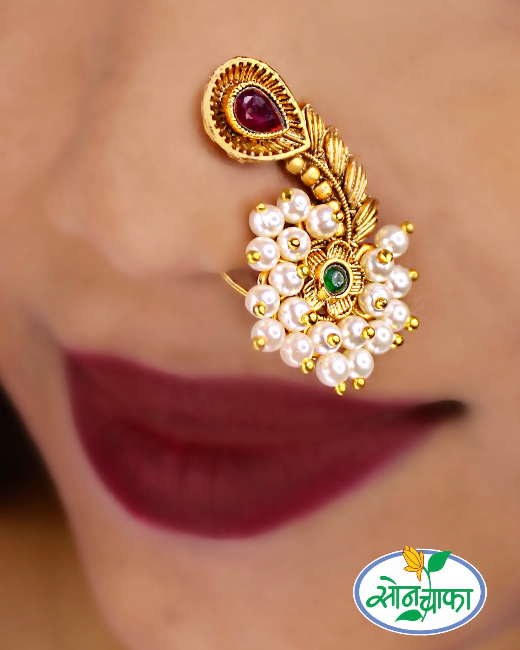 Sonchafa Jewellers offers this beautiful designer nath for women or girl who love to wear traditional accessory. It is studded with sparkling pink, green colour stone. This nath is fashioned from golden finish metal. It is long lasting and highly durable.