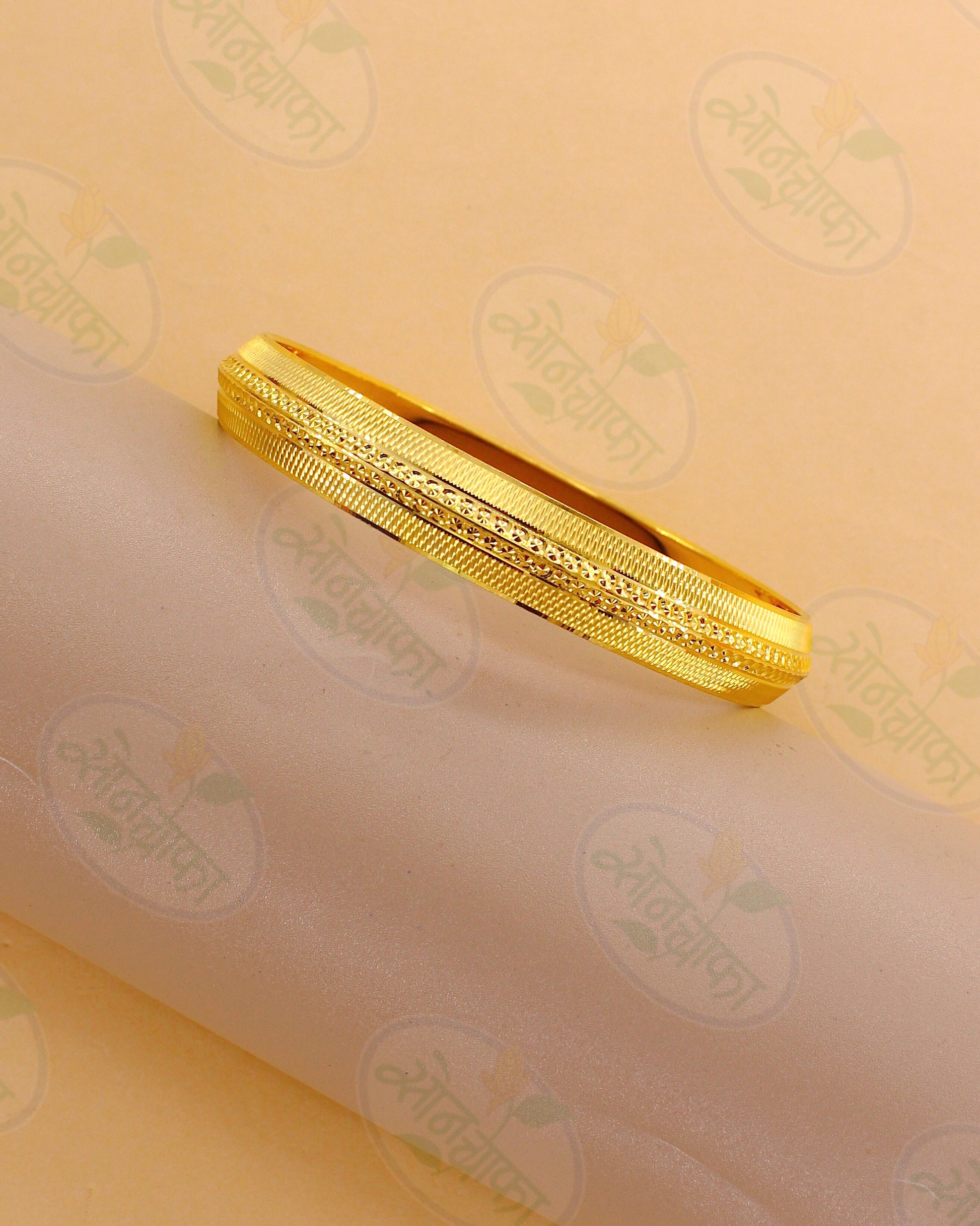 Adorn this attractive designer 1 Gram Gold plated Punjabi kada for men's with your casual outfits for a truly classic look. This beautiful kada from Sonchafa Jewellery is crafted from highly durable 1 gram gold plated metal. It is skin-friendly and long lasting.