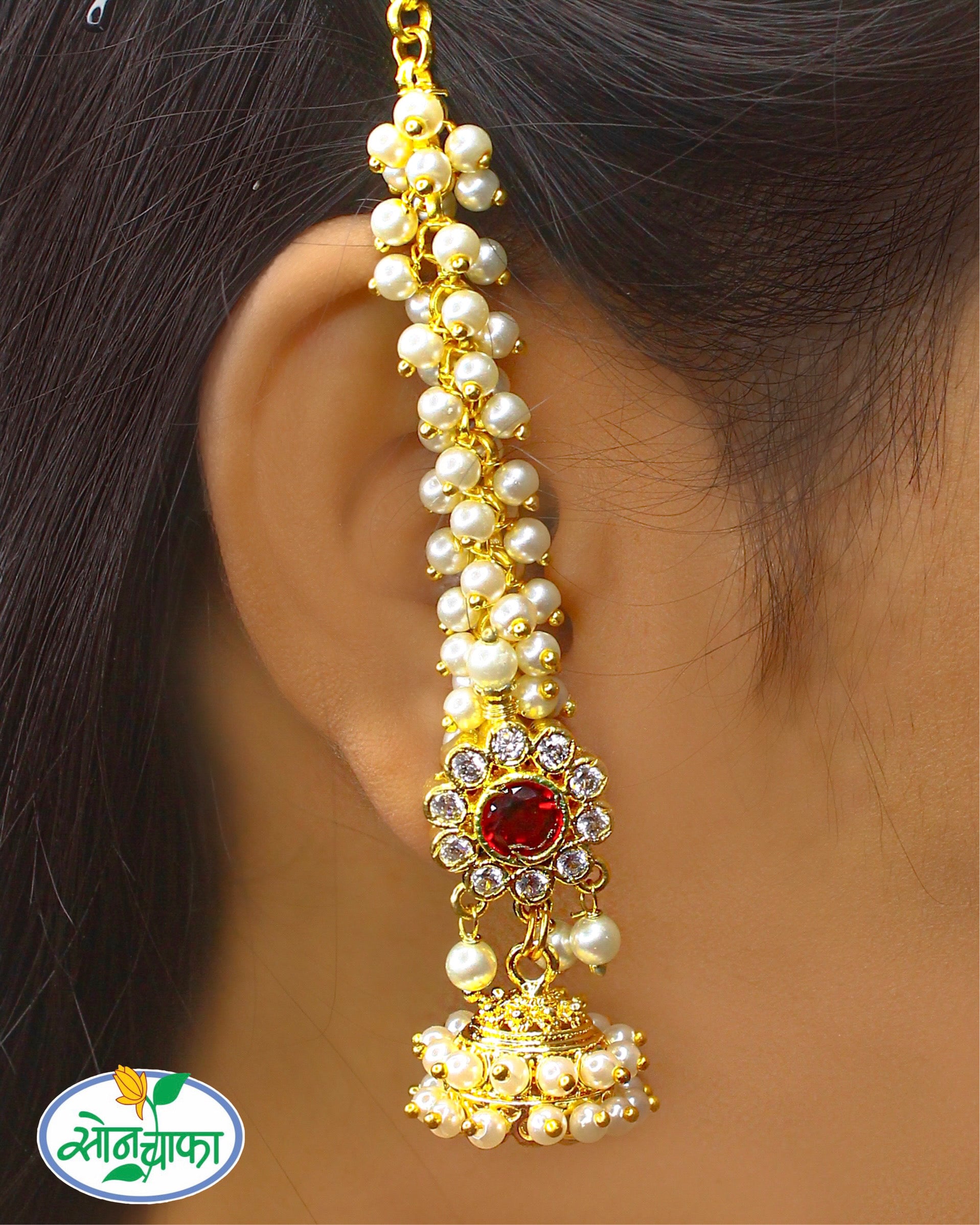 This adorable pair of ear-kanchain from Sonchafa Jewellery. These are decked with pink, white stones and crafted from golden finished metal. These kanchain are good in quality and high durability. Adorn these earrings with your casual outfits and turn many heads towards you.
