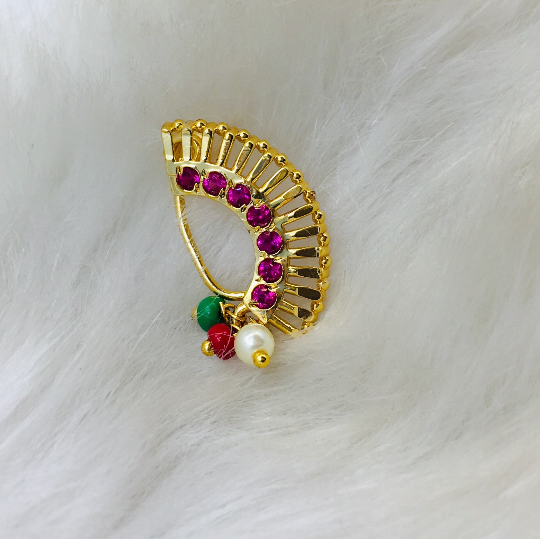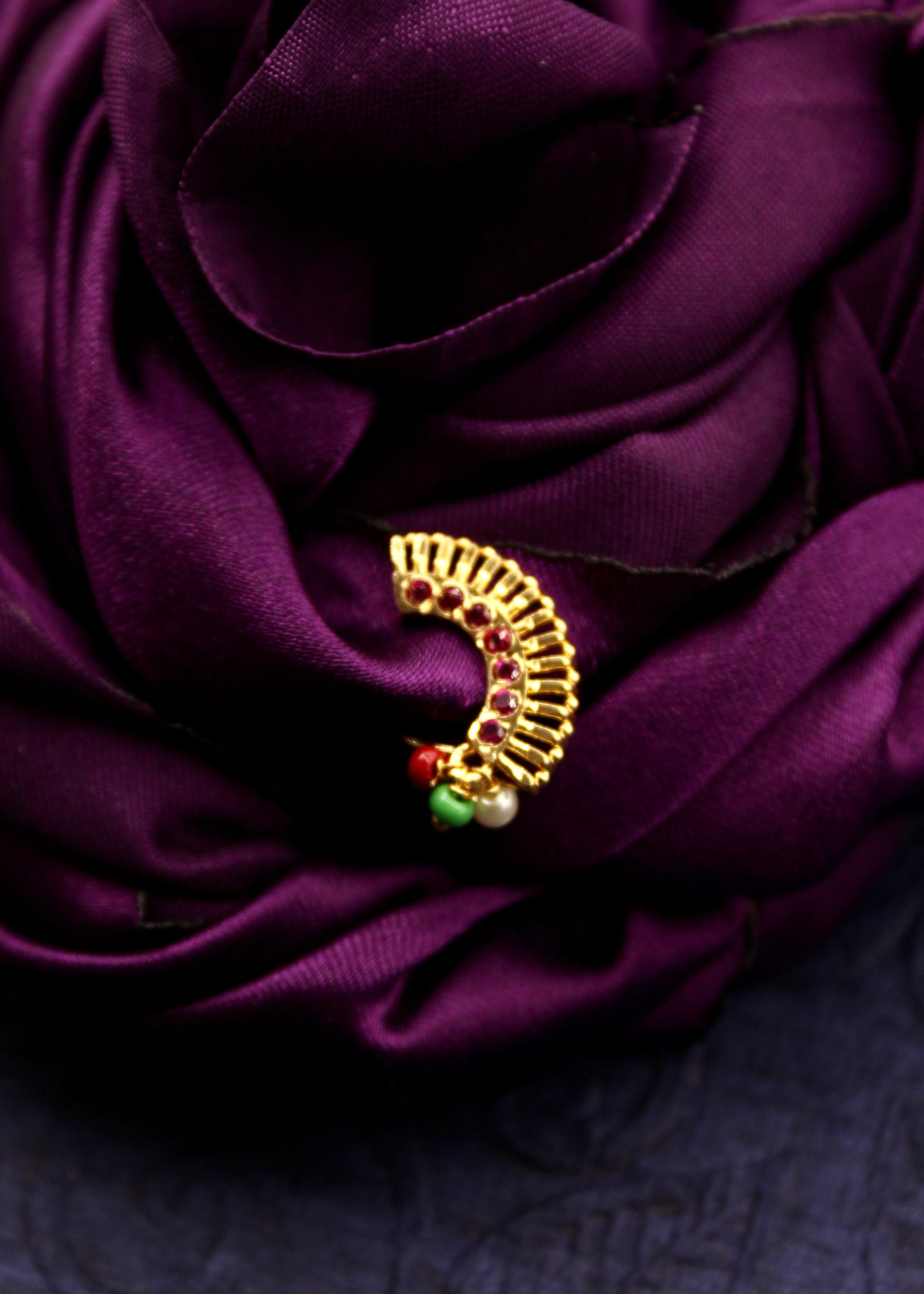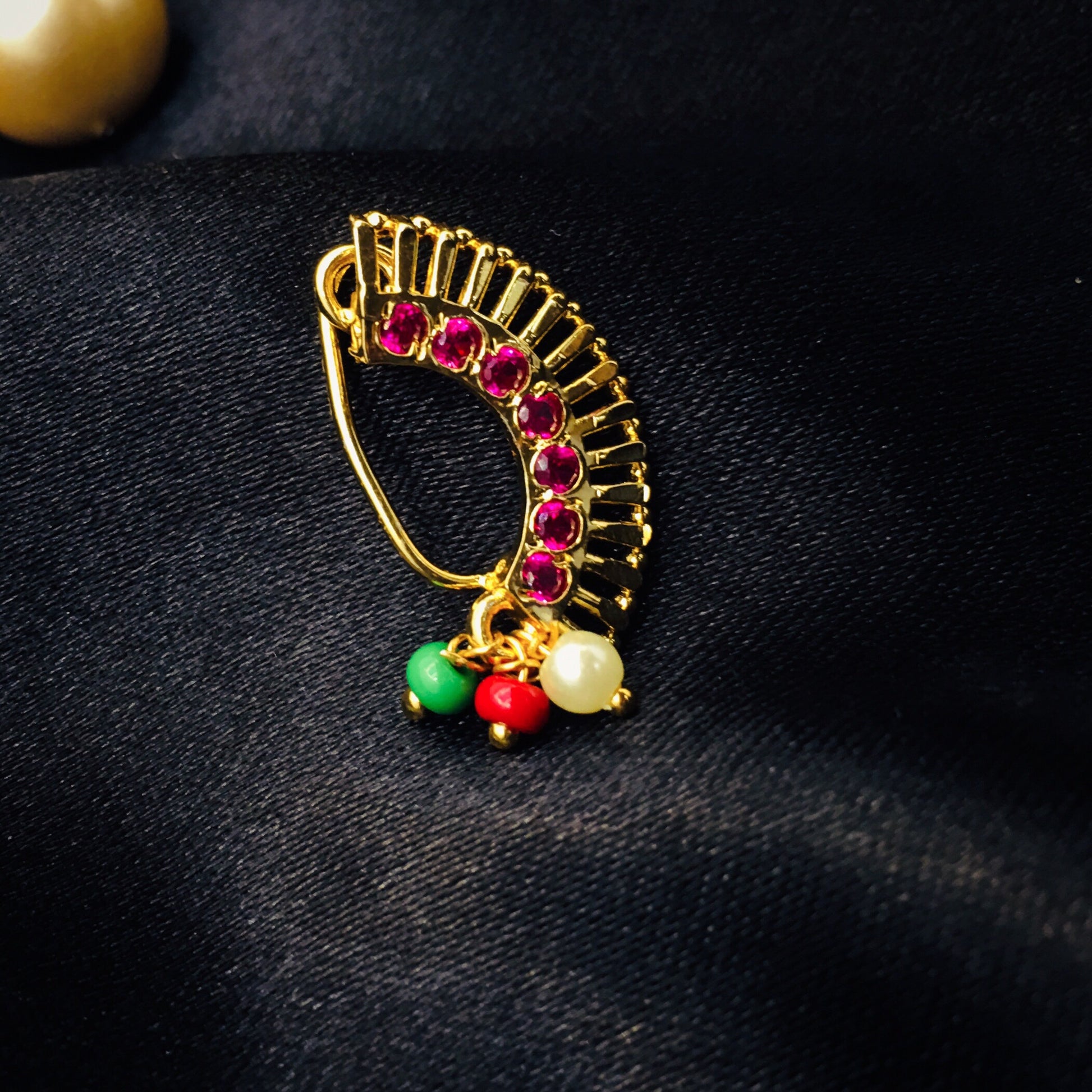 Try something different classy Maharashtrian Nath from Sonchafa Jewellery which is perfectly suitable for our traditional look. It is styled with studded sparkling pink stone along with beads and made from golden finish metal. This Nath has wonderful beads droplets for classy look.
