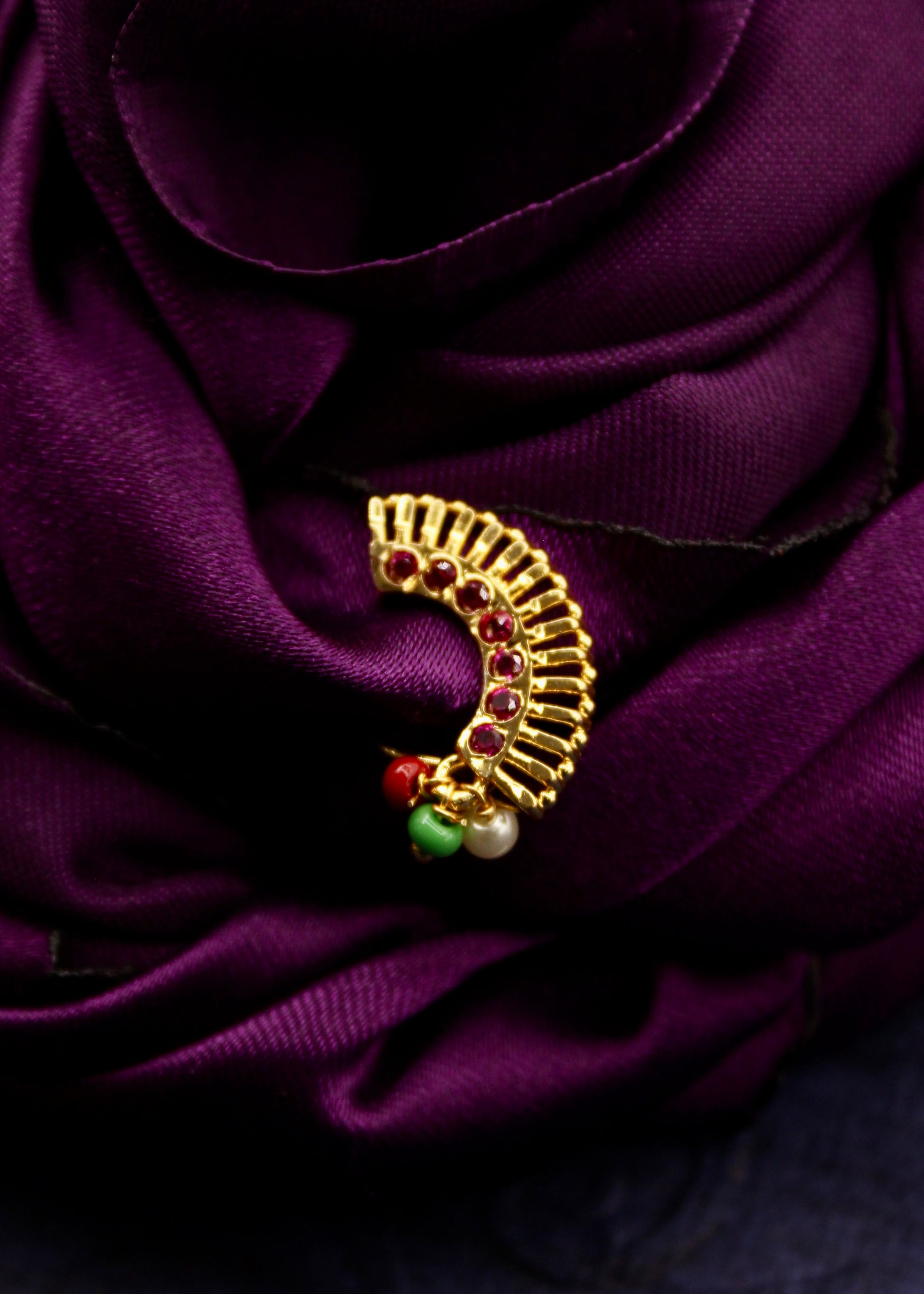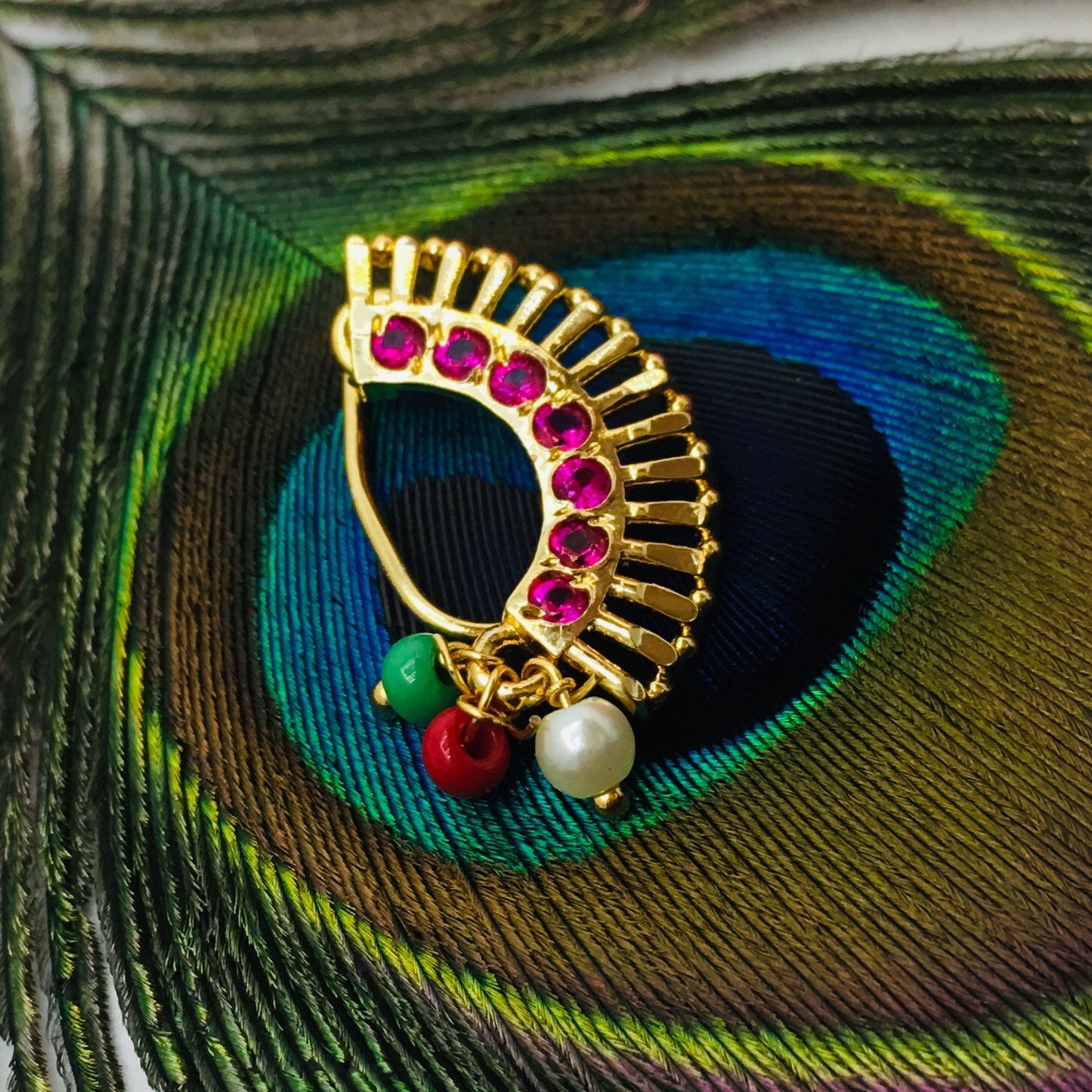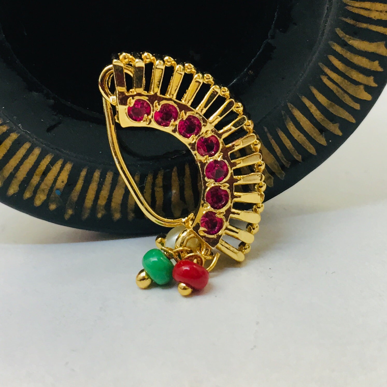 Try something different classy Maharashtrian Nath from Sonchafa Jewellery which is perfectly suitable for our traditional look. It is styled with studded sparkling pink stone along with beads and made from golden finish metal. This Nath has wonderful beads droplets for classy look.