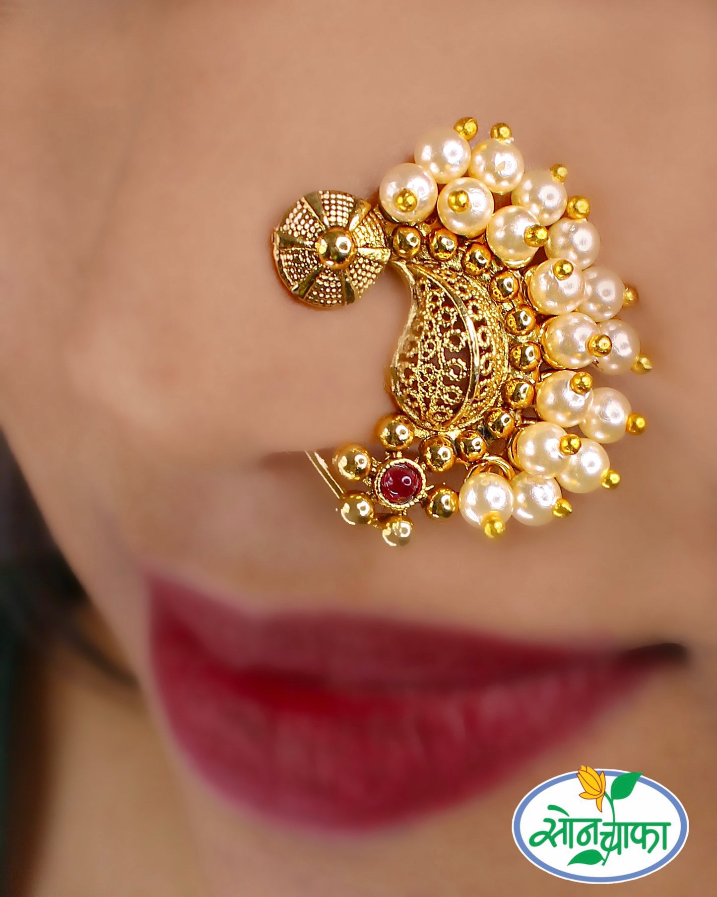 Buy something unique for yourself in the form of this attractive Maharashtrian nath from Sonchafa Jewellery. It is embedded with sparkling pink stones and woven with pearl beads. It will surely enhance your traditional look. It is long lasting and highly durable.
