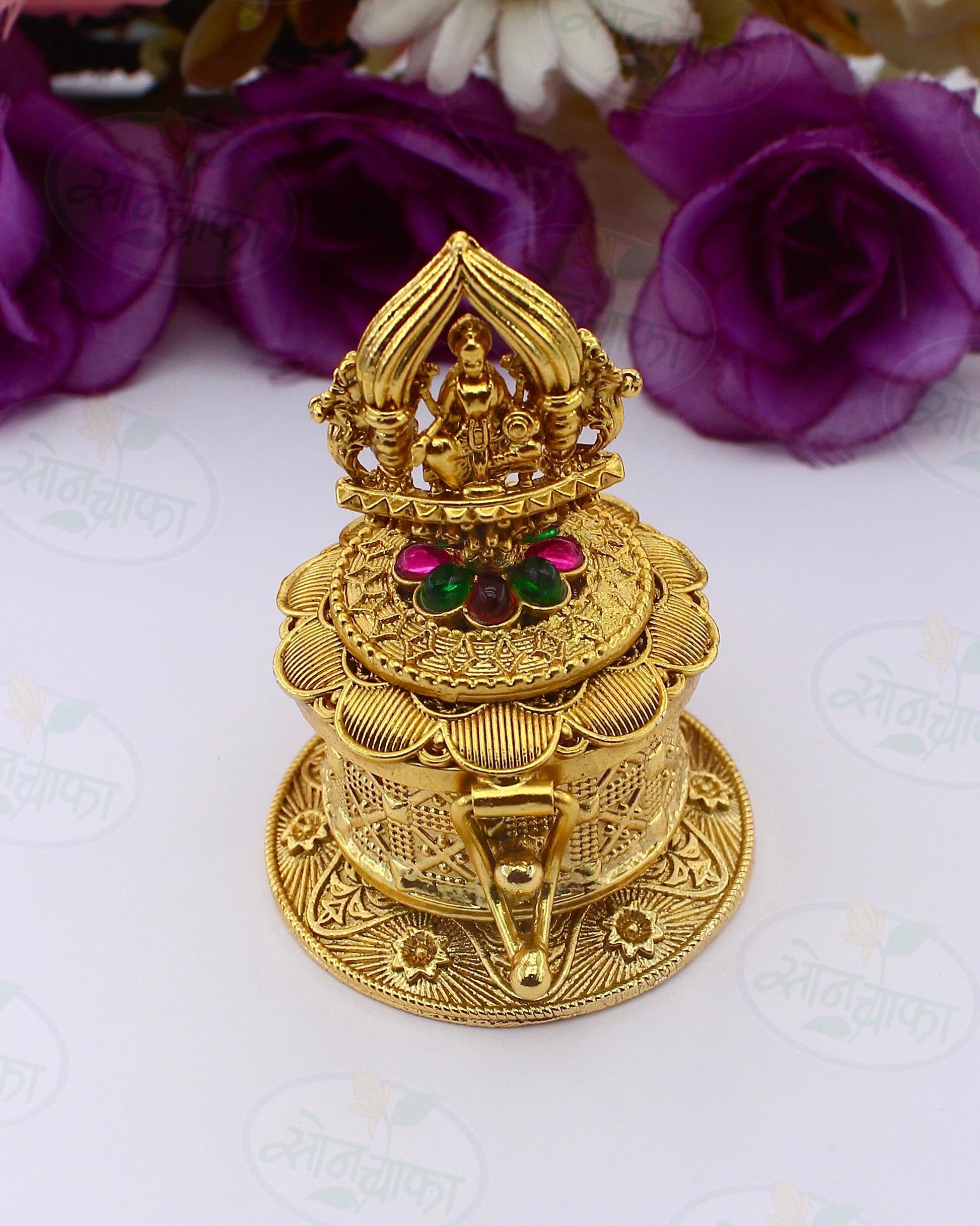 This dazzling antique gold finish sindoor box from sonchafa Jewellery will blow your heart at very first look.