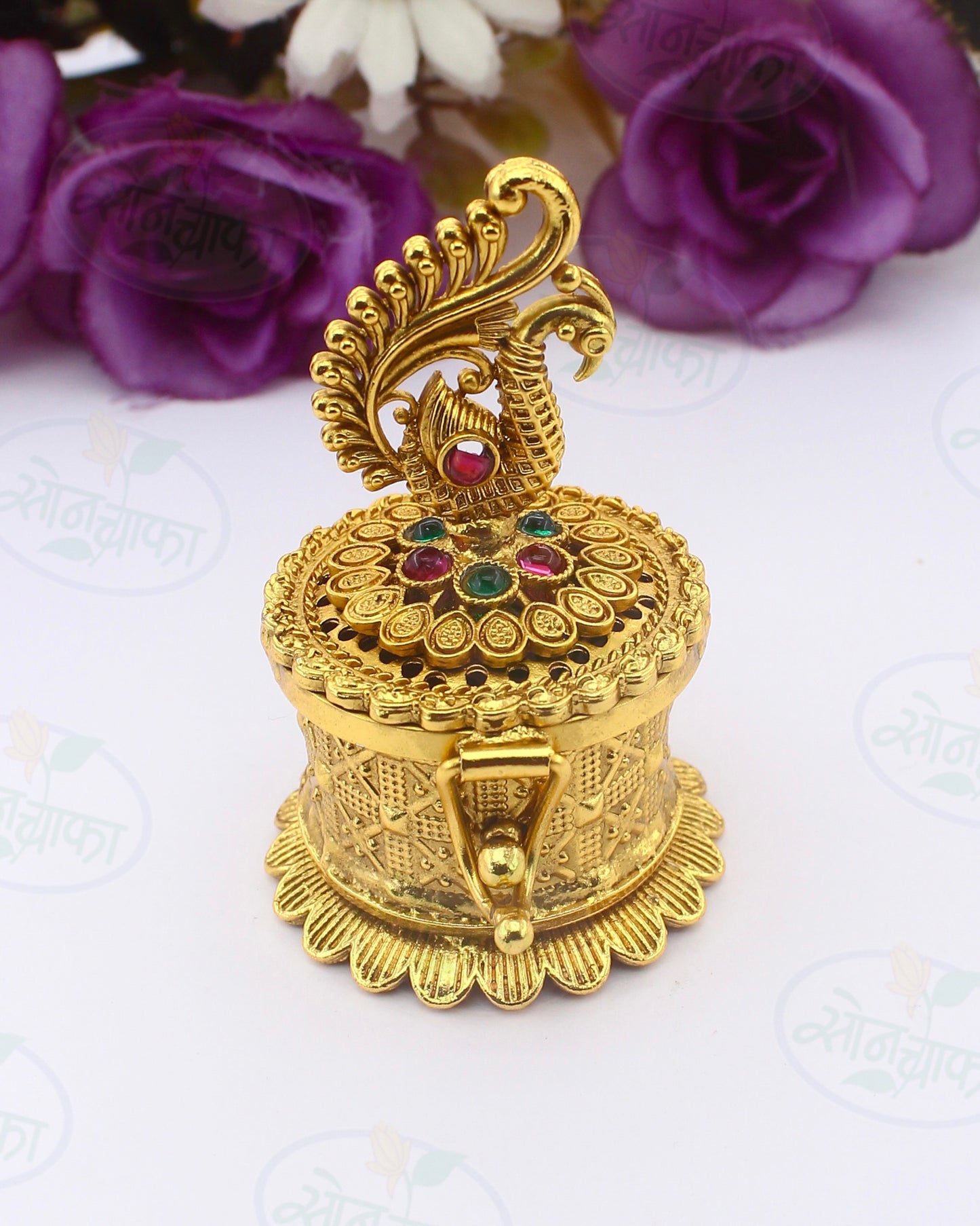 This dazzling antique gold finish sindoor box from sonchafa Jewellery will blow your heart at very first look