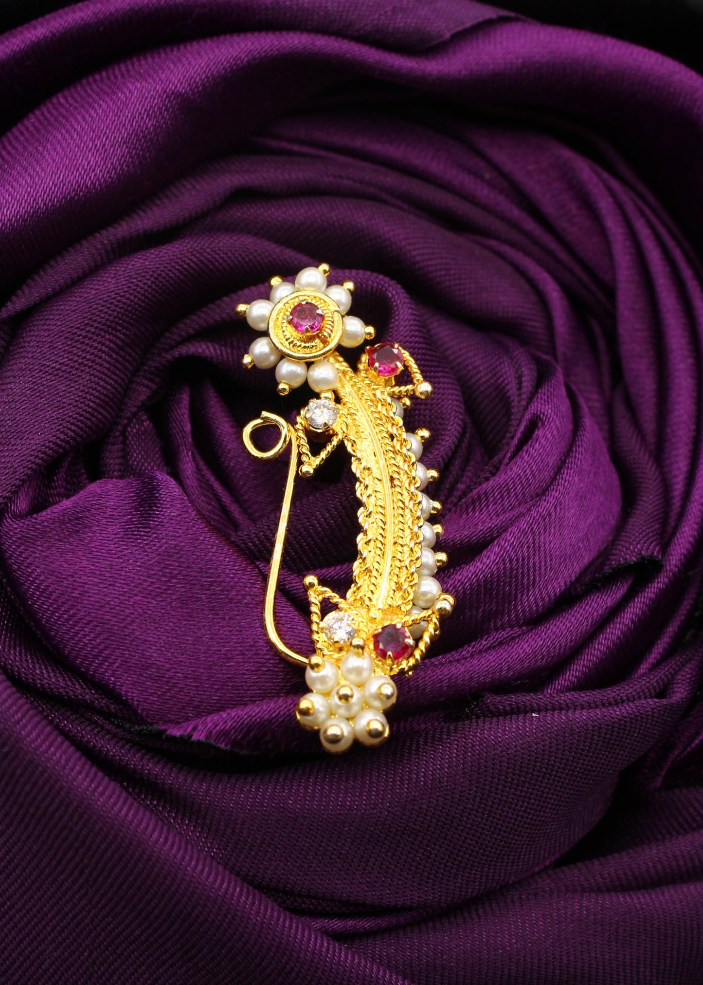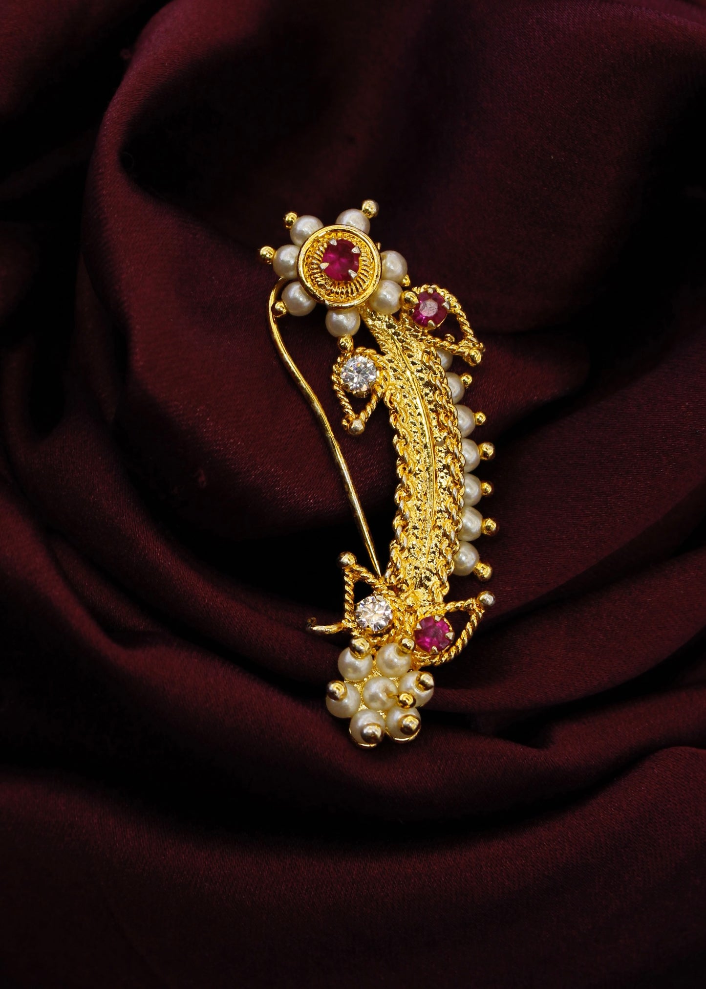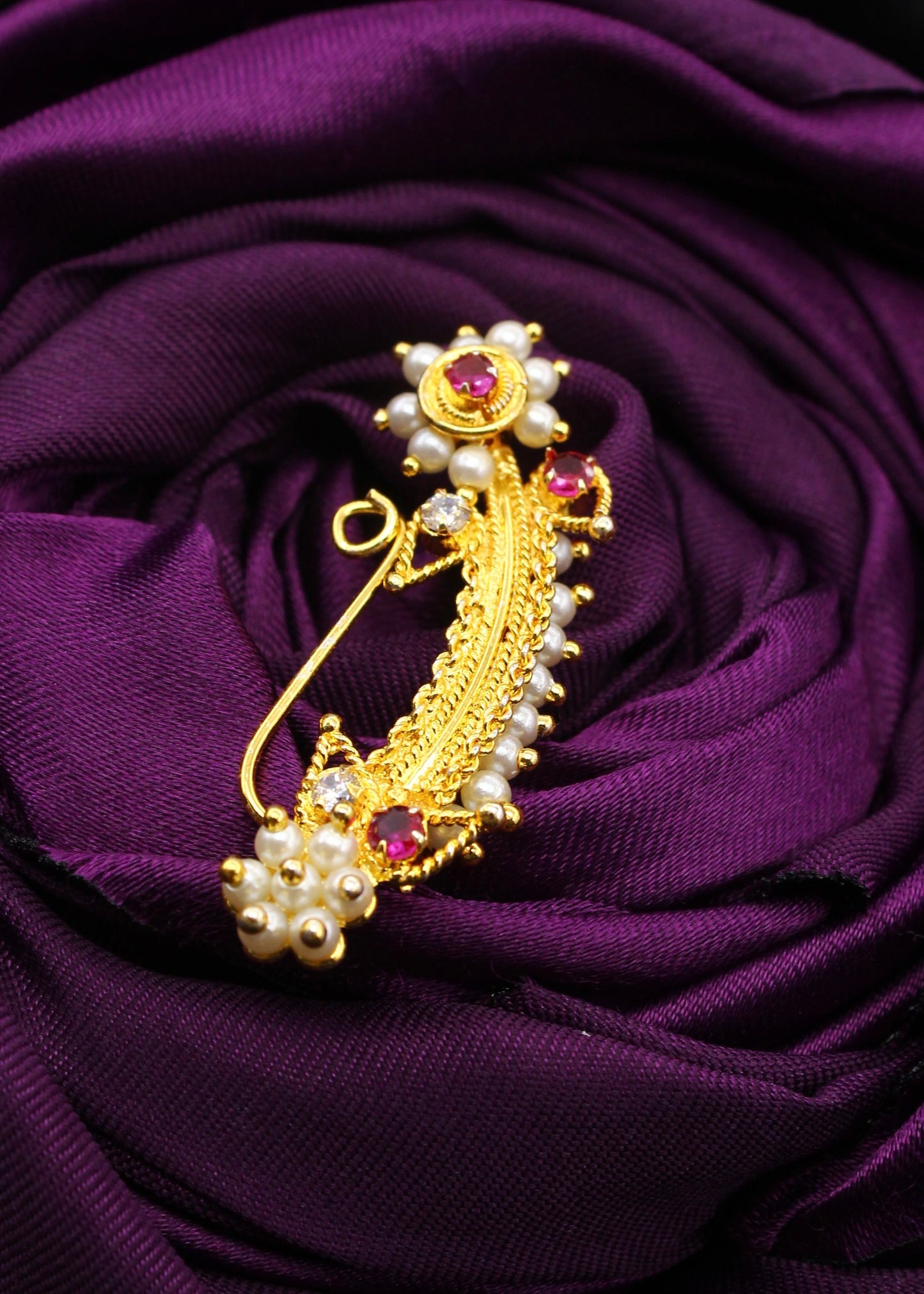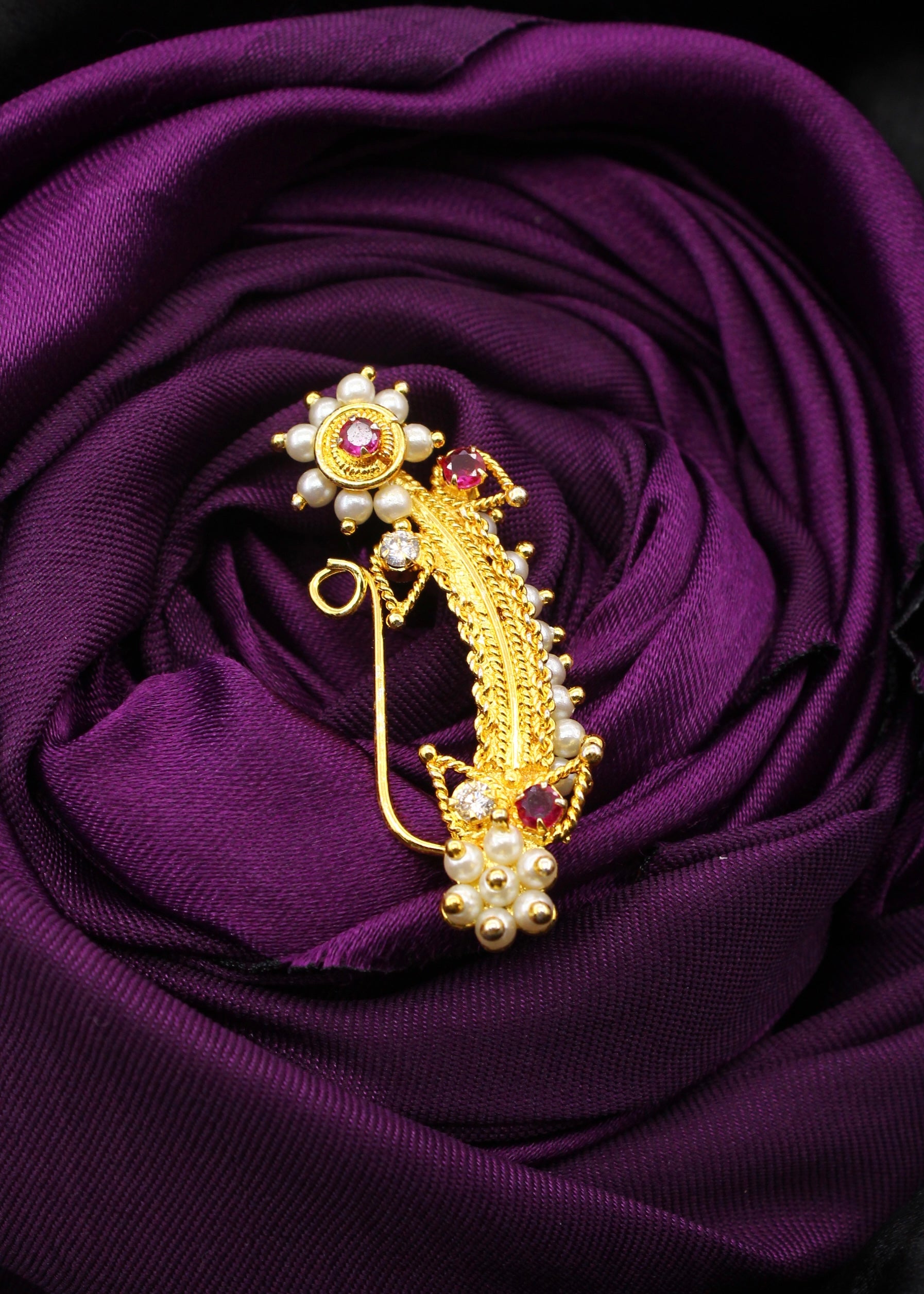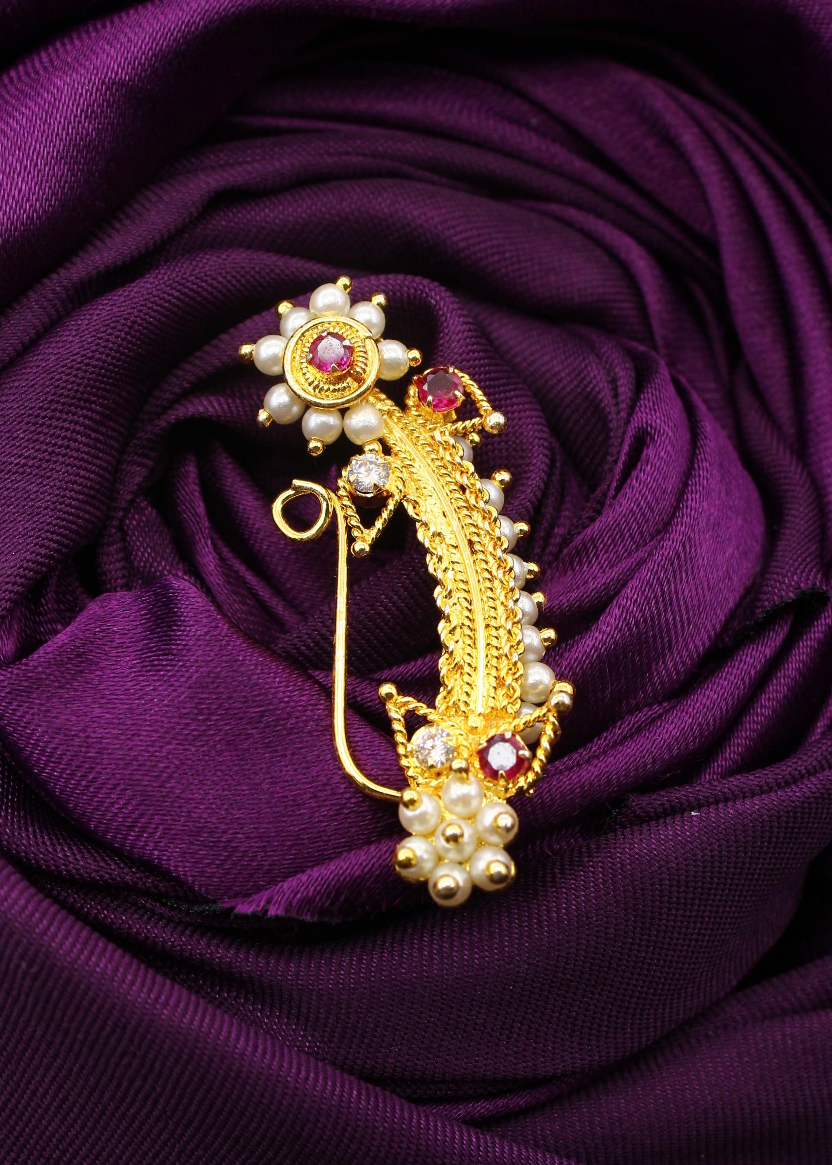 This festive Sonchafa Jewellery brings to you this designer Kashibai nath in classic look. It is studded with white-pink colour stones and woven with pearl beads. This nath is made from golden finish metal and requires piercing. So buy now!