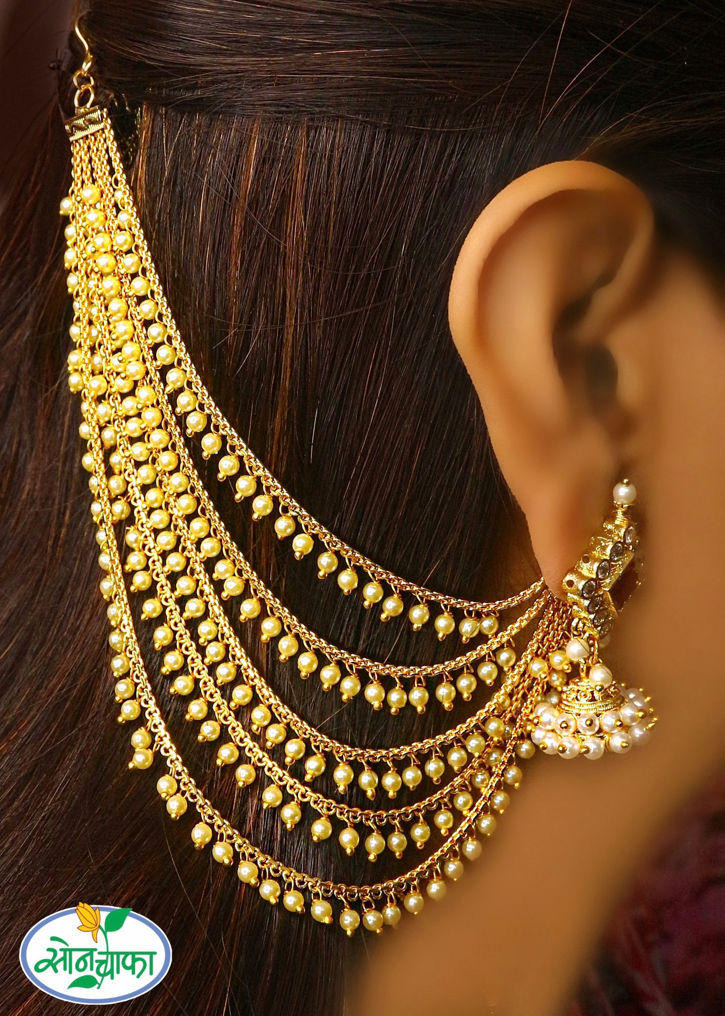 Upgrade your jewellery drawer by adding this pair of five layer kanchain from Sonchafa Jewellery. They are fashioned from golden finish metal and ensure high durability. These ear chains will fetch lots of compliments from onlookers for your amazing choice.