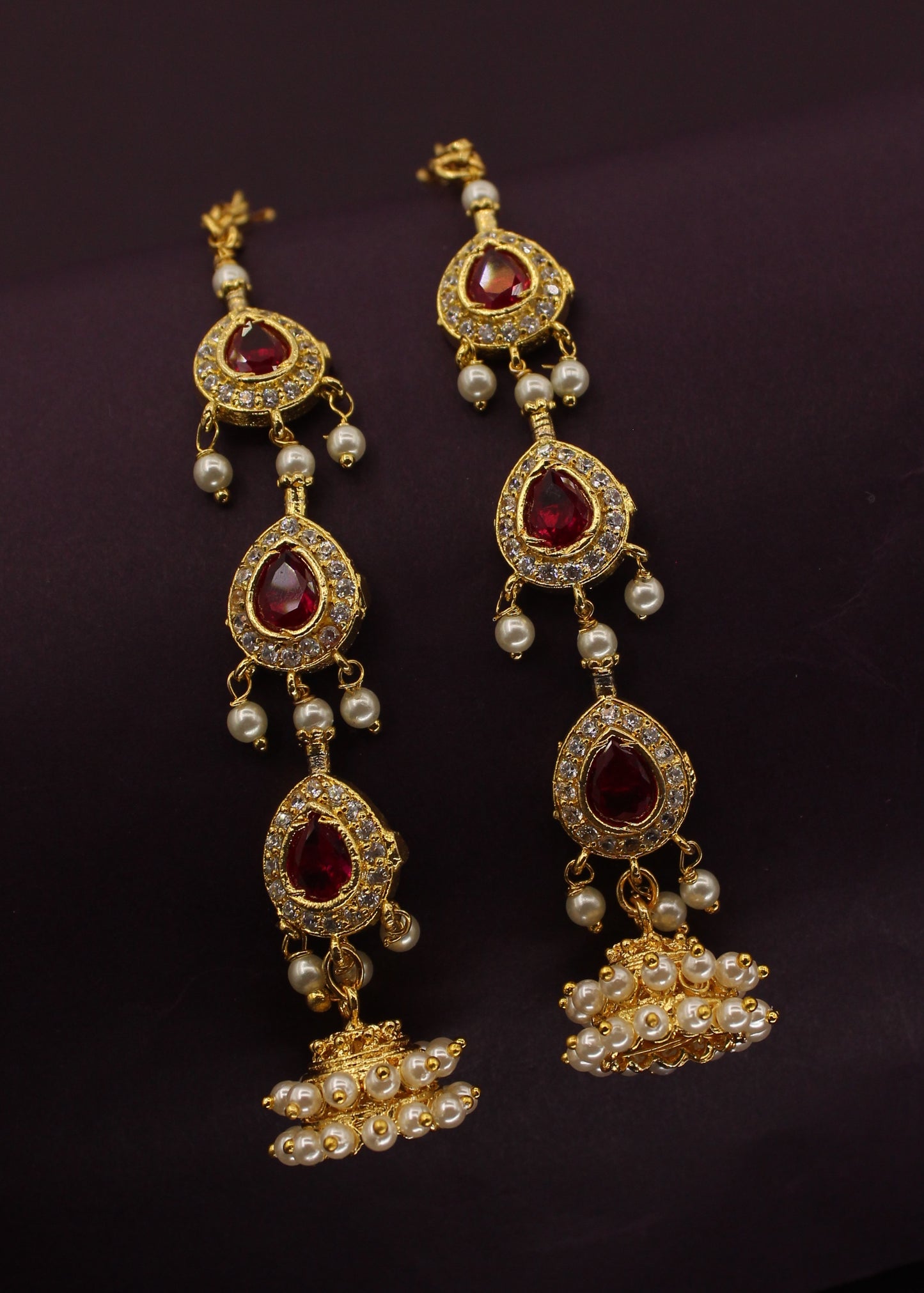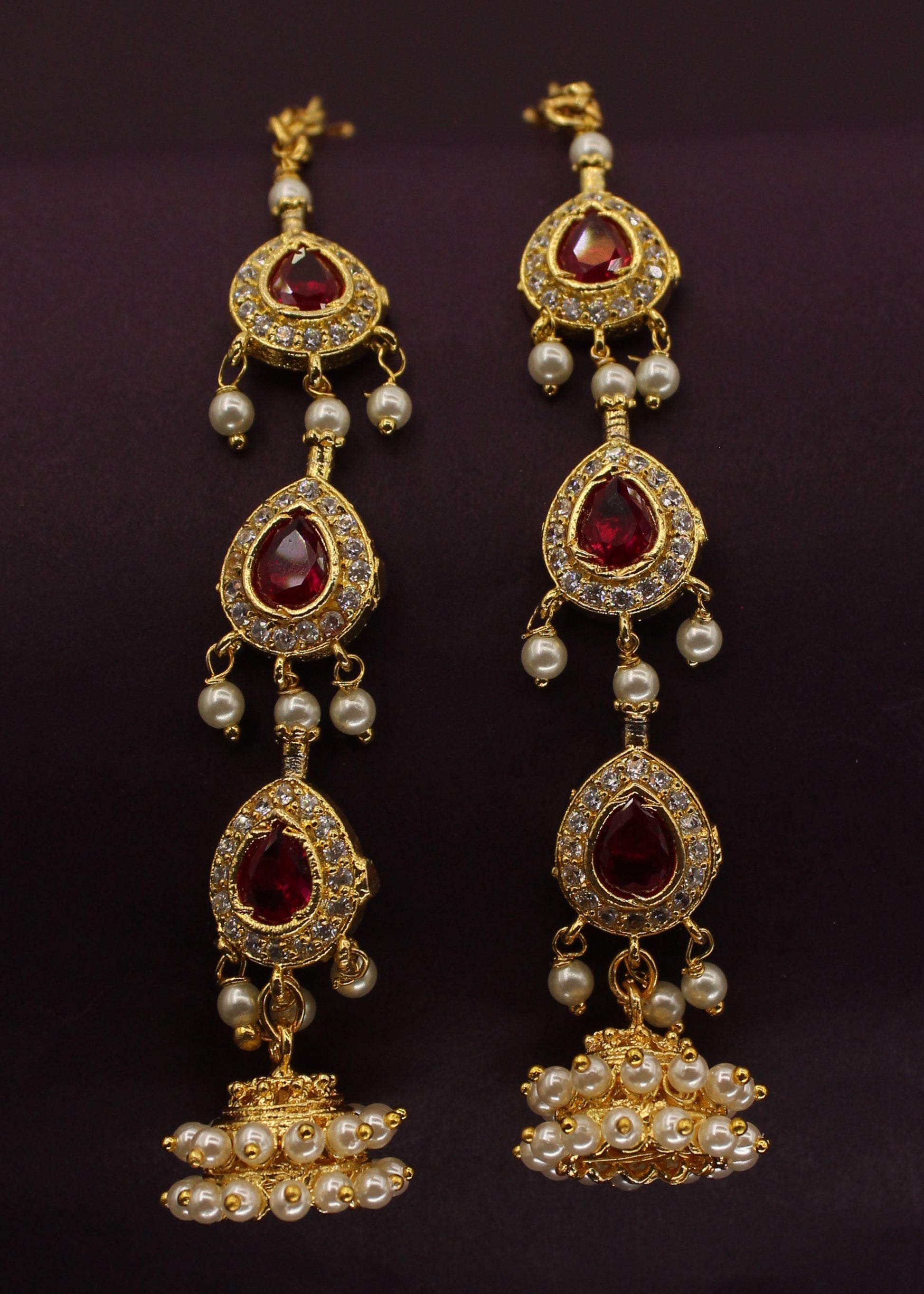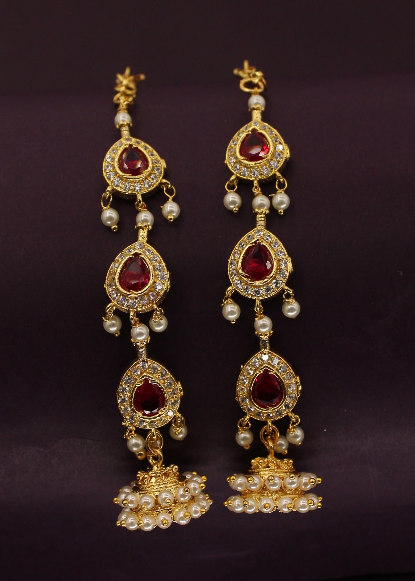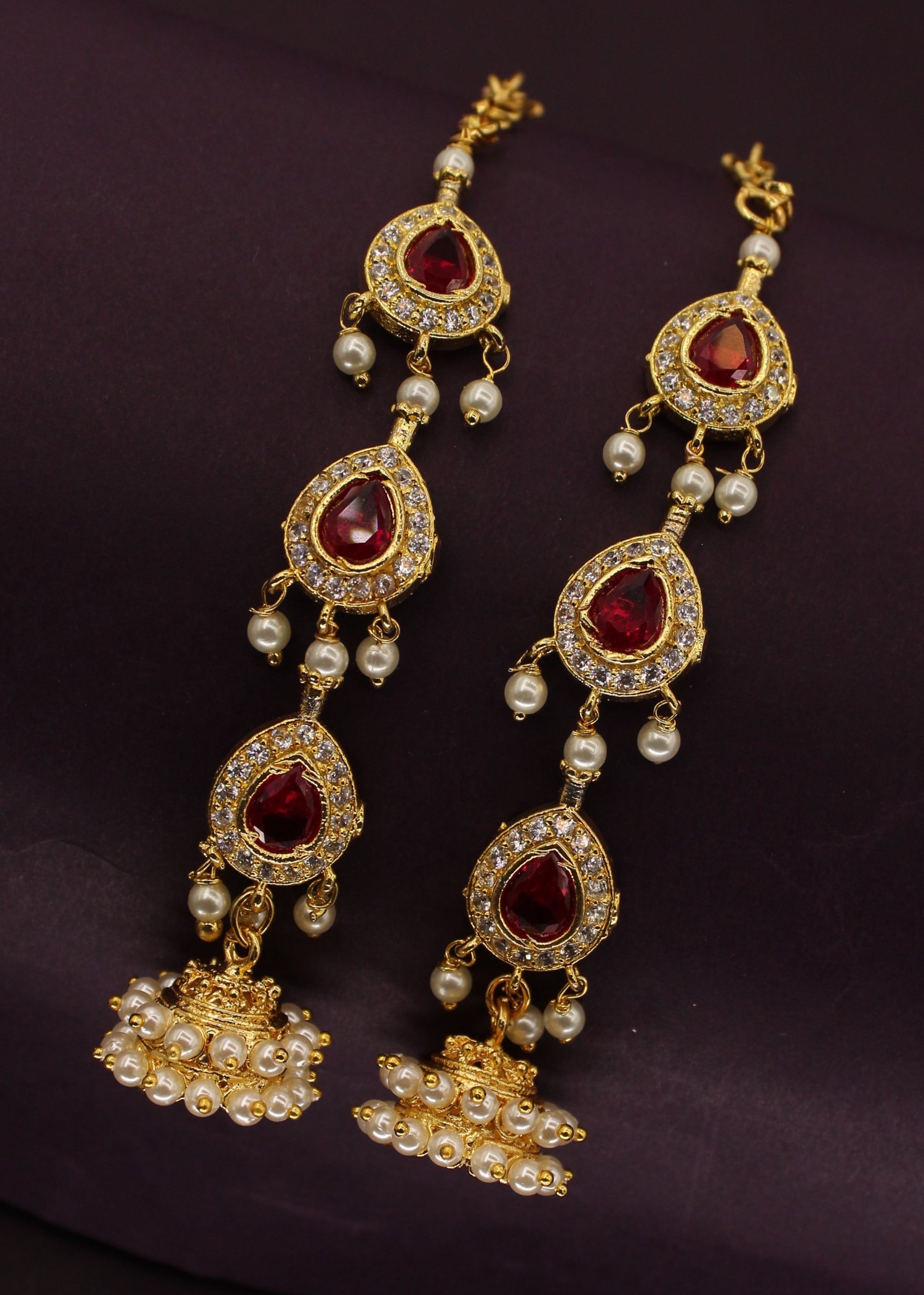 This adorable pair of ear-kanchain from Sonchafa Jewellery. These are decked with pink, white stones and crafted from golden finished metal. These kanchain are good in quality and high durability. Adorn these earrings with your casual outfits and turn many heads towards you.
