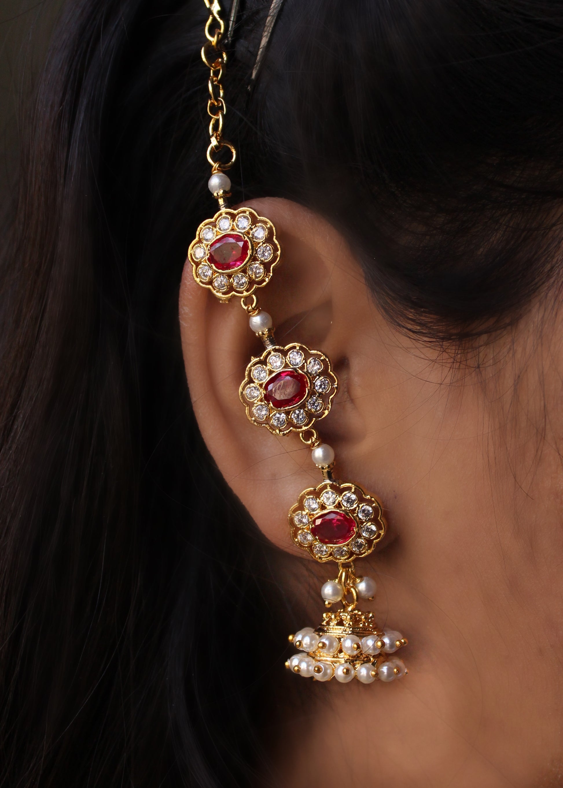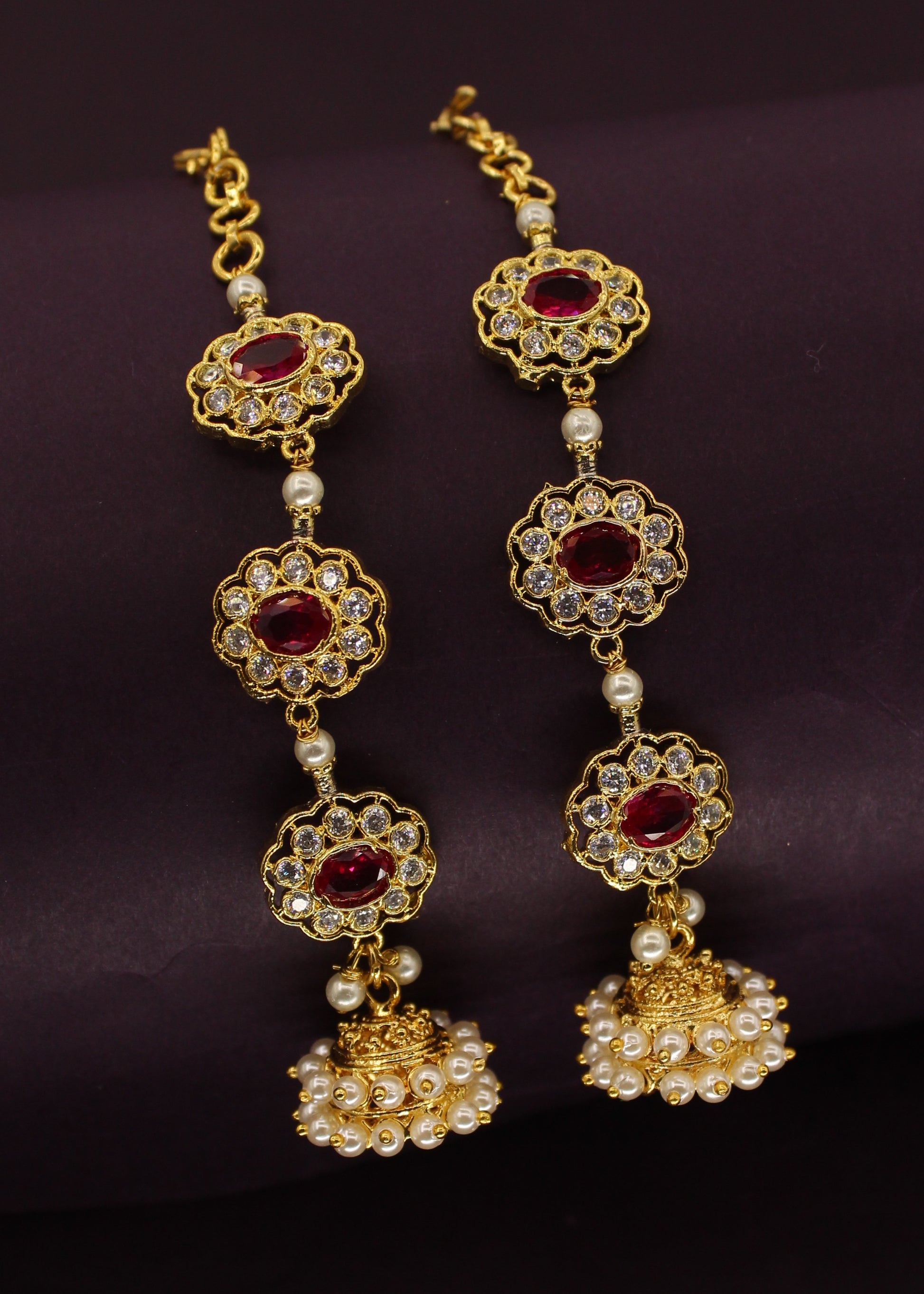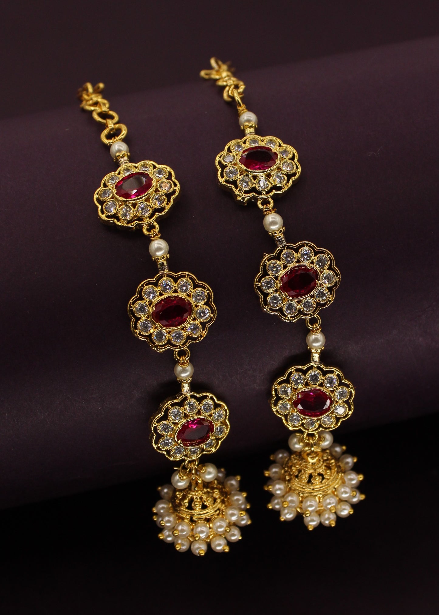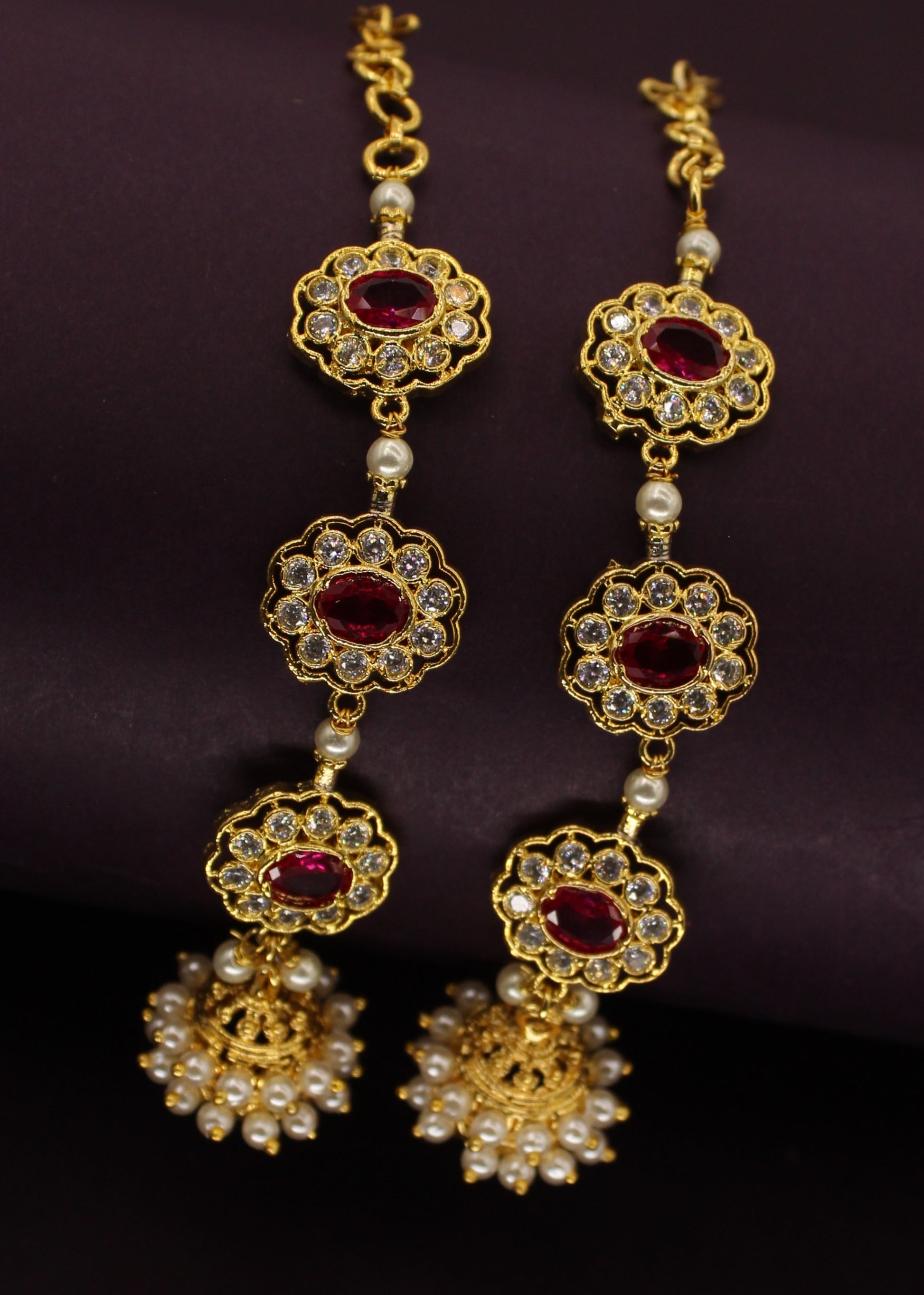 Have a look at this appealing jhumka kanchain earrings from Sonchafa Jewellery for stylish women like you. It is styled with studded pink, white stone and wonderfully crafted with golden finish metal. These kanchain are woven with pearl beads for added attraction. These are long lasting and skin-friendly as well.