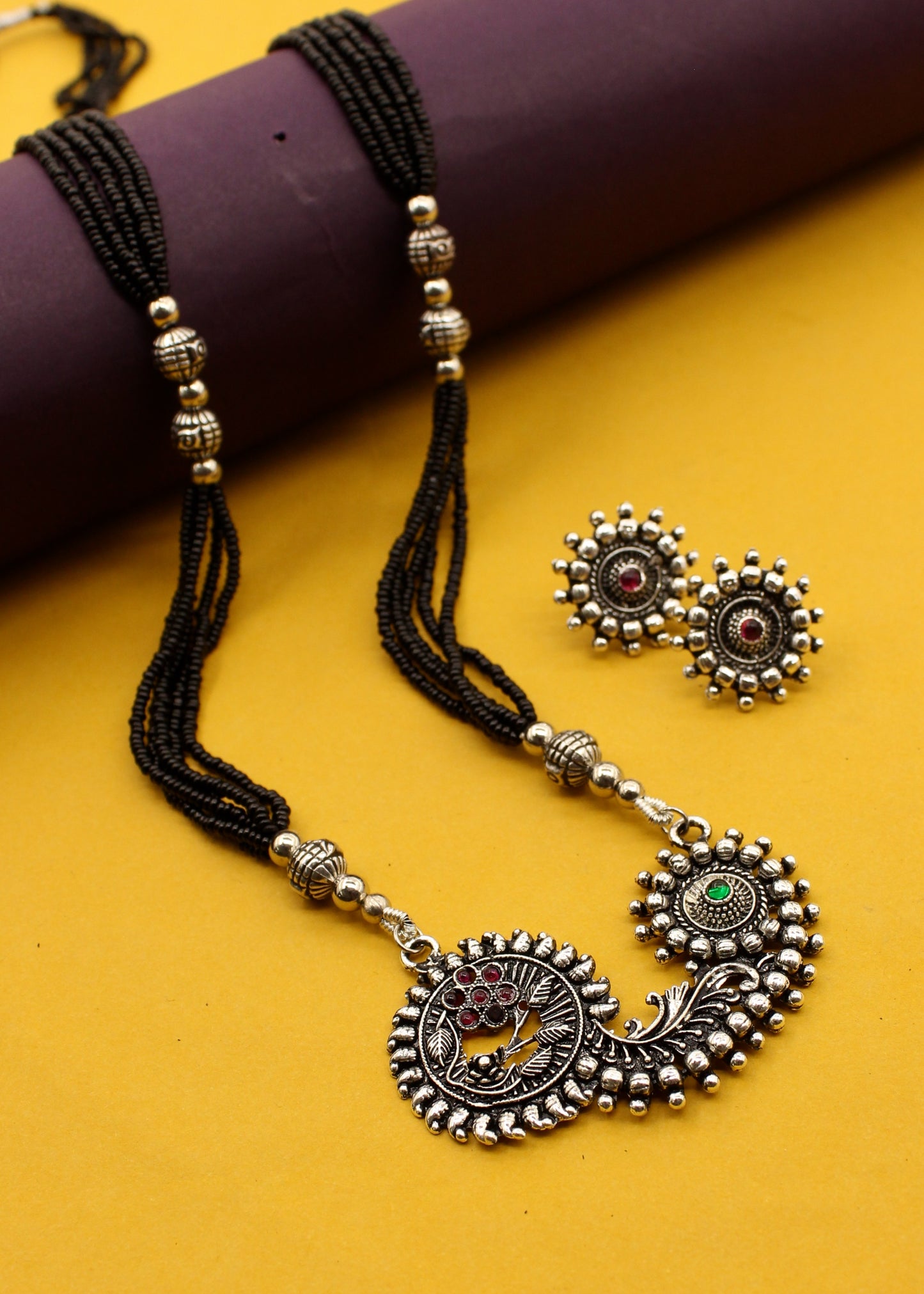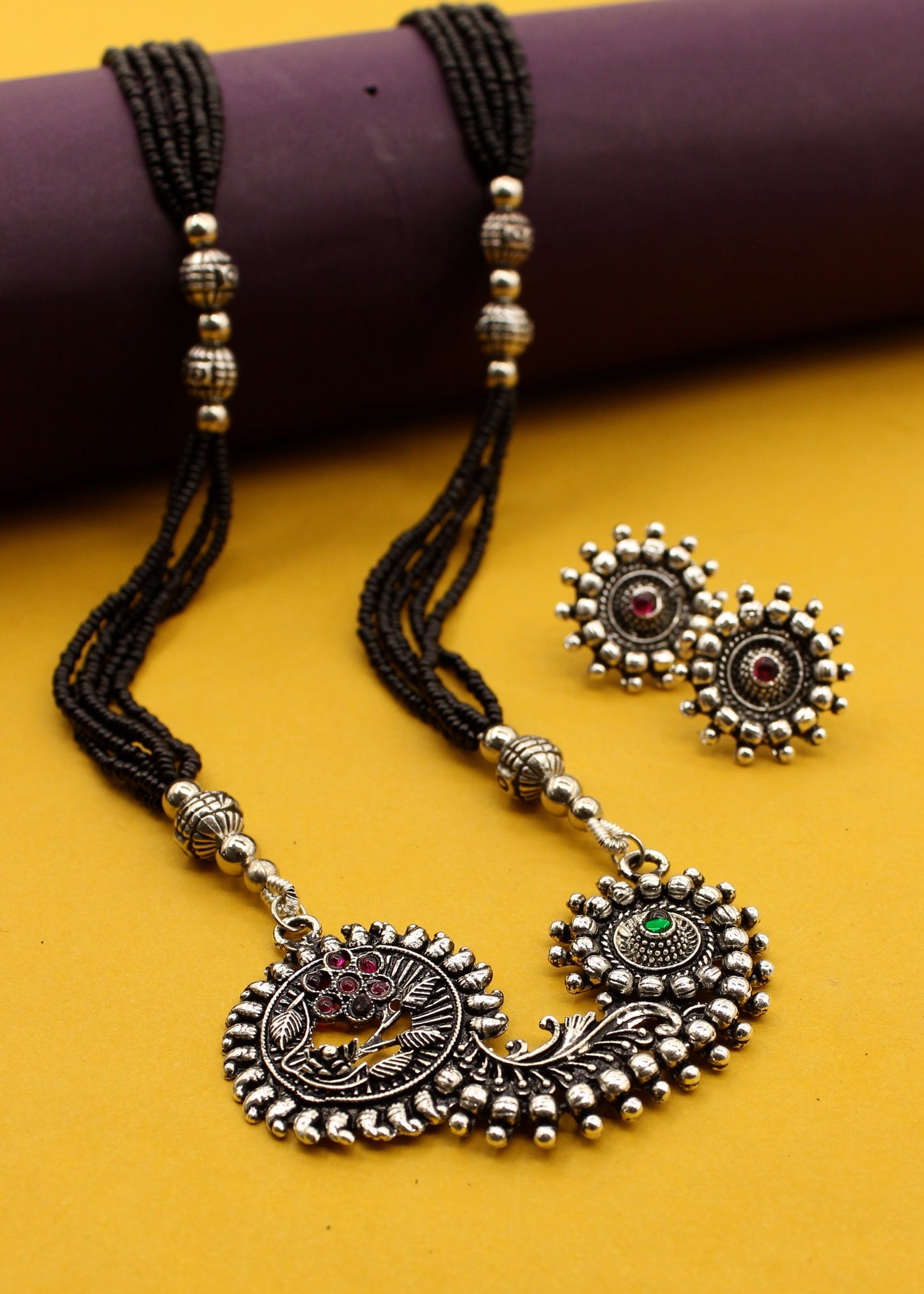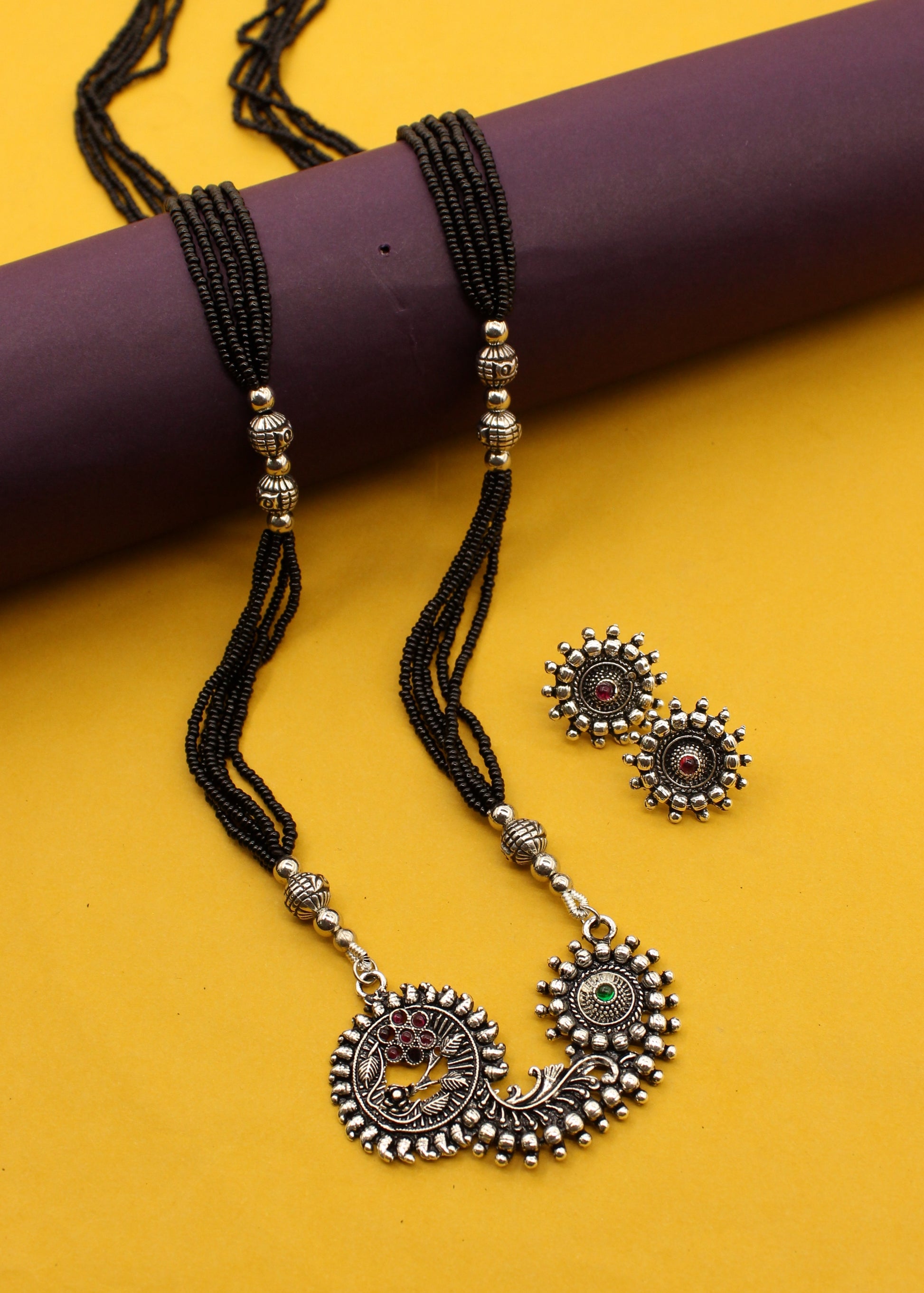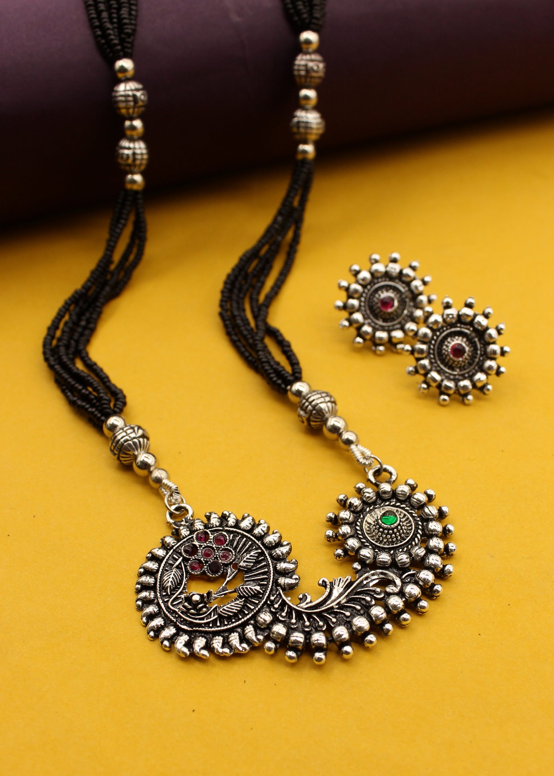 Sonchafa Jewellery presenting this oxidised finish appealing Mangalsutra for women who love to wear fancy mangalsutra. It is woven with pink, green stone and fashioned from oxidised finish metal. The pendant feature oxidised beads design and floral carving on metal surface. It is long lasting and skin-friendly as well.