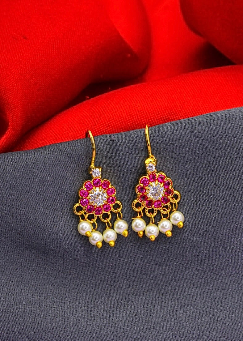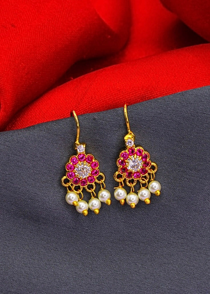 Checkout this pair of pink colour beautiful bugdi earrings from Sonchafa Jewellery which is best to team with traditional costume. They are embedded with pink, white stone and woven with pearl beads. These earrings are easy to wear as they are clip-on.