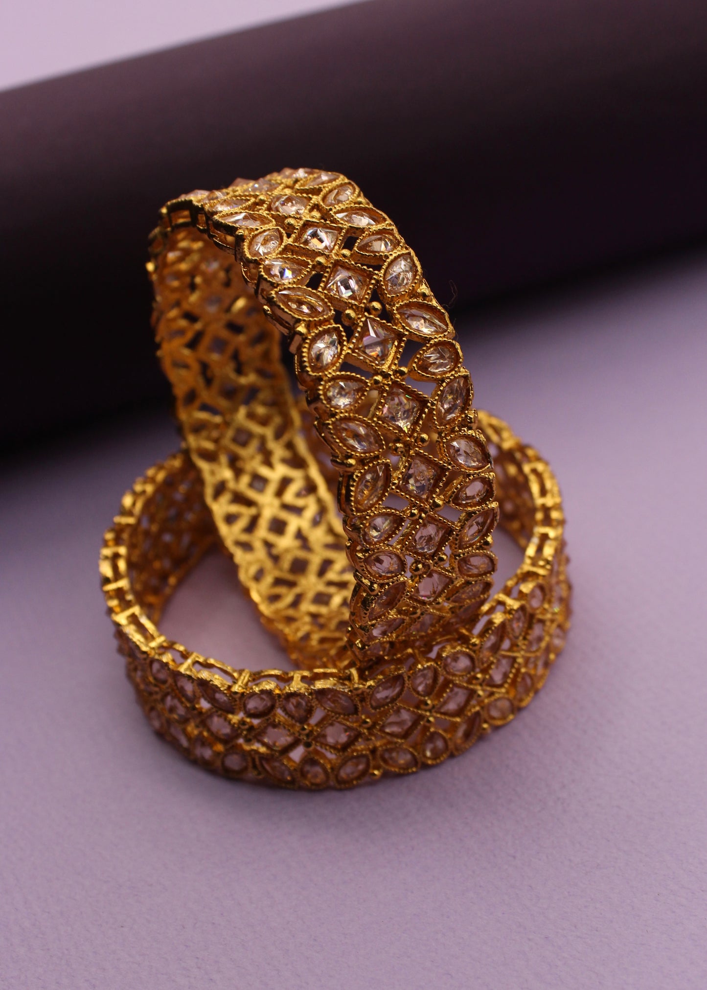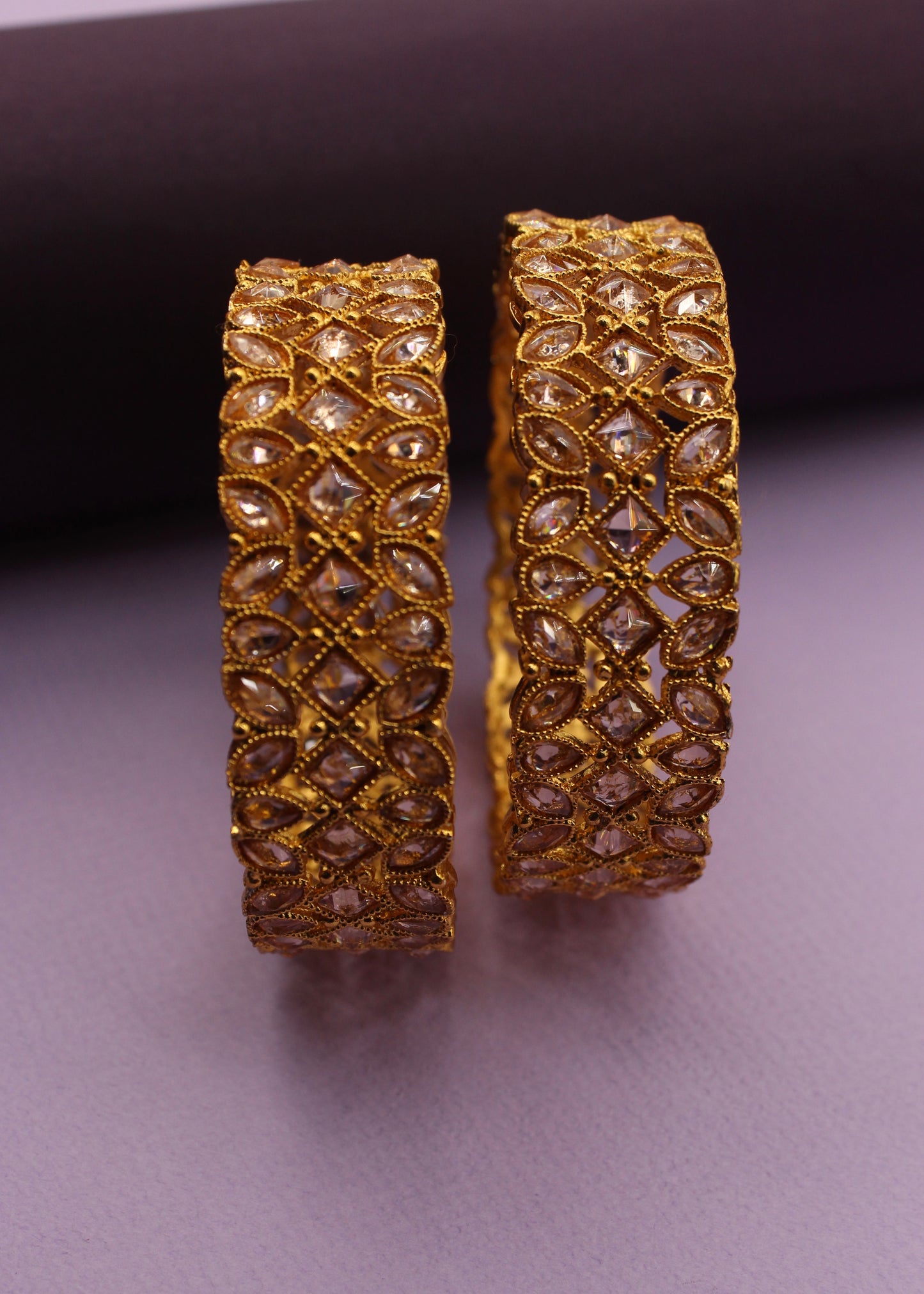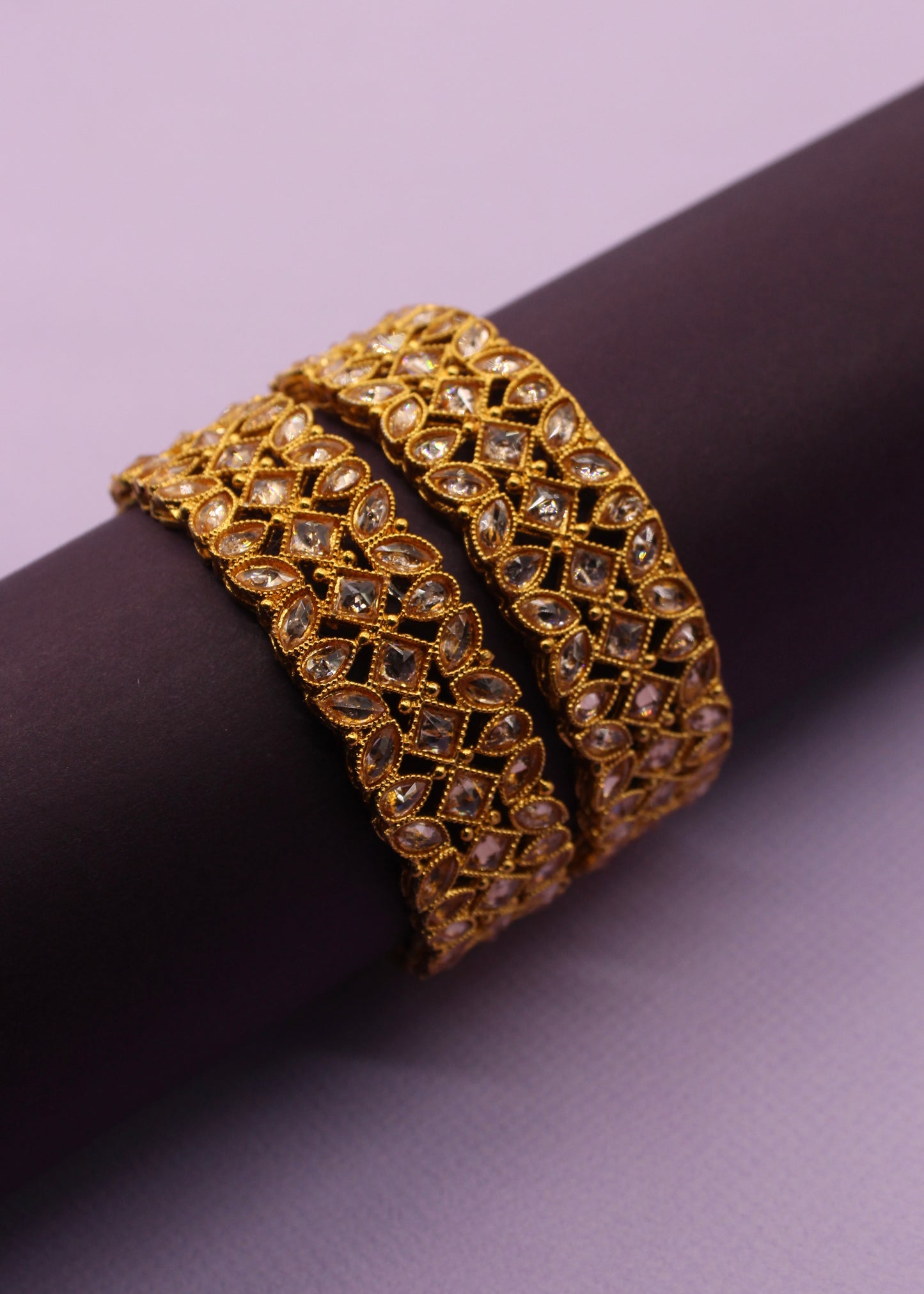 Add extra elegance to your appearance by adorning this set of golden colour beautiful bangles with your matching costumes. They are encrusted with shimmering stones. These appealing bangles are fashioned from antique gold finish metal and ensures high durability. These are skin-friendly and long lasting.