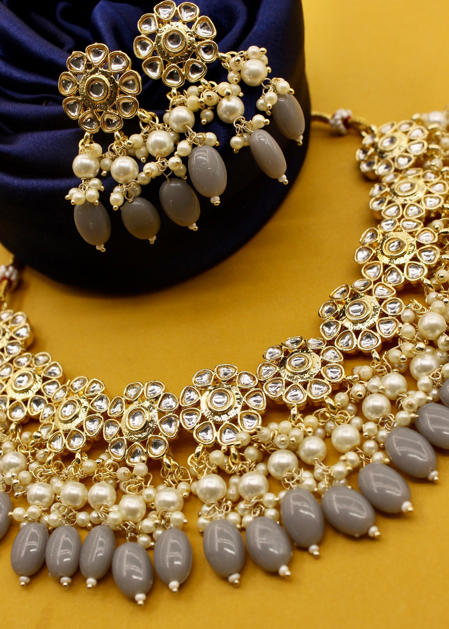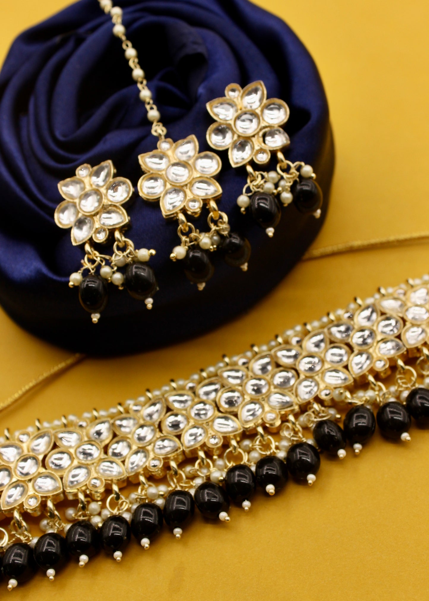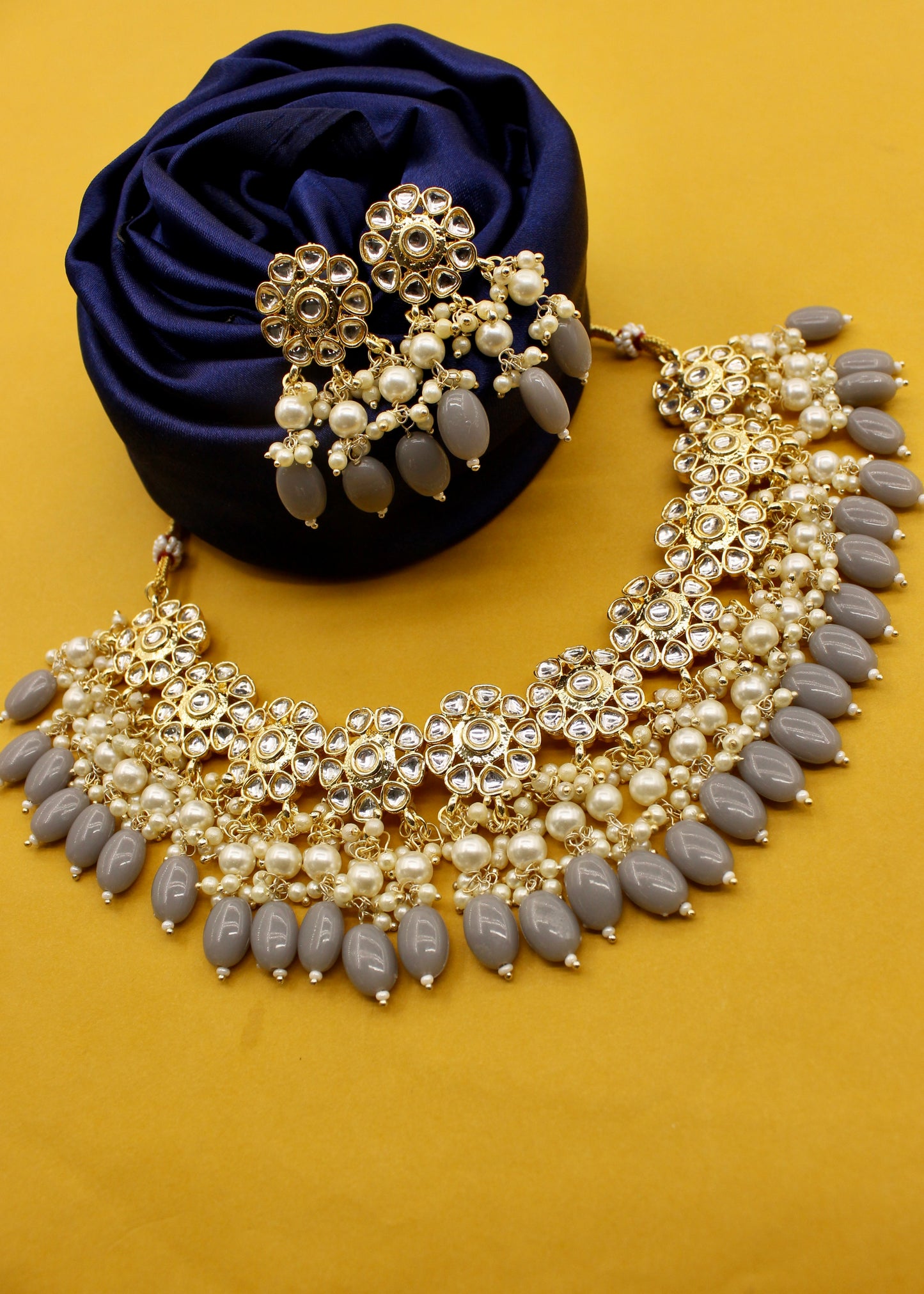 Golden finish kundan necklace set from Sonchafa Jewellery. This beautiful necklace studded with bright white kundan along with multi color stones and beads. Made from high quality golden finish metal. It will be your fashion companion for many years.