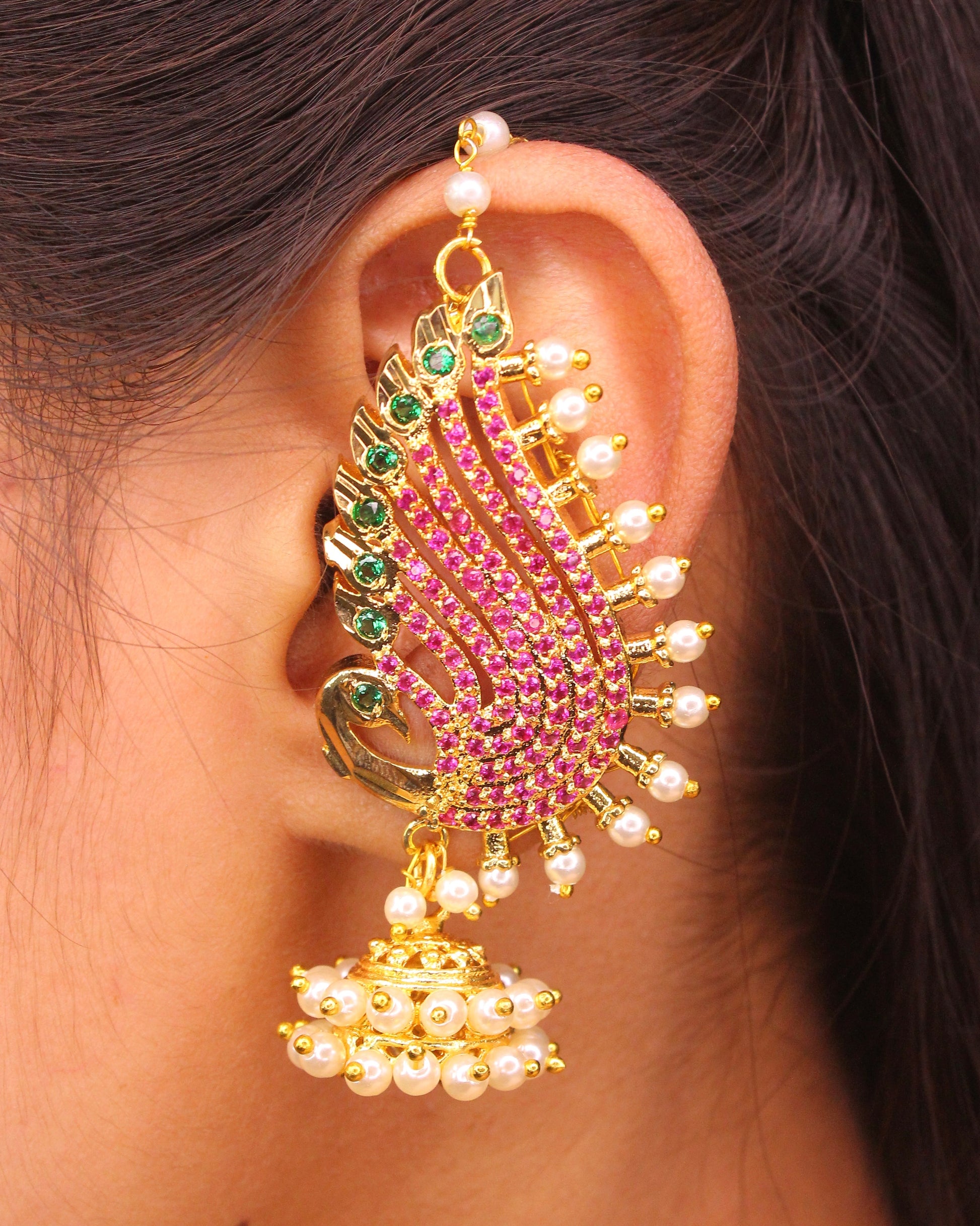 Adorn your earlobes with this pair of golden colour wonderful ear-cuffs with your festive costume. It is studded sparkling pink-green stone along with pearls beads and made from golden finish metal. This ear-cuffs is completed peacock look.