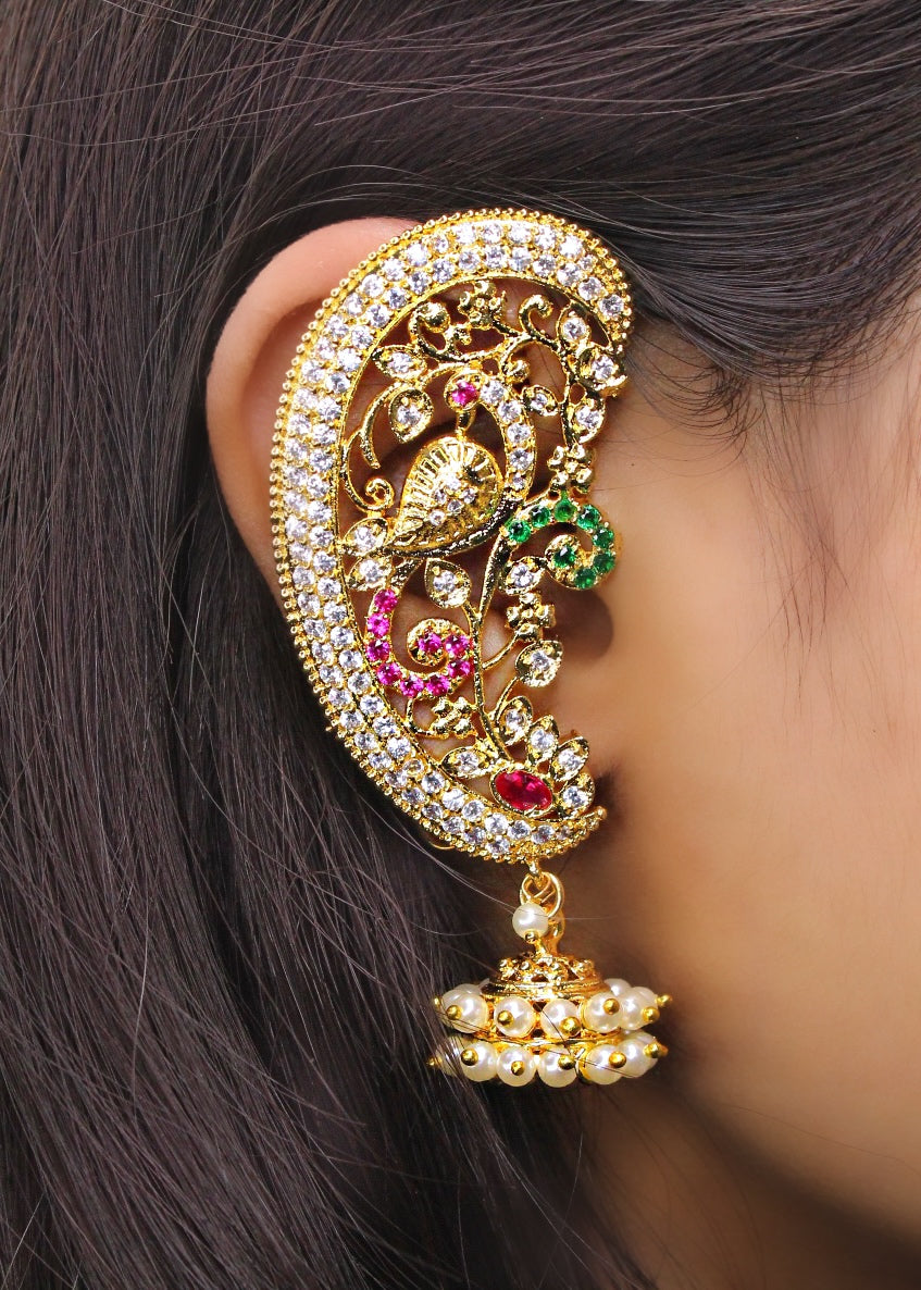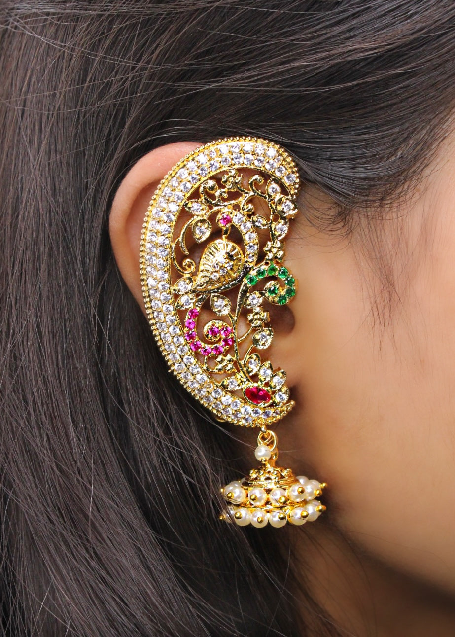 Get a distinct traditional look by clubbing these leaf design golden colored ear-cuffs from Sonchafa Jewellery. They are integrated with pink, white, green colored stones. Crafted from golden finish metal. These ear-cuffs are light in weight & skin-friendly.