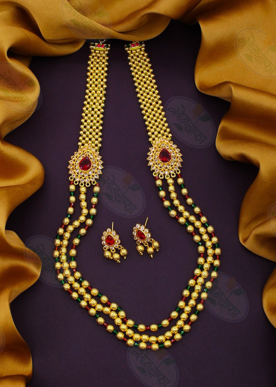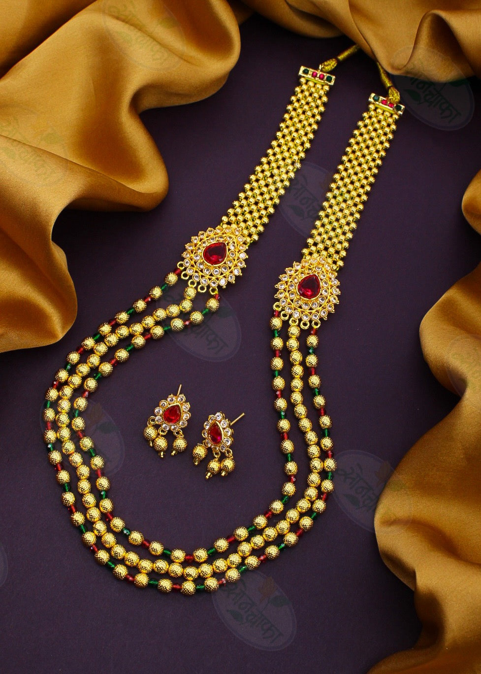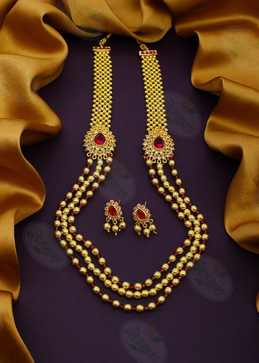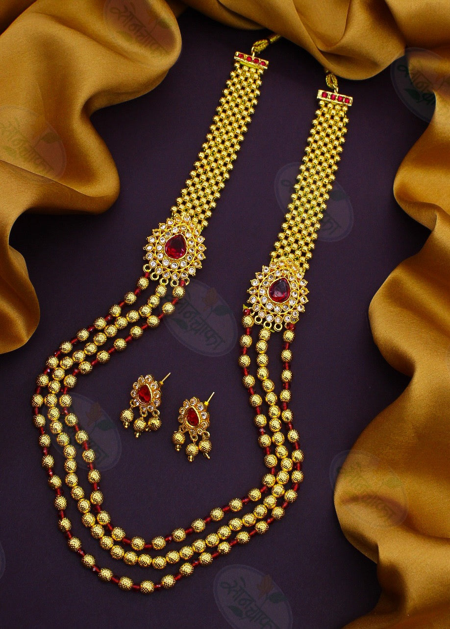 Malhar necklace defines the marital status of women and it is must have ornament for married women. It is styled with pink stones and golden beads necklace. This necklace is crafted from golden finish metal and is skin-friendly as well.