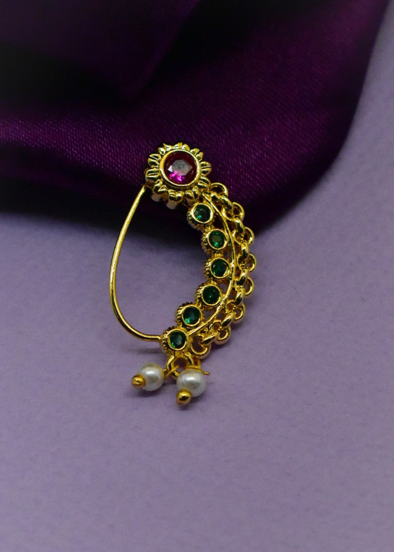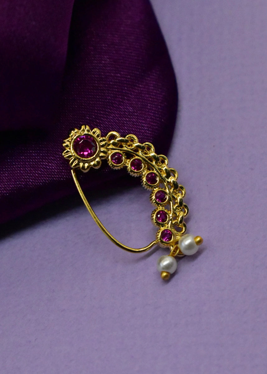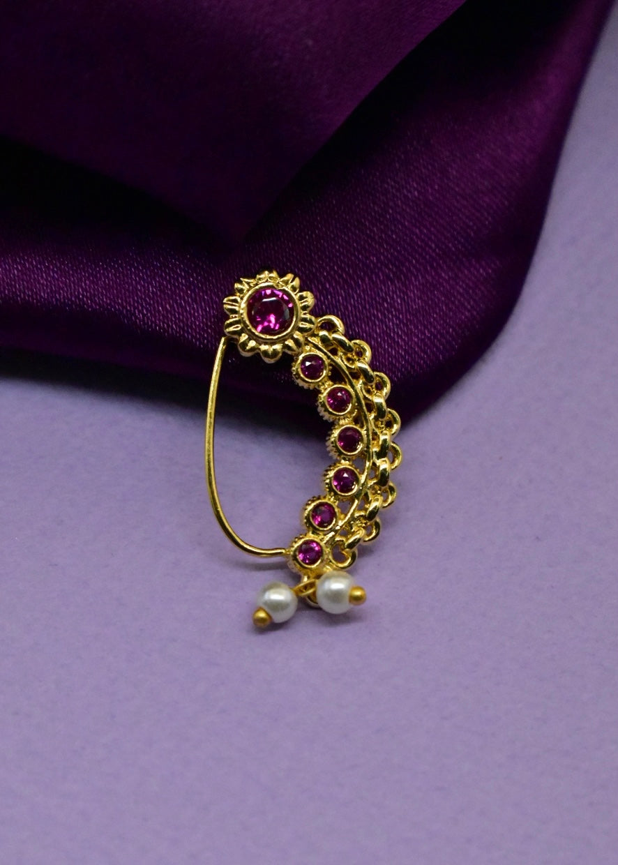 Make a unique addition to your jewellery drawer by adding this beautiful nath from Sonchafa Jewellery. It is embedded with sparkling pink-green stones and made from golden finished metal. It has pearl beads droplets for more attraction. This nath is long lasting and rust-resistant as well.