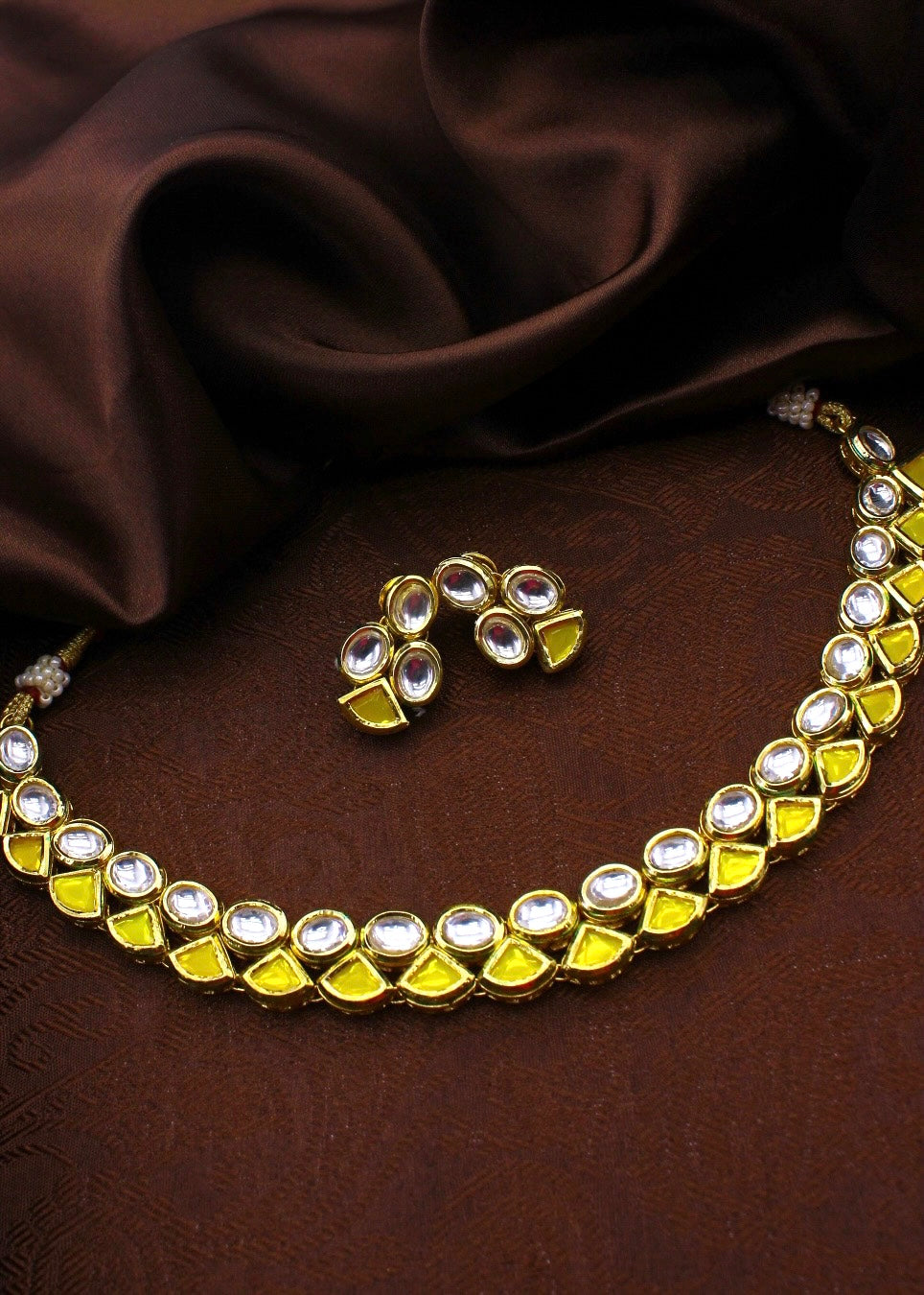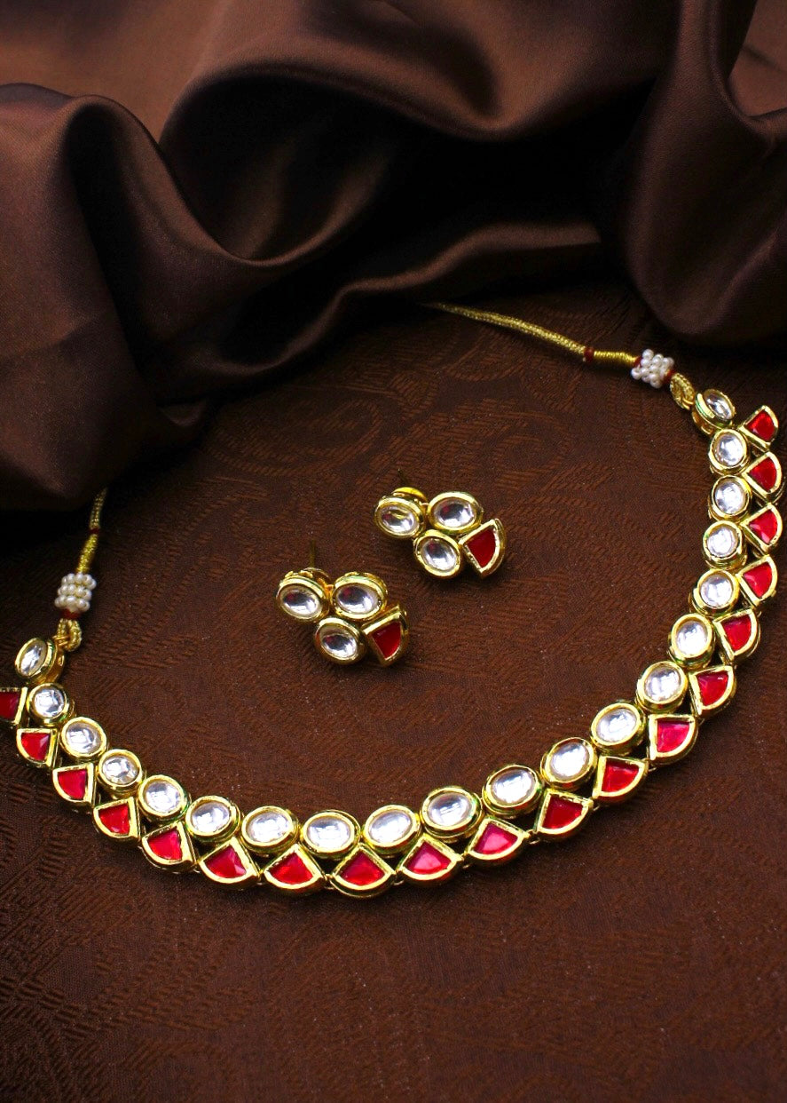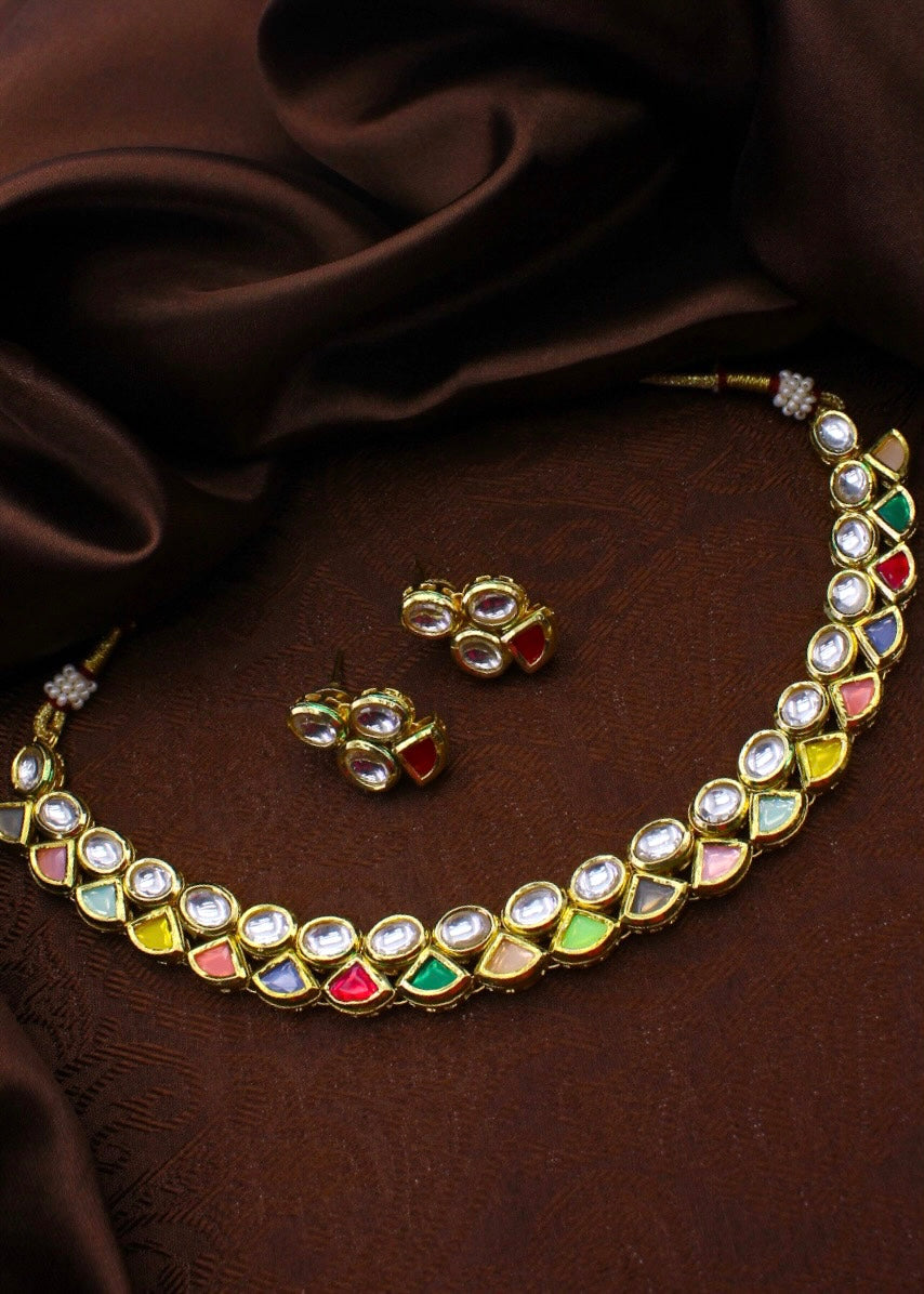 Adorn your neckline with this beautiful kundan necklace which is perfect blend of class and elegance. It is embedded with kundan stone along with kundan stone. They have droplets In addition the neck-piece of this necklace comes with adjustable dori, so that you can fit it properly.