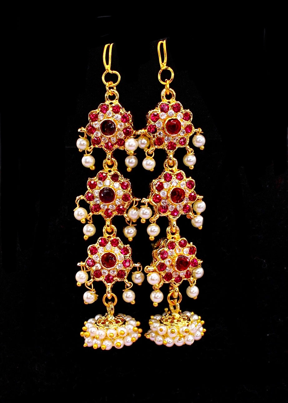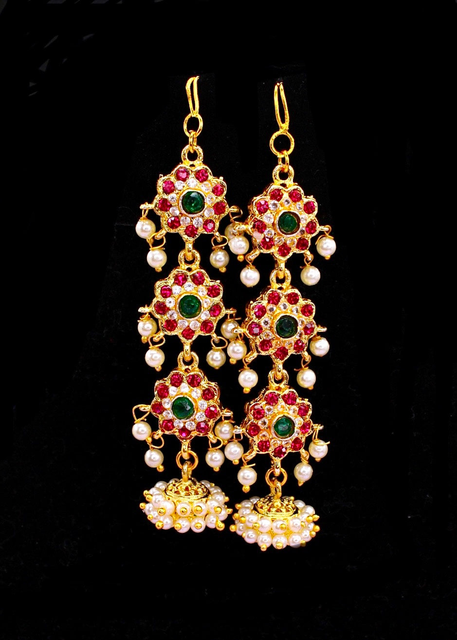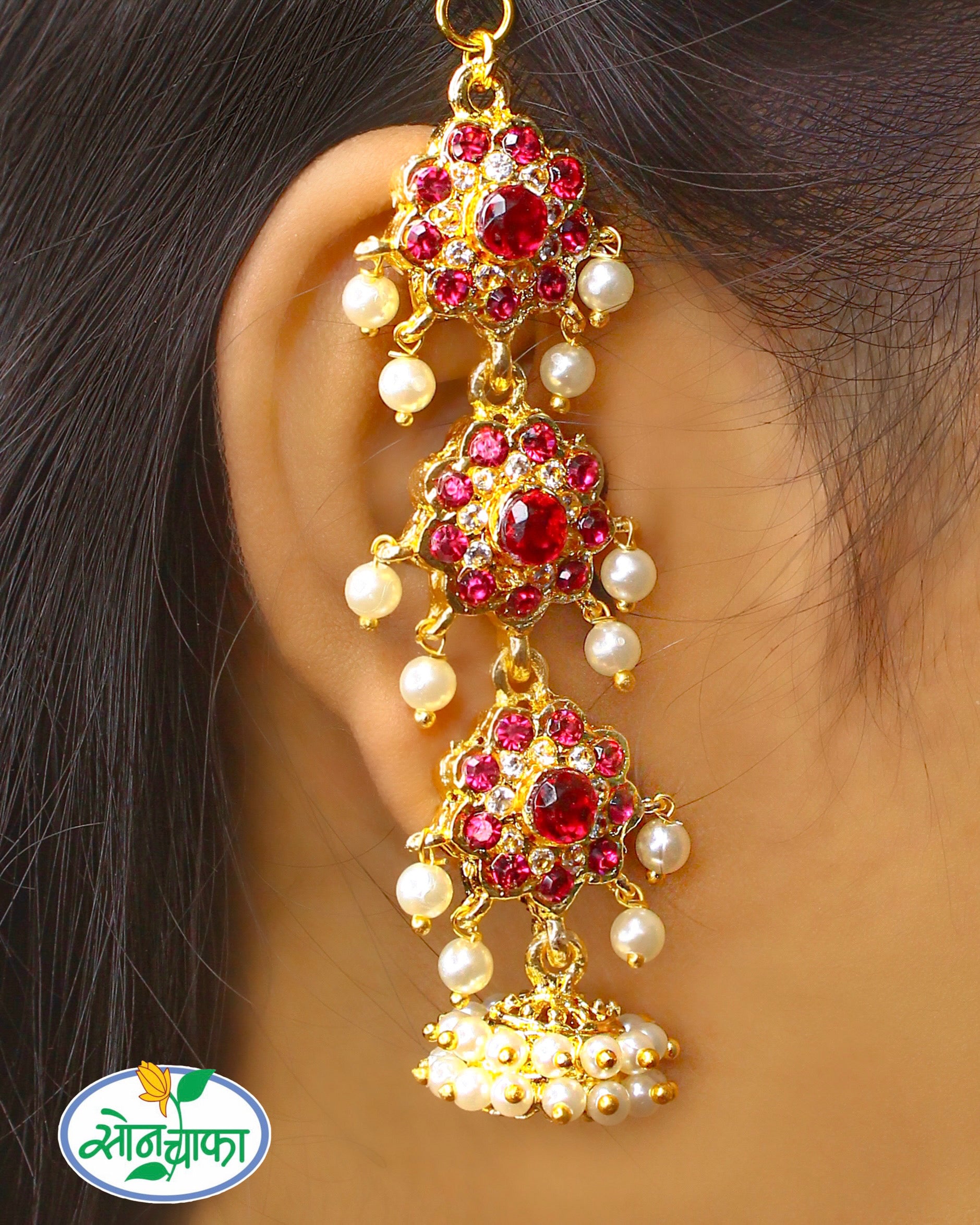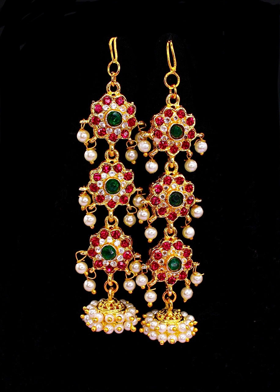 Complete your Maharashtrian look by adorning this pair of kanchain with your traditional saree. They are embedded with sparkling pink ,green colour stones and woven with good quality pearl beads. These beautiful kanchain are made from golden finish metal and ensure high durability