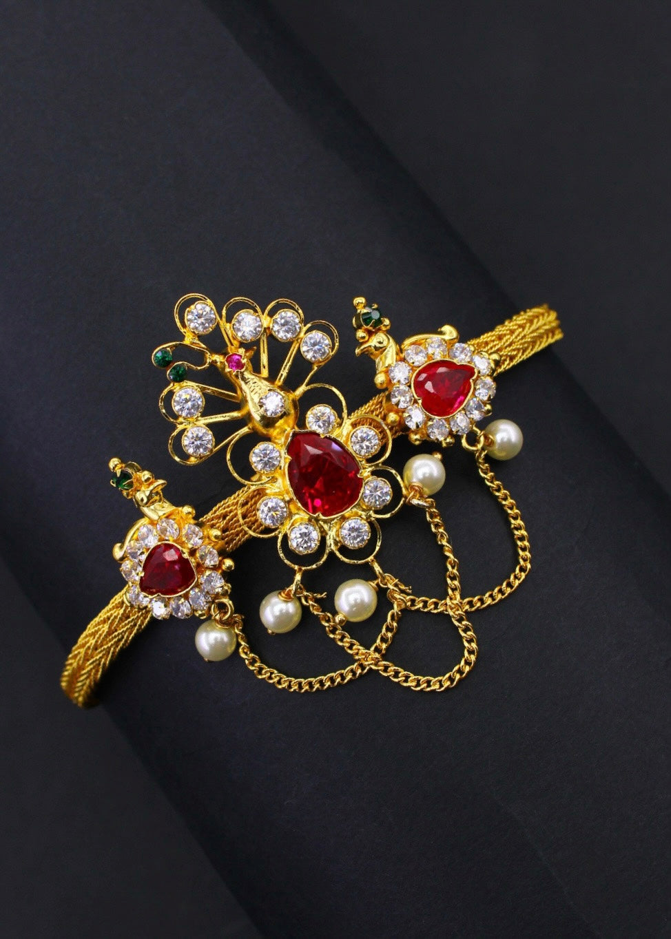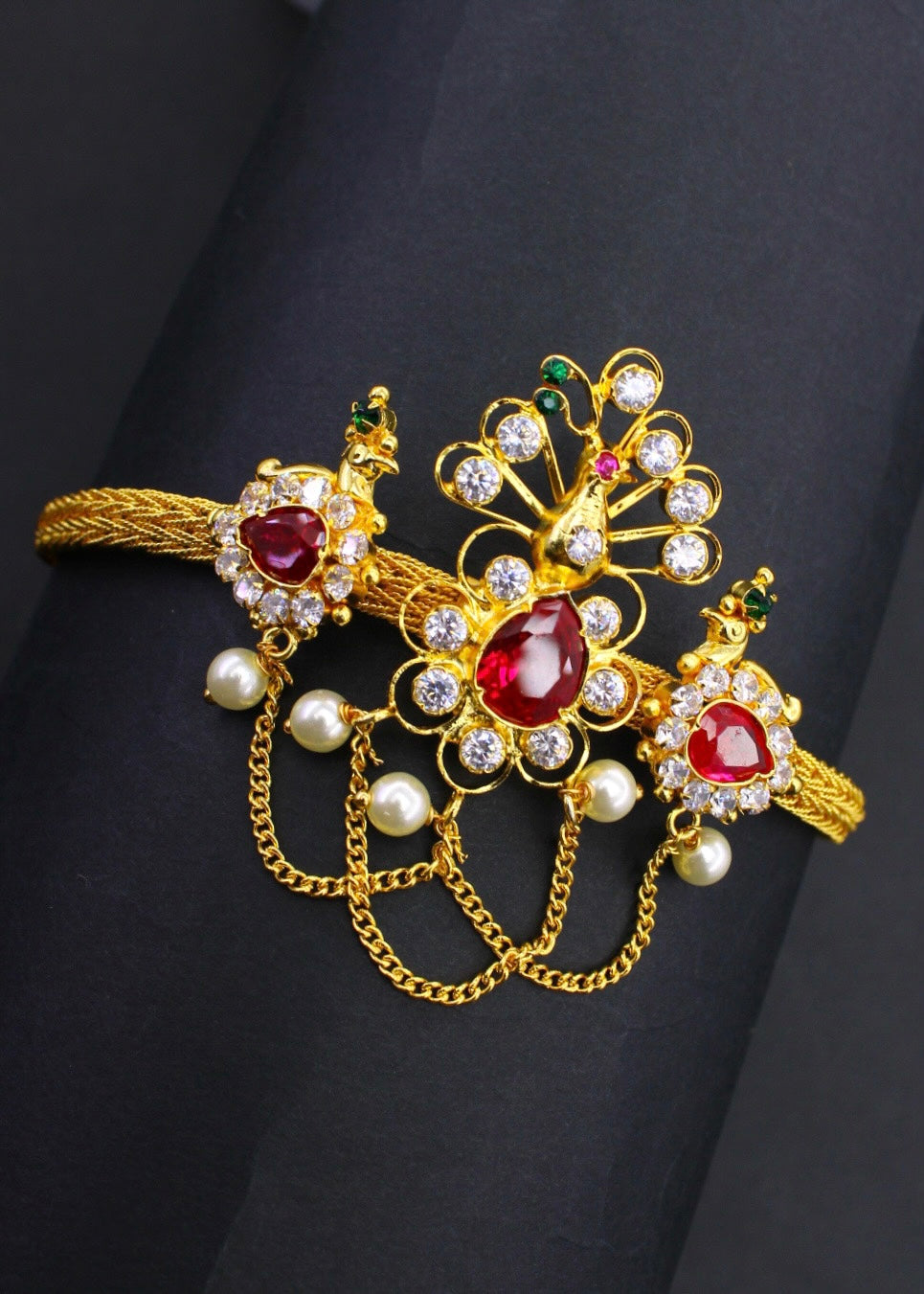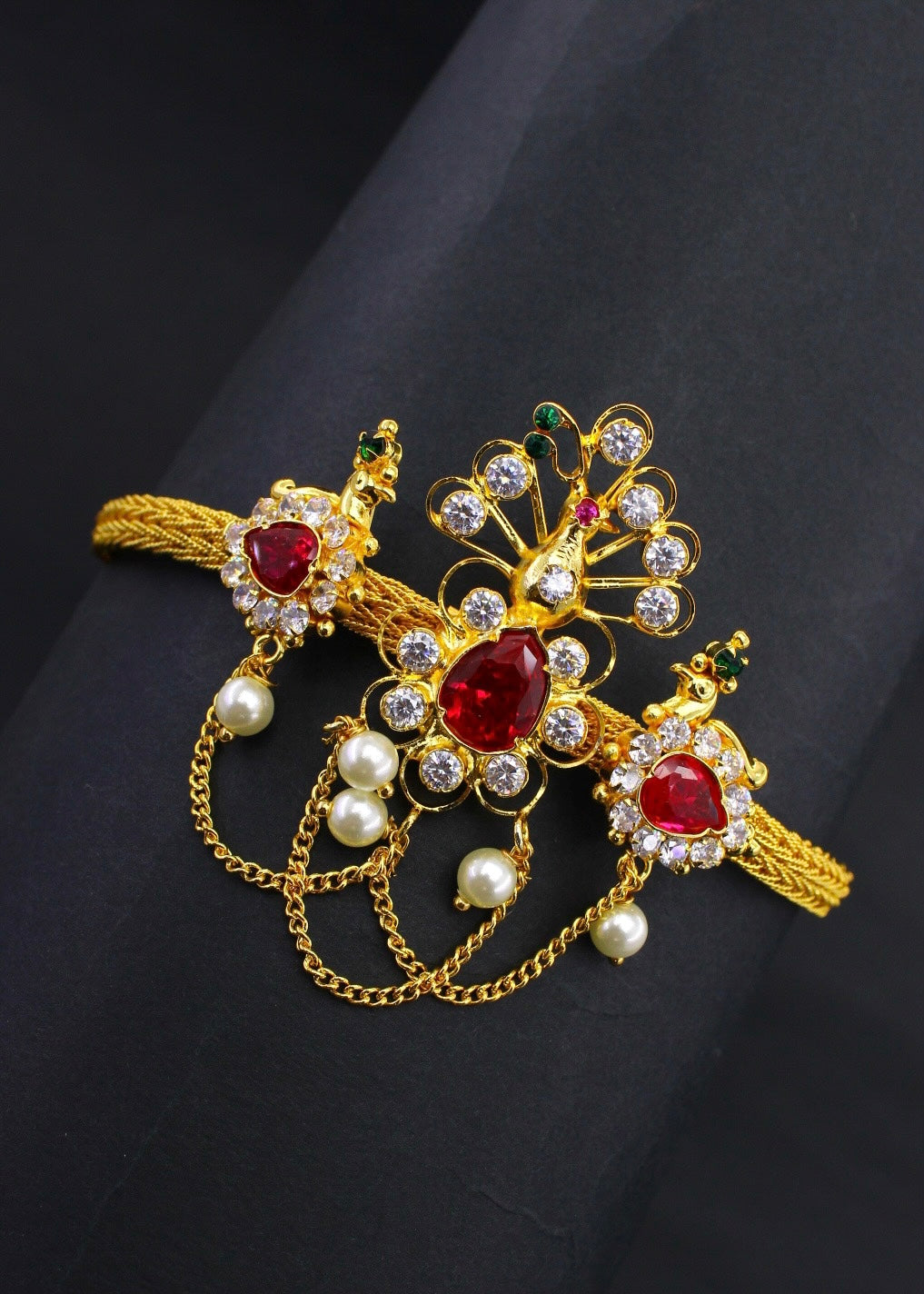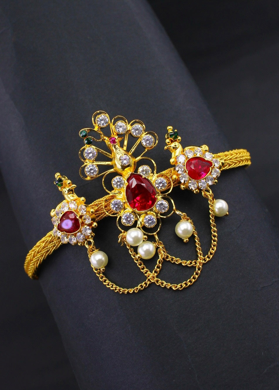 Get that perfect traditional look by clubbing this pink colour droplet shape appealing waki with your traditional costume. It is studded with pink - white stones and made from golden finish metal. In addition this waki has pearl bead droplet for added attraction. It is easy to wear and comfortable to hold throughout the day.