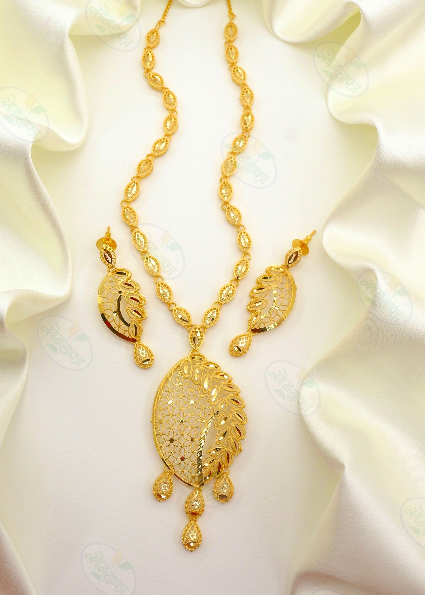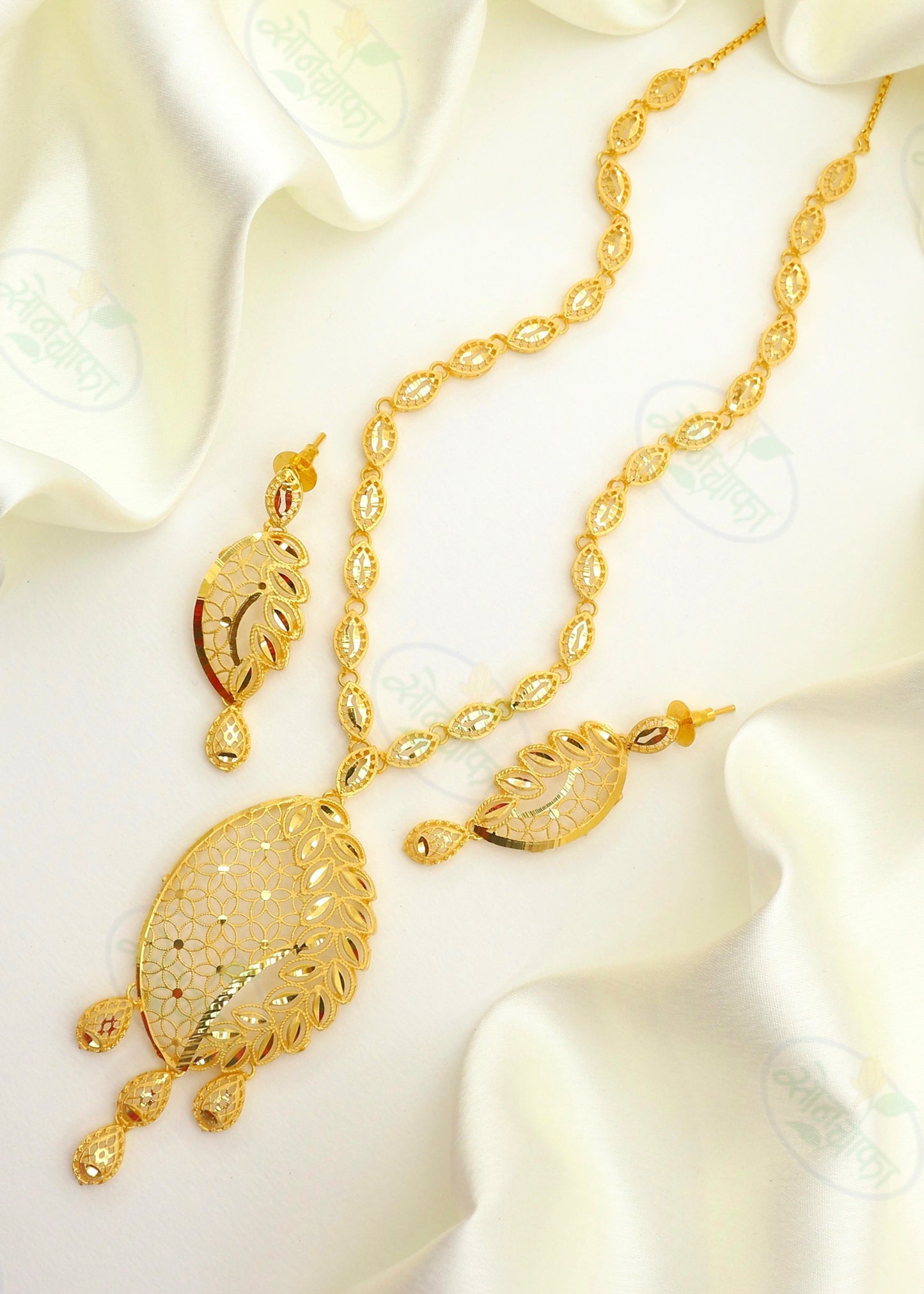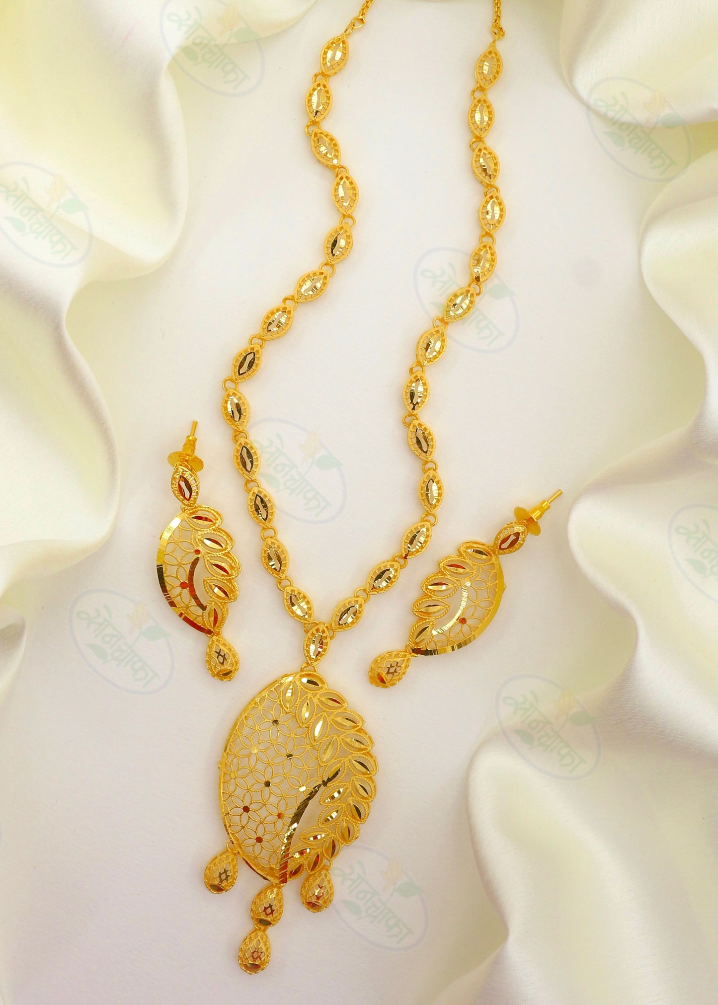 Sonchaf Jewellery offers this 1 gram golden finish beautiful Traditional long necklace set to complement your traditional apparel. This pretty set is good in quality & rust-resistant as well so order now.