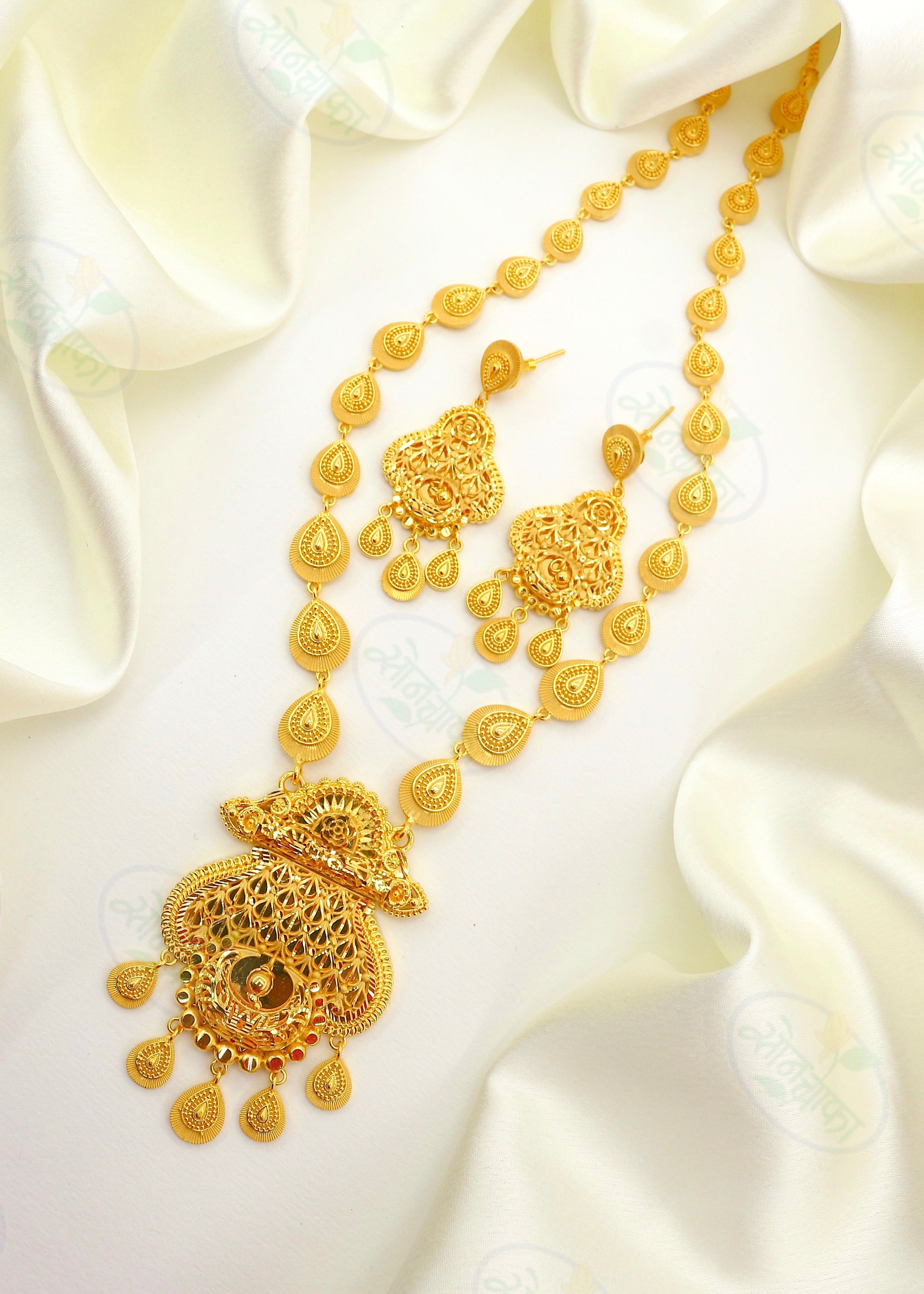 Wonderful flower inspired necklace set from Sonchafa Jewellery is something which will make you look outstanding. It is embedded with golden beads and made from 1 gram gold plated metal. This wonderful necklace has golden beads droplets for added attraction. It is superior in quality and will be your fashion companion for many years.