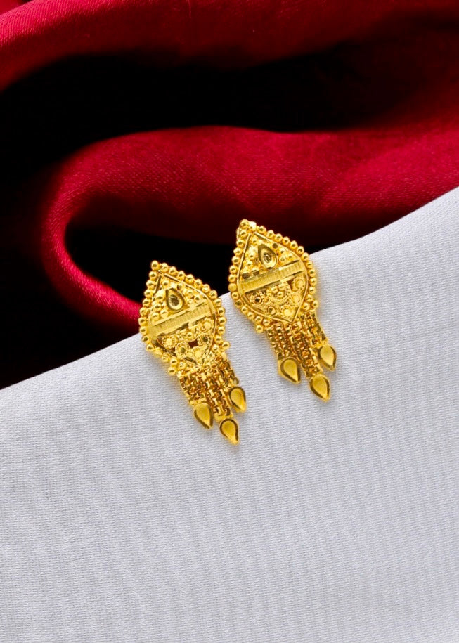 Beautifully designed this pair of 1 gram gold plated adorable earrings from sonchafa jewellery .This pair of Leaf studs are crafted from highly durable golden finish metal and are skin-friendly as well. These earrings are decked with small golden droplets at the bottom.