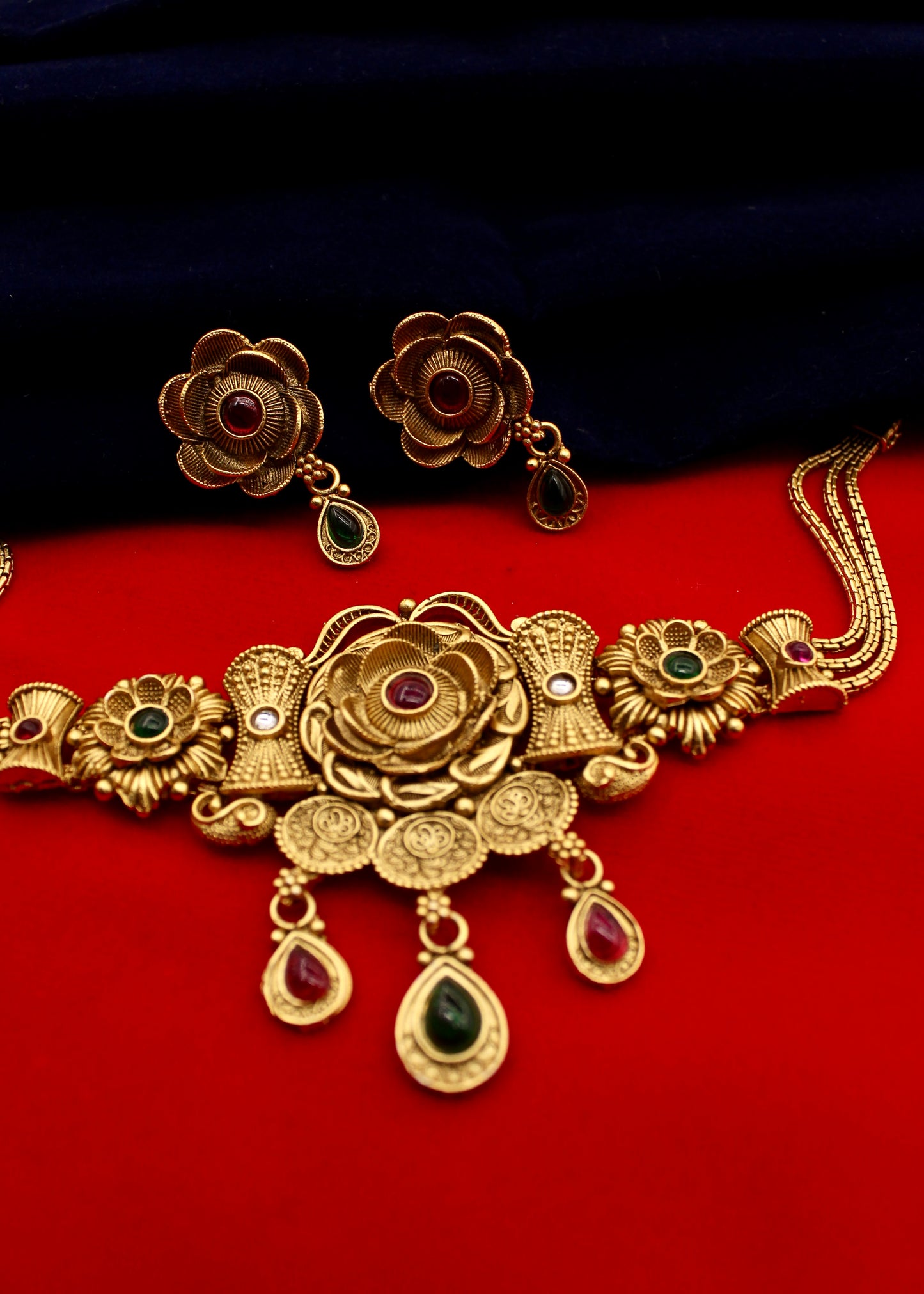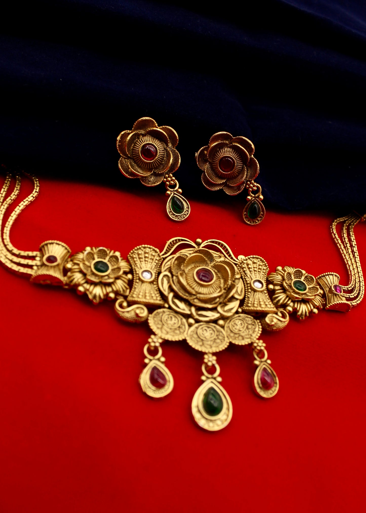 Add extra elegance to your persona by clubbing this Rajwadi choker necklace set with your traditional costume. It is studded with shiny pink, green stones, white kundan and made from antique golden finish metal. It is superior in quality and will be your fashion companion for many years.